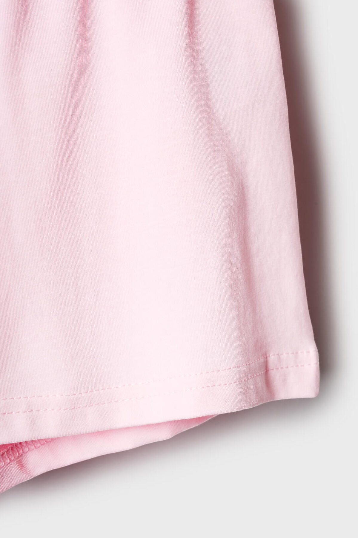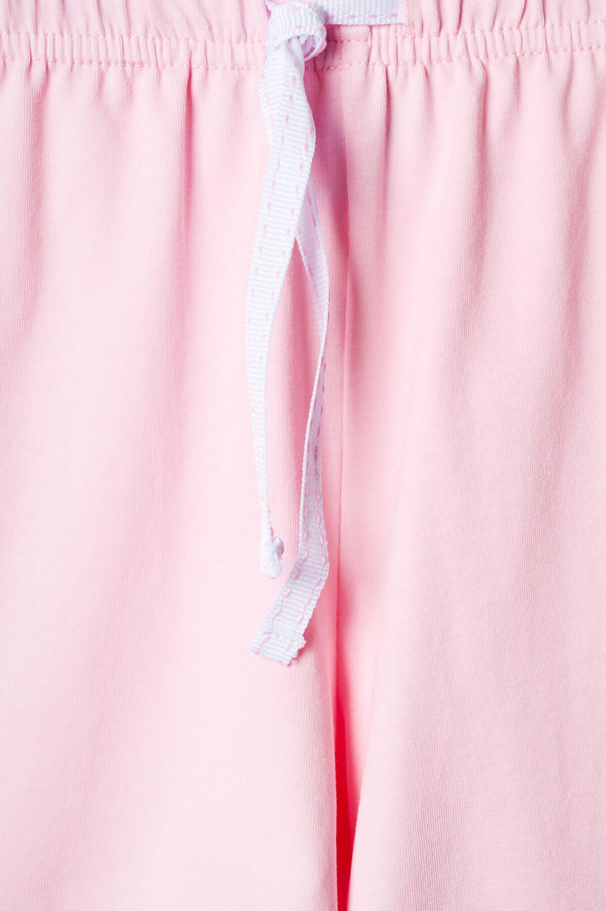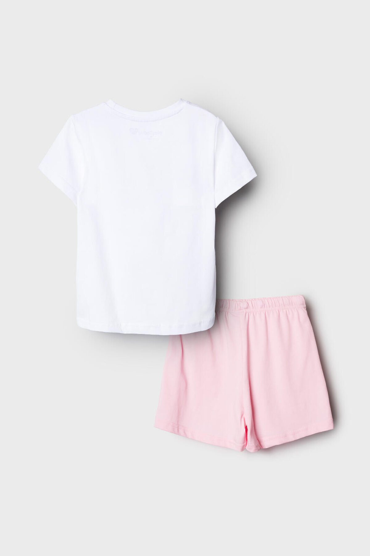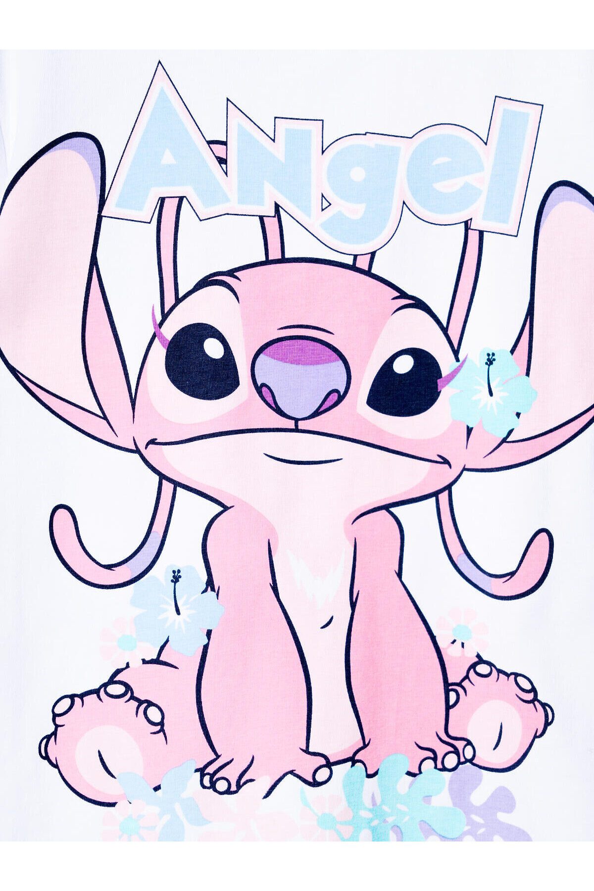 Детская пижама для девочки. Комплект состоит из белой футболки, прямого кроя с короткими рукавами и светло-розовых шорт. На футболке — крупный цветной принт с изображением Лило и Стич. Шорты на резинке, дополнены декоративным шнурком на поясе. Материал — легкий, хлопковый трикотаж, приятный для тела.