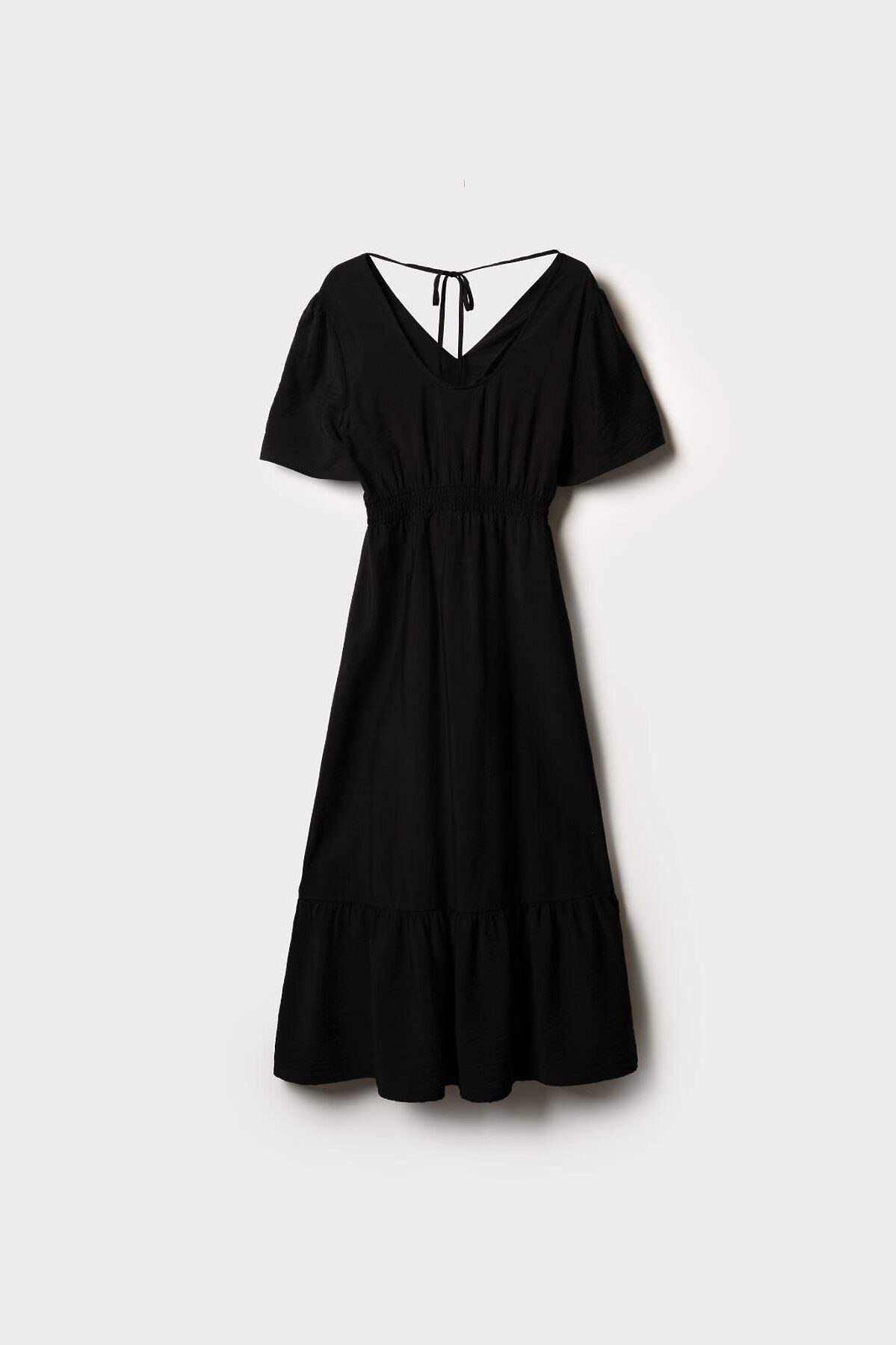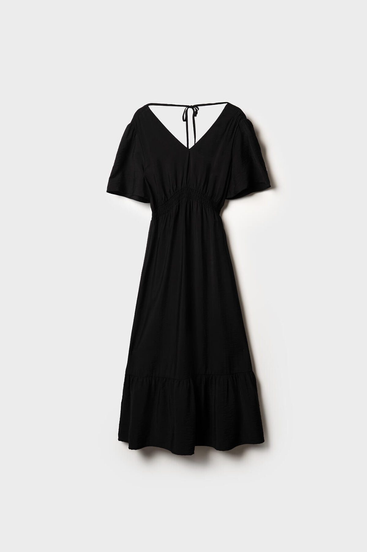 Женское летнее платье миди. Материал — лёгкая вискозная ткань. V-образный вырез спереди и сзади, на спинке предусмотрена декоративная завязка. В талии вшита внутренняя резинка, что обеспечивает комфортную посадку. По низу изделия расположен широкий волан, придающий образу лёгкость и женственность.