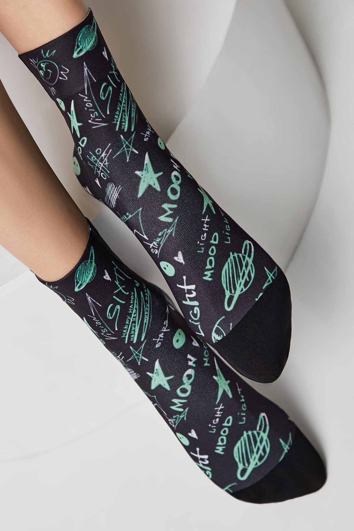 Плотные носки с особенно устойчивым рисунком, нанесенным с помощью термотрансферной печати, станут стильным и индивидуальным акцентом в повседневных образах. Термотрансферная печать - процесс, при котором специальная краска на бумажном носителе резко нагревается, переходит из твердого состояния в газообразное и переносится с бумаги на носки, глубоко проникая в волокна и создавая устойчивое изображение. · 70 den· плотные и эластичные· рисунок, нанесенный с помощью термотрасферной печати· использование черной полиамидной нити для контрастности рисунка· мысок выделен черной полиамидной нитью· эффект 3D· c бортом· без пятки· стиль начинается с индивидуальности.