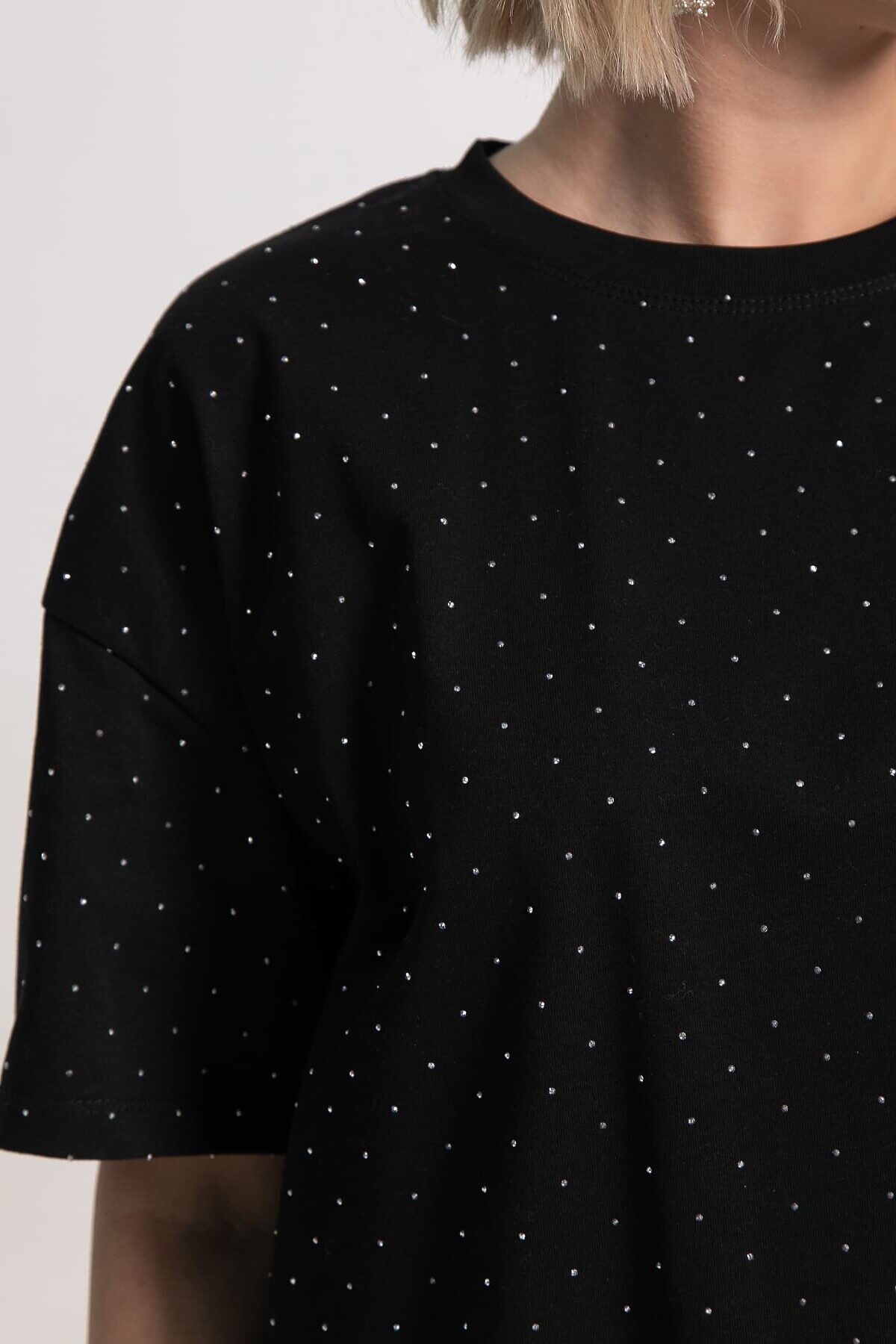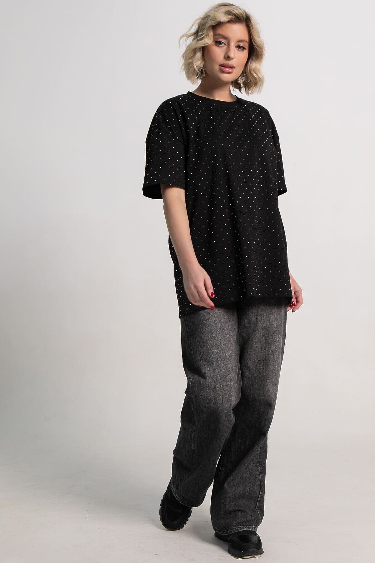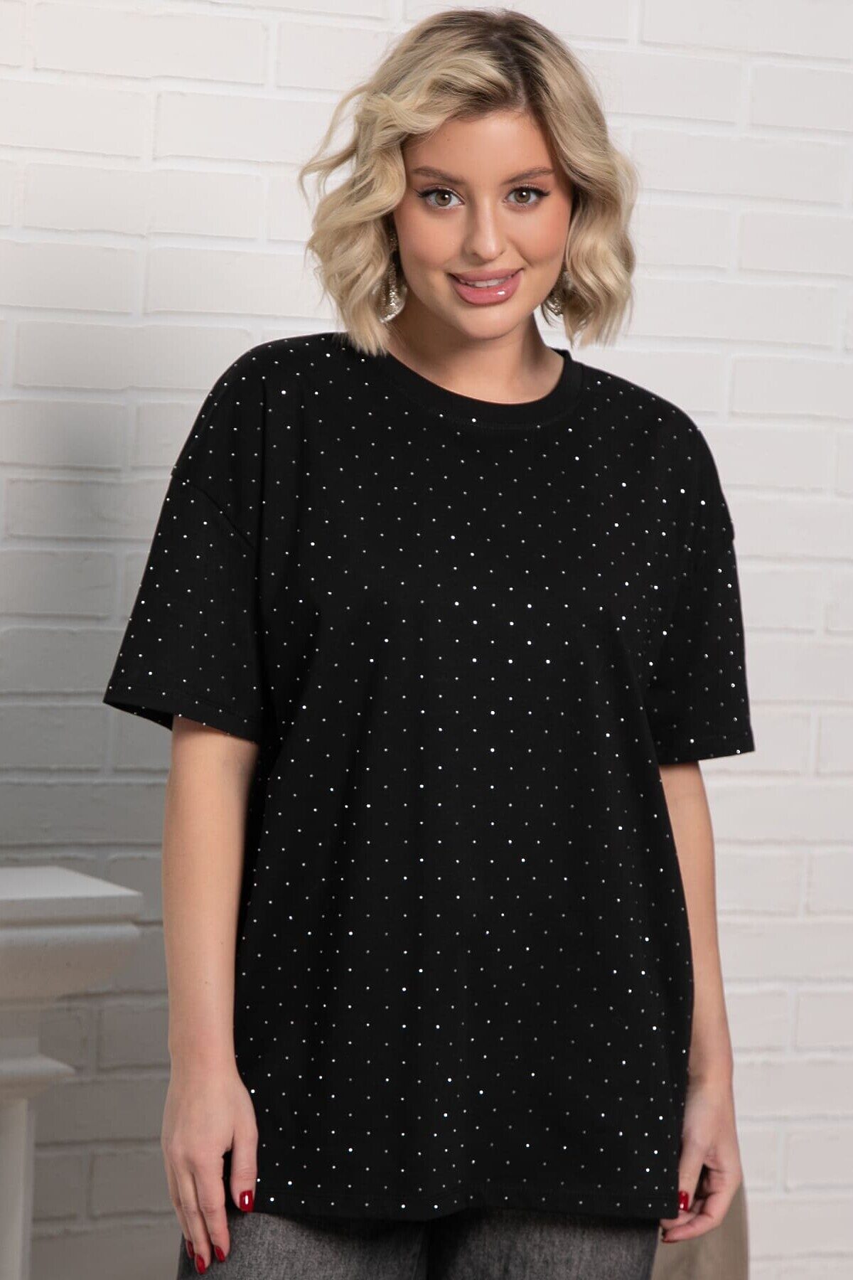 Однотонная женская футболка из трикотажа прекрасно подходит для создания стильных повседневных образов. Стразы придают ей неповторимый блеск и делают образ уникальным. Свободный крой оверсайз обеспечивает удобство и свободу движений, создавая расслабленный и современный вид. Эта футболка станет незаменимым и стильным элементом вашего гардероба, подходящим для различных ситуаций.