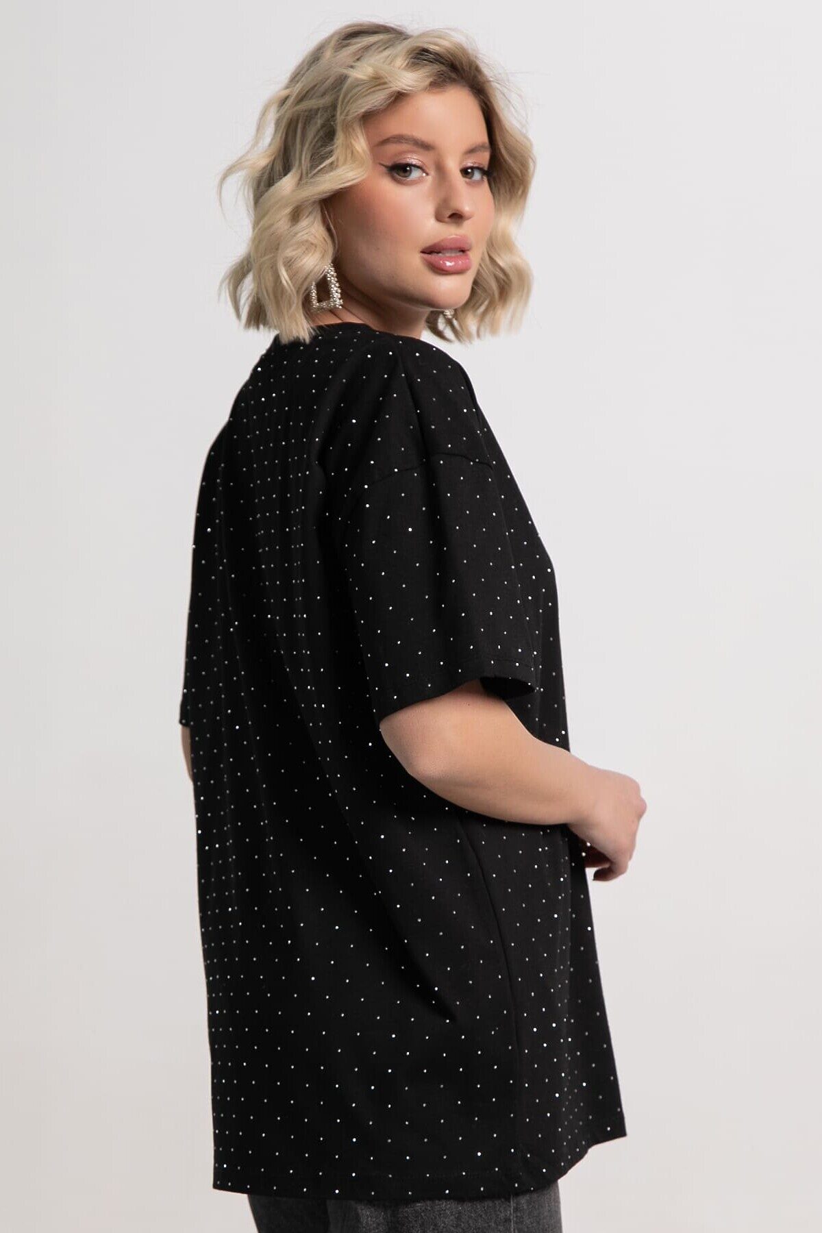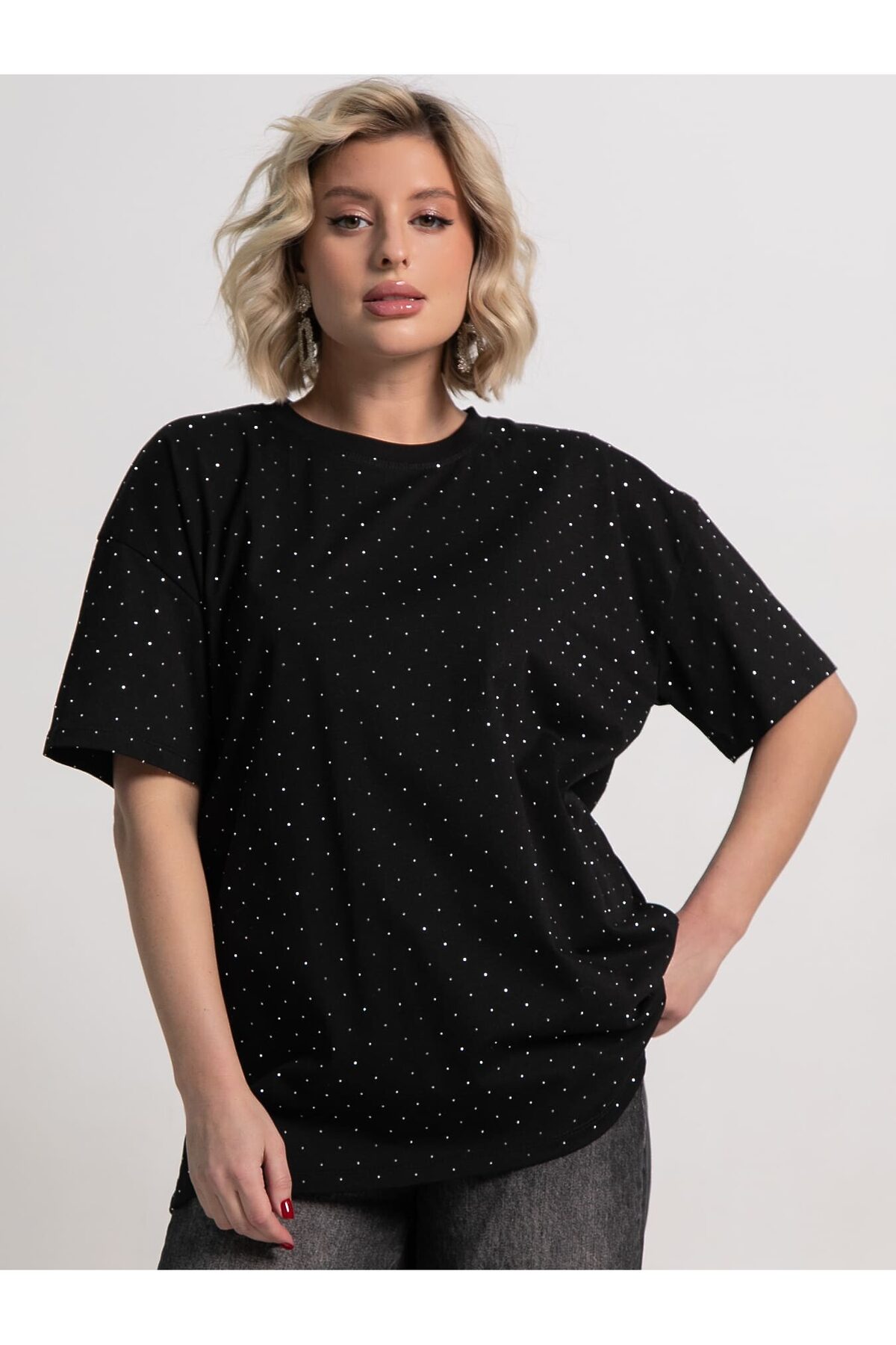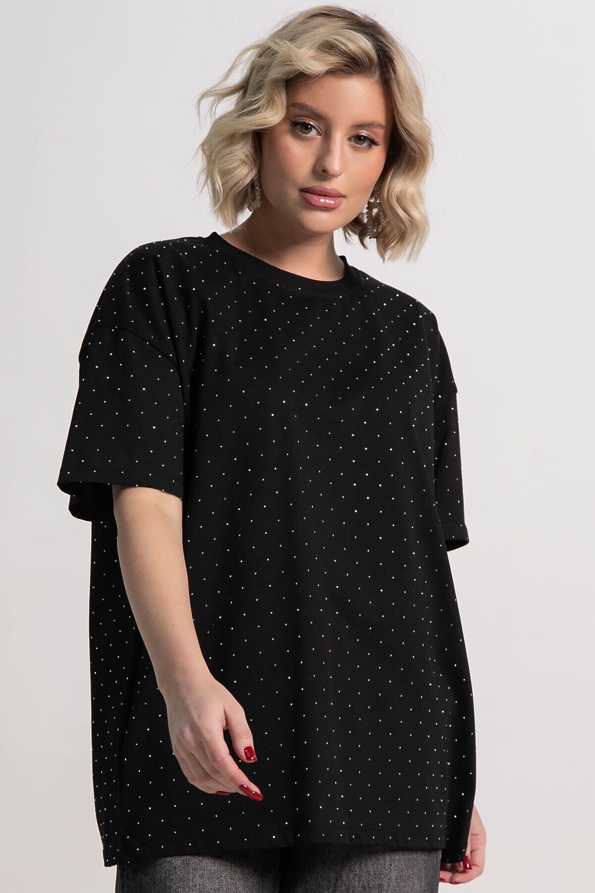 Однотонная женская футболка из трикотажа прекрасно подходит для создания стильных повседневных образов. Стразы придают ей неповторимый блеск и делают образ уникальным. Свободный крой оверсайз обеспечивает удобство и свободу движений, создавая расслабленный и современный вид. Эта футболка станет незаменимым и стильным элементом вашего гардероба, подходящим для различных ситуаций.