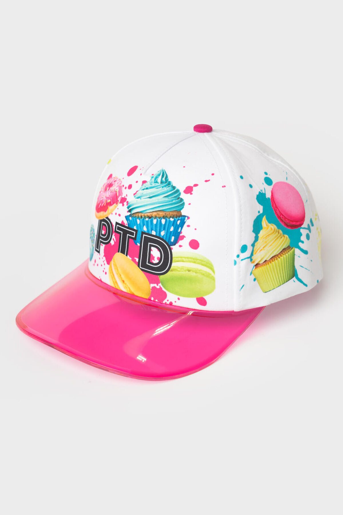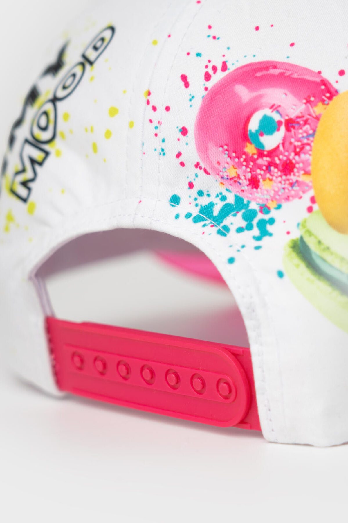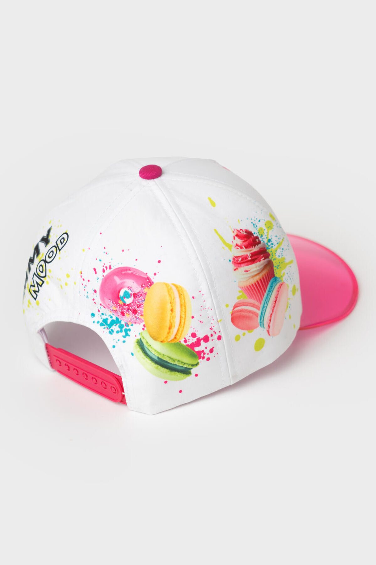 Яркая детская бейсболка для девочки. Выполнена из текстильного материала с цветным принтом. Украшена изображениями сладостей — пончиков, капкейков и макарунов. Спереди — надпись, сзади — слоган. Бейсболка имеет изогнутый козырек розового цвета и регулируемую пластиковую застежку на кнопки.