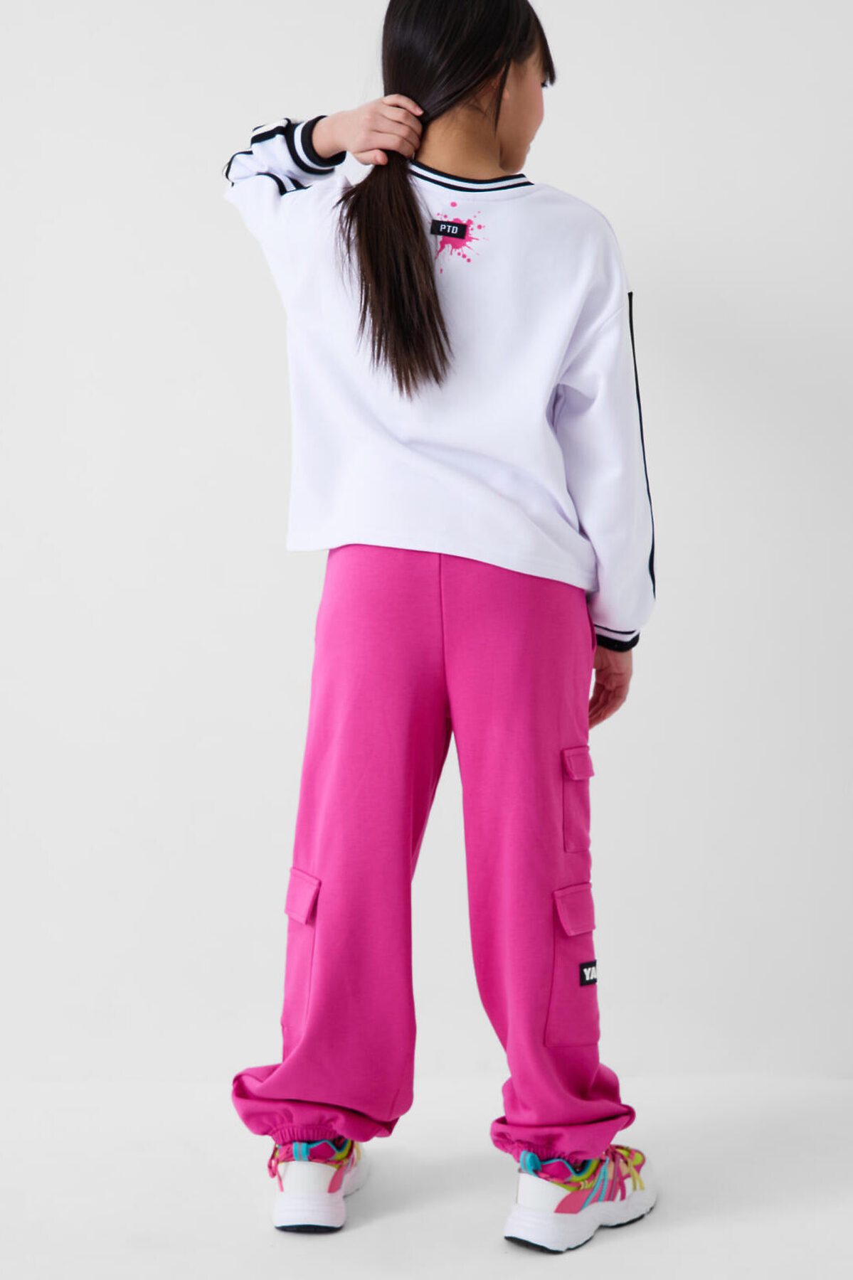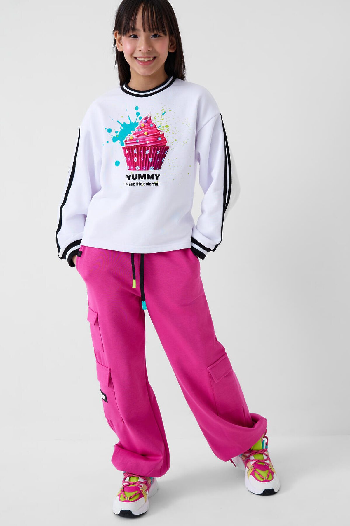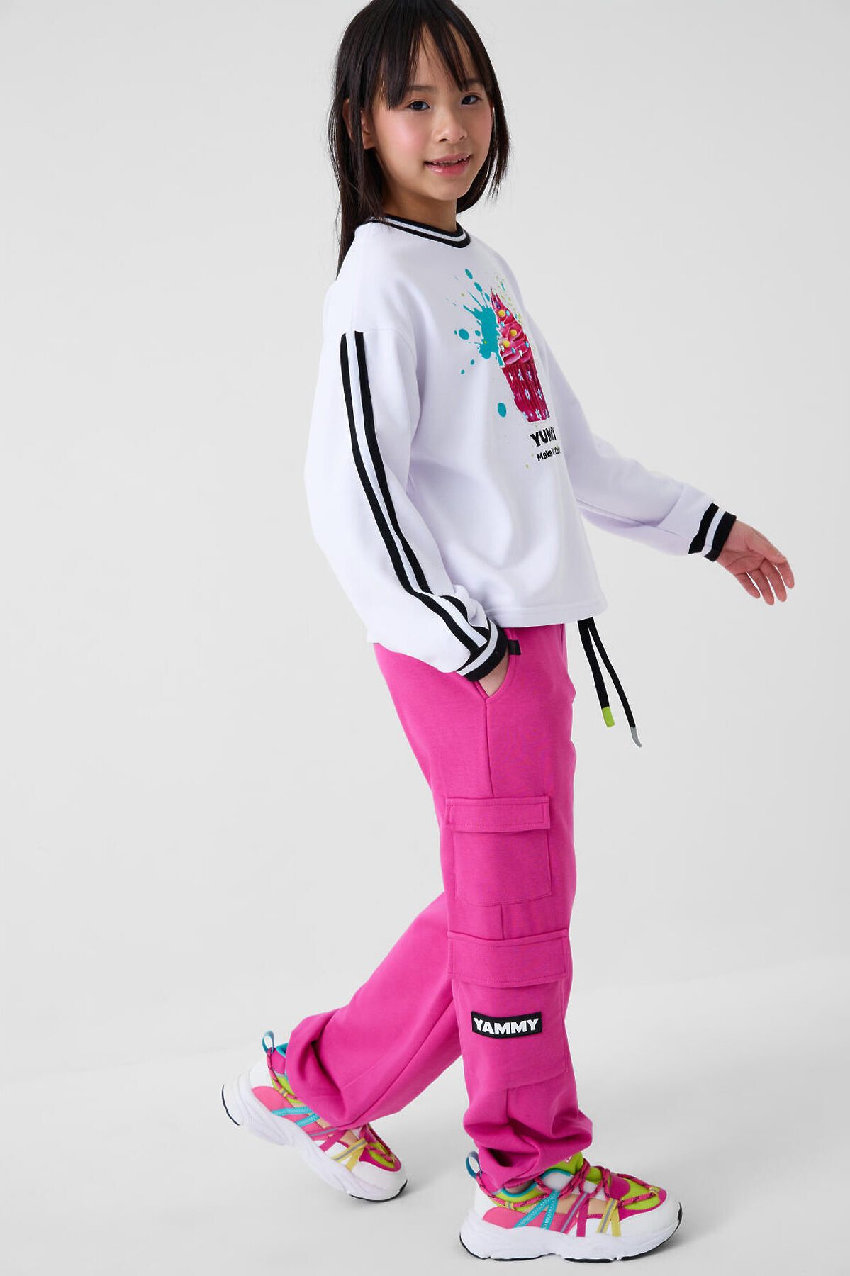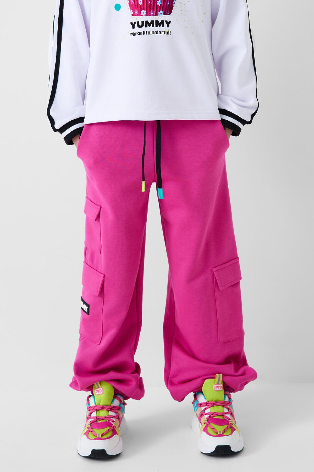 Брюки спортивные для девочки подростка. Выполнены из хлопкового трикотажа футер без начеса. Модель свободного кроя со средней посадкой на талии. Пояс на резинке, дополнительно регулируется шнурком. Удобные боковые карманы и карманы-карго. В нижней части брючин предусмотрены эластичные трикотажные манжеты для лучшей посадки.
