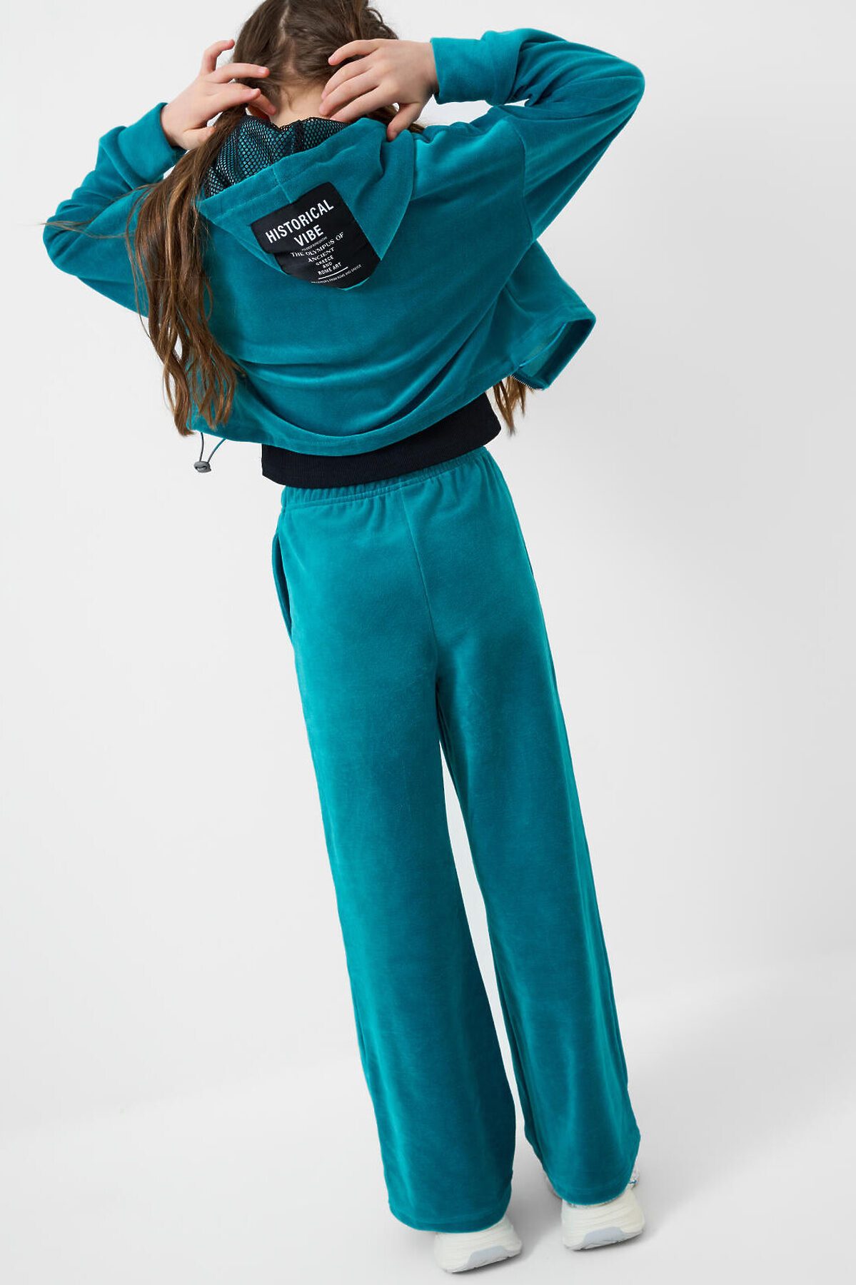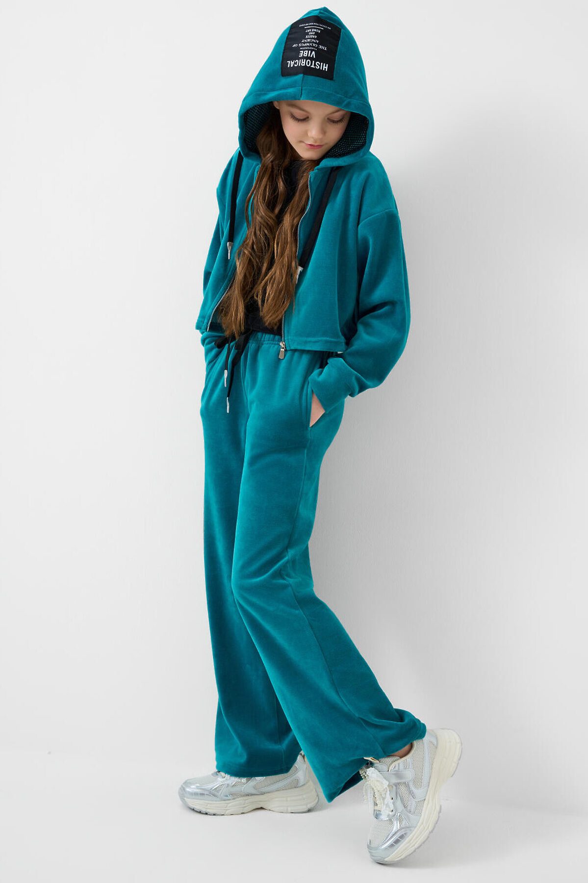 Спортивный велюровый костюм для девочки подростка. Комплект состоит из толстовки на молнии и широких брюк на резинке. Укороченная толстовка оверсайз. Низ изделия с утяжкой стопперами для регулировки посадки. Брюки палаццо — комфортные, с эластичным поясом и шнуром для регулировки посадки. Удобные боковые карманы.