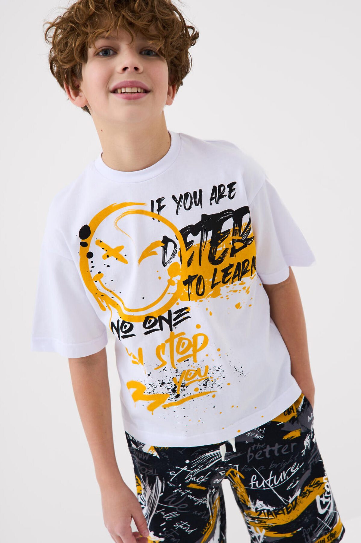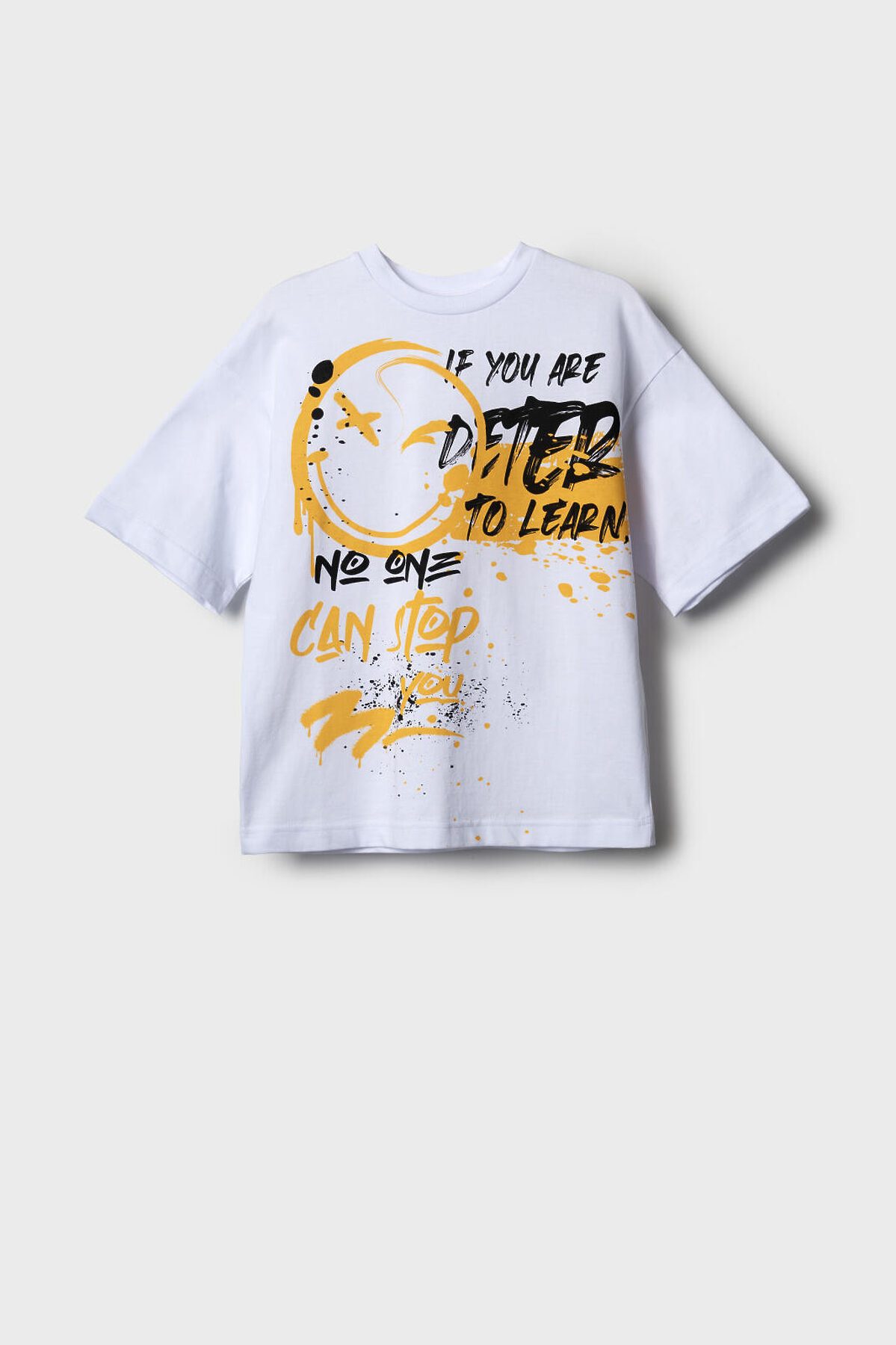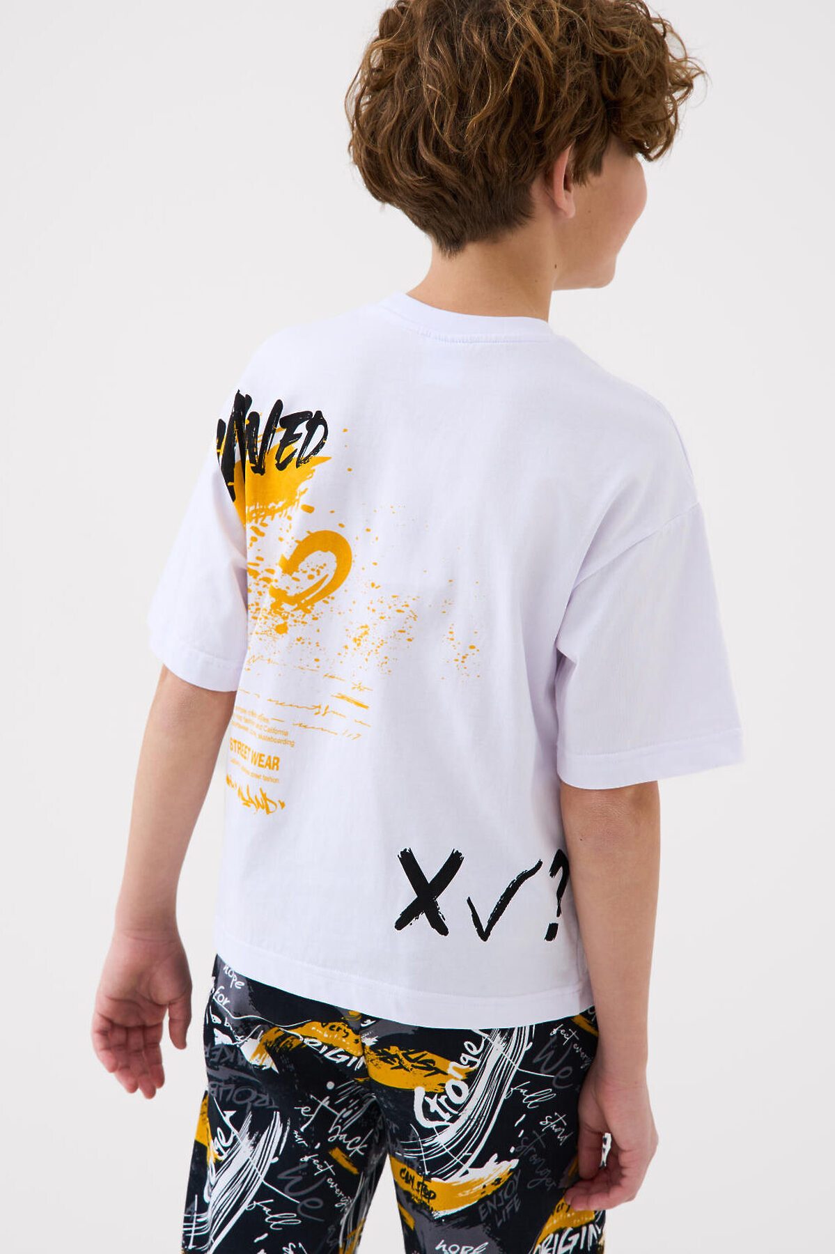 Футболка оверсайз для мальчика подростка. Модель выполнена из эластичного хлопкового трикотажа джерси. Спереди и по спинке модель украшена принтами в стиле граффити. Горловина круглая, обработана эластичным рибом.