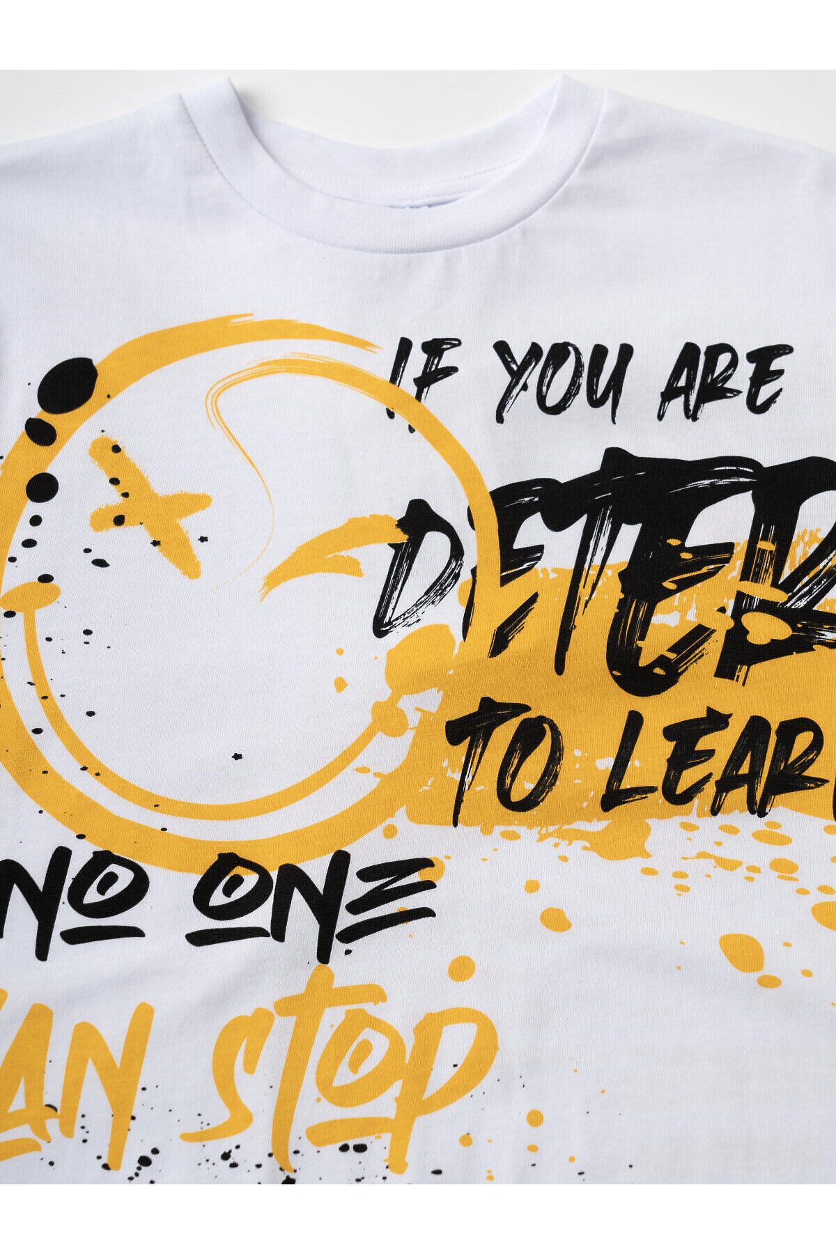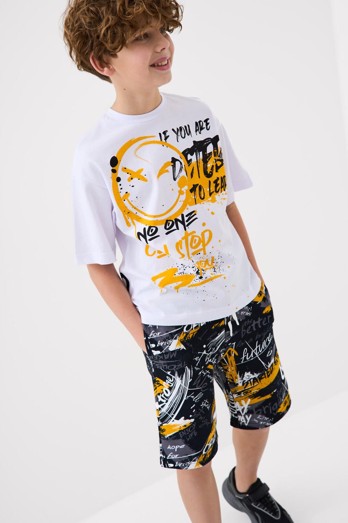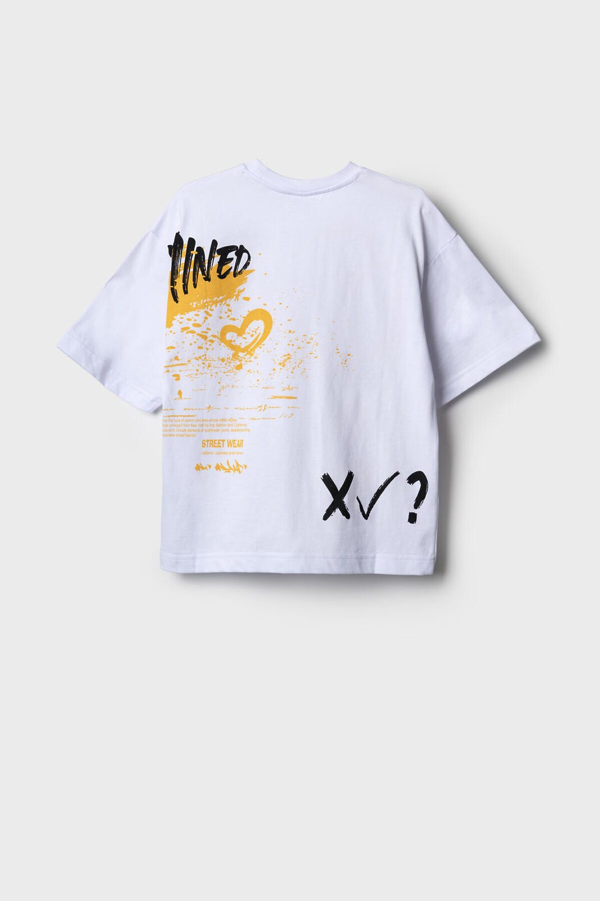 Футболка оверсайз для мальчика подростка. Модель выполнена из эластичного хлопкового трикотажа джерси. Спереди и по спинке модель украшена принтами в стиле граффити. Горловина круглая, обработана эластичным рибом.