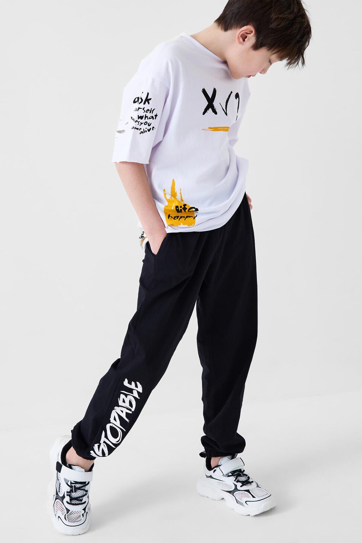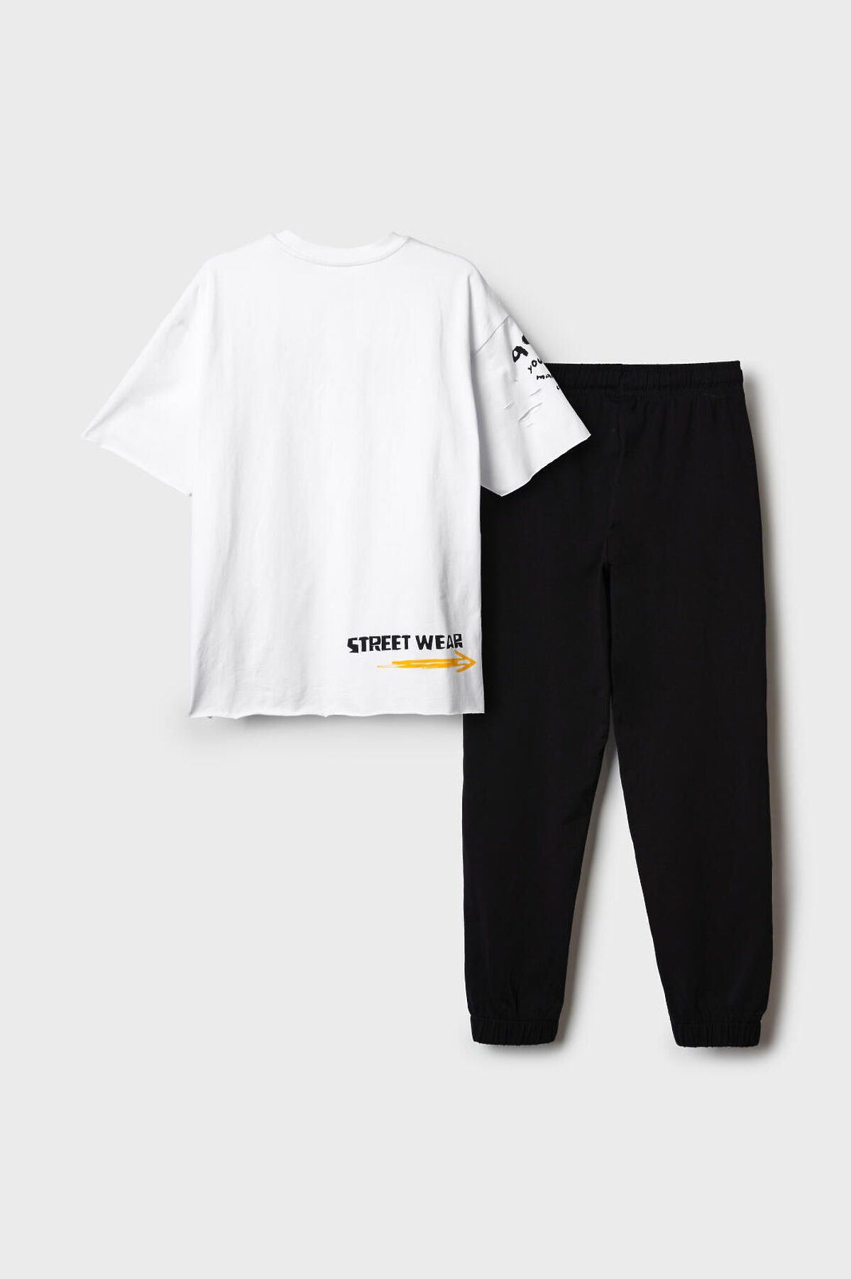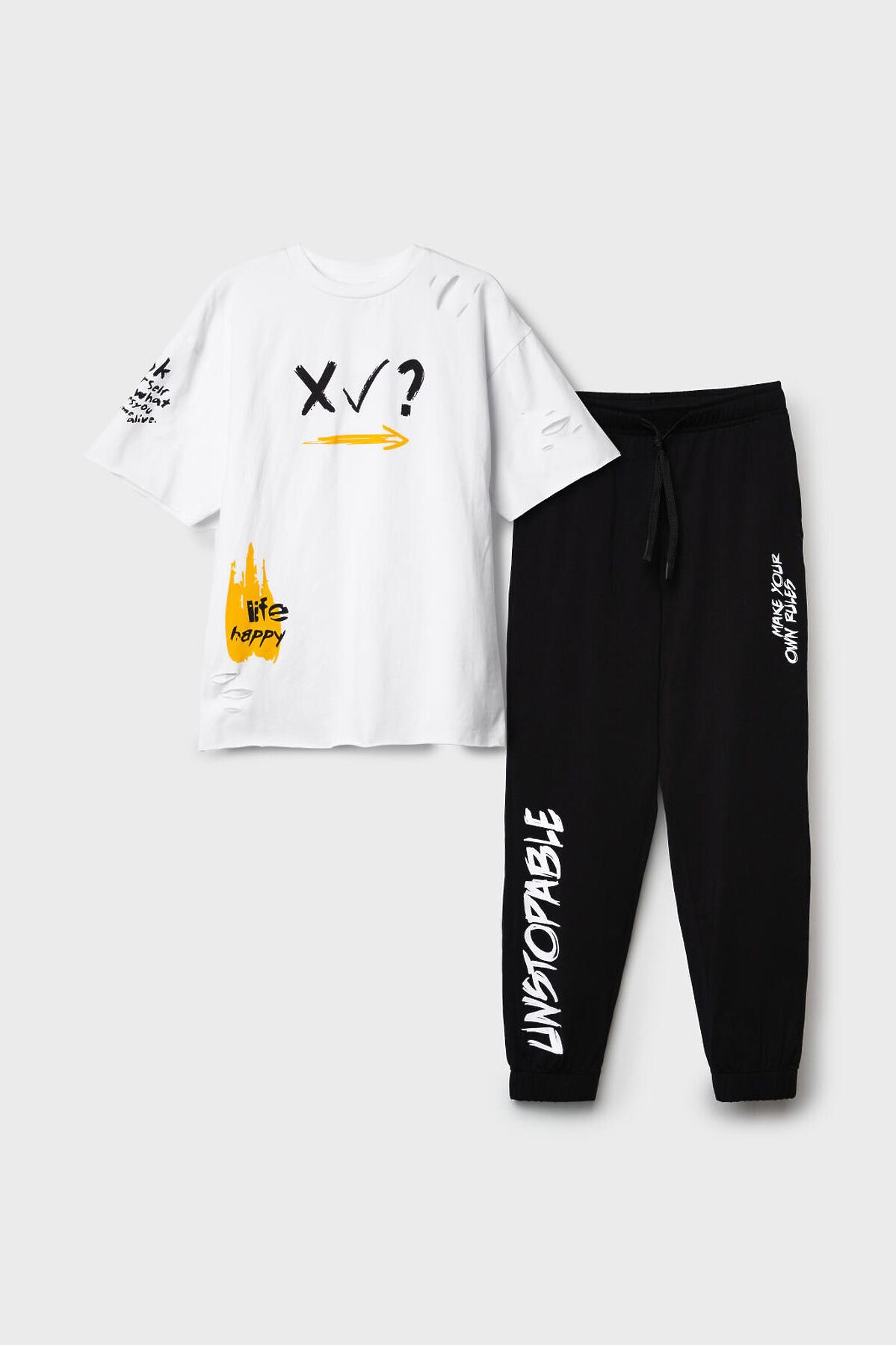 Костюм для мальчика подростка. Состоит из футболки с коротким рукавом и брюк джоггеров. Футболка оверсайз с ярким принтом и декоративными разрезами. Брюки выполнены из плотного хлопкового футера. Модель с комфортной посадкой, пояс на резинке дополнен шнурком. Удобные боковые карманы. Внизу — эластичные манжеты.