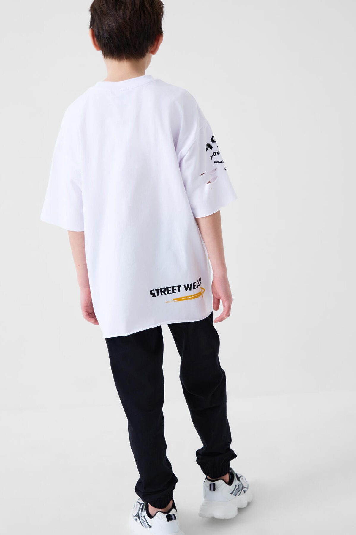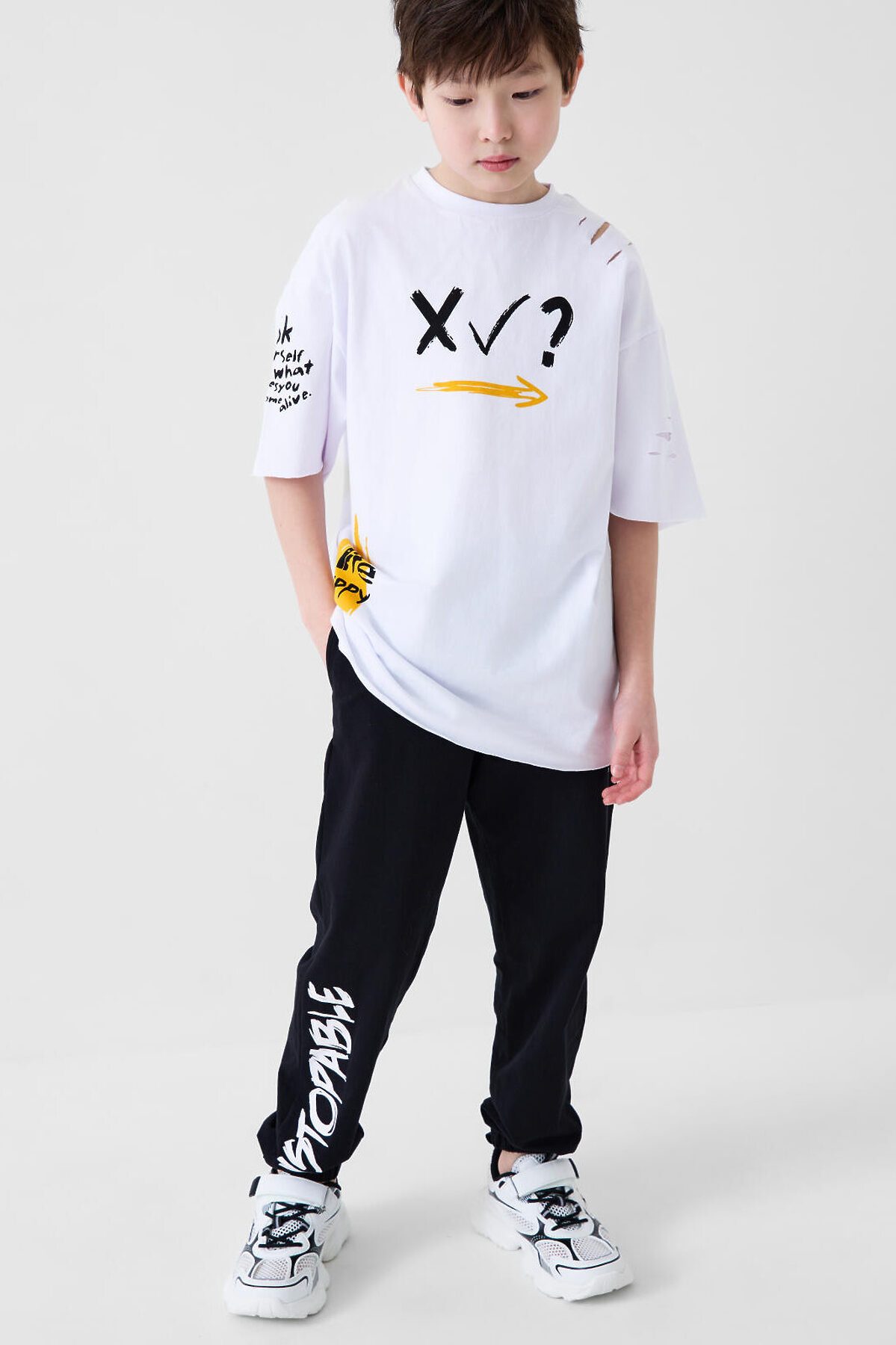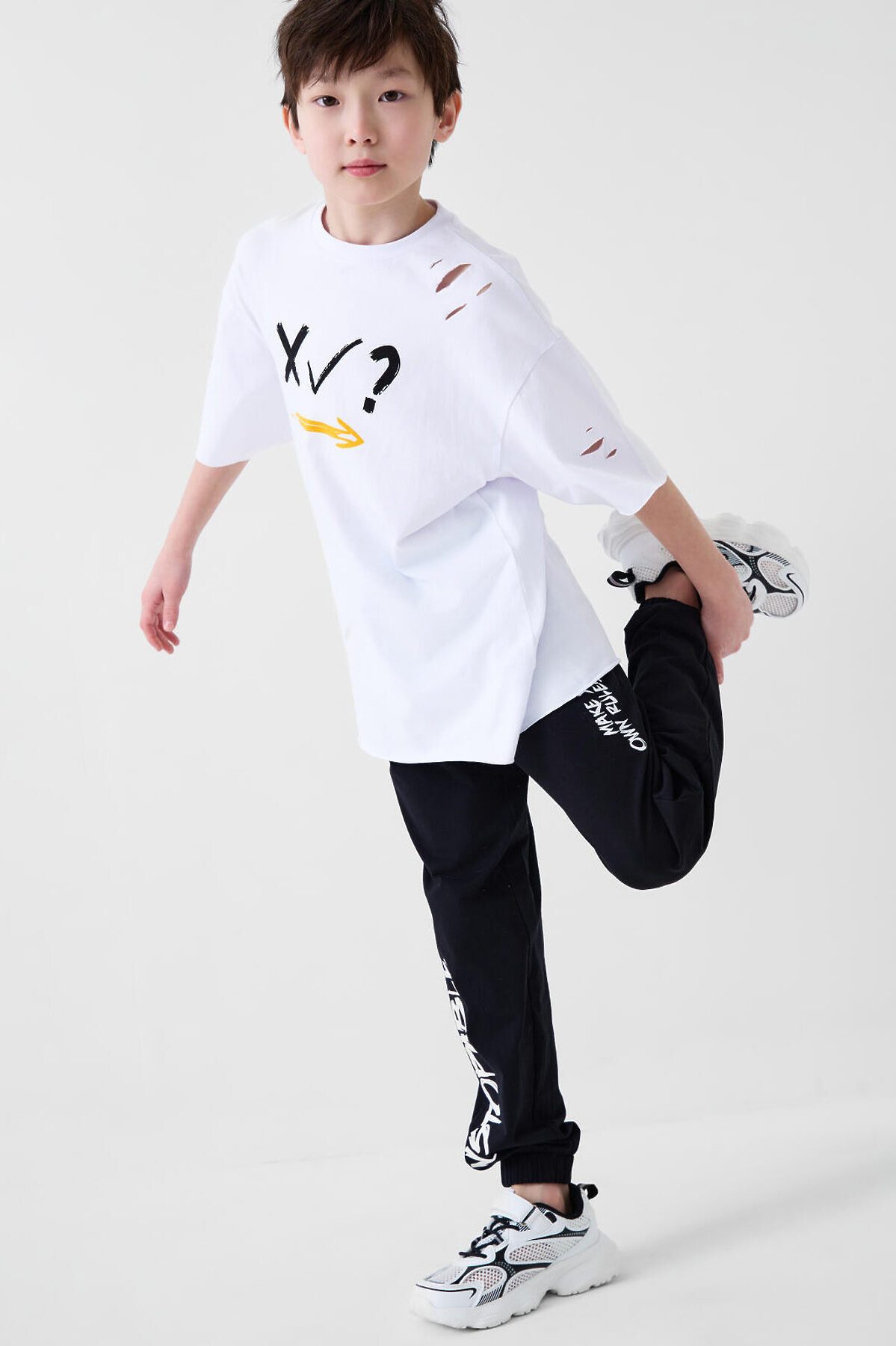 Костюм для мальчика подростка. Состоит из футболки с коротким рукавом и брюк джоггеров. Футболка оверсайз с ярким принтом и декоративными разрезами. Брюки выполнены из плотного хлопкового футера. Модель с комфортной посадкой, пояс на резинке дополнен шнурком. Удобные боковые карманы. Внизу — эластичные манжеты.