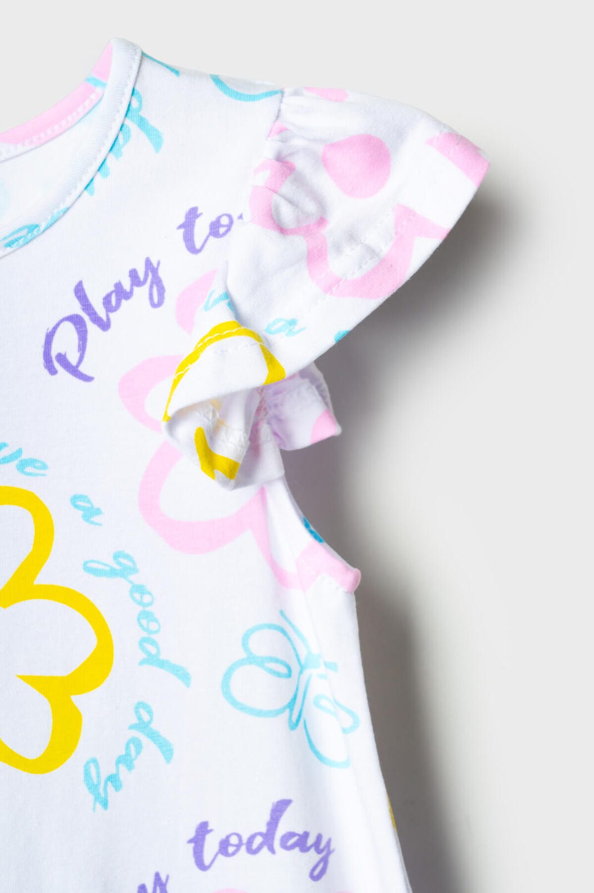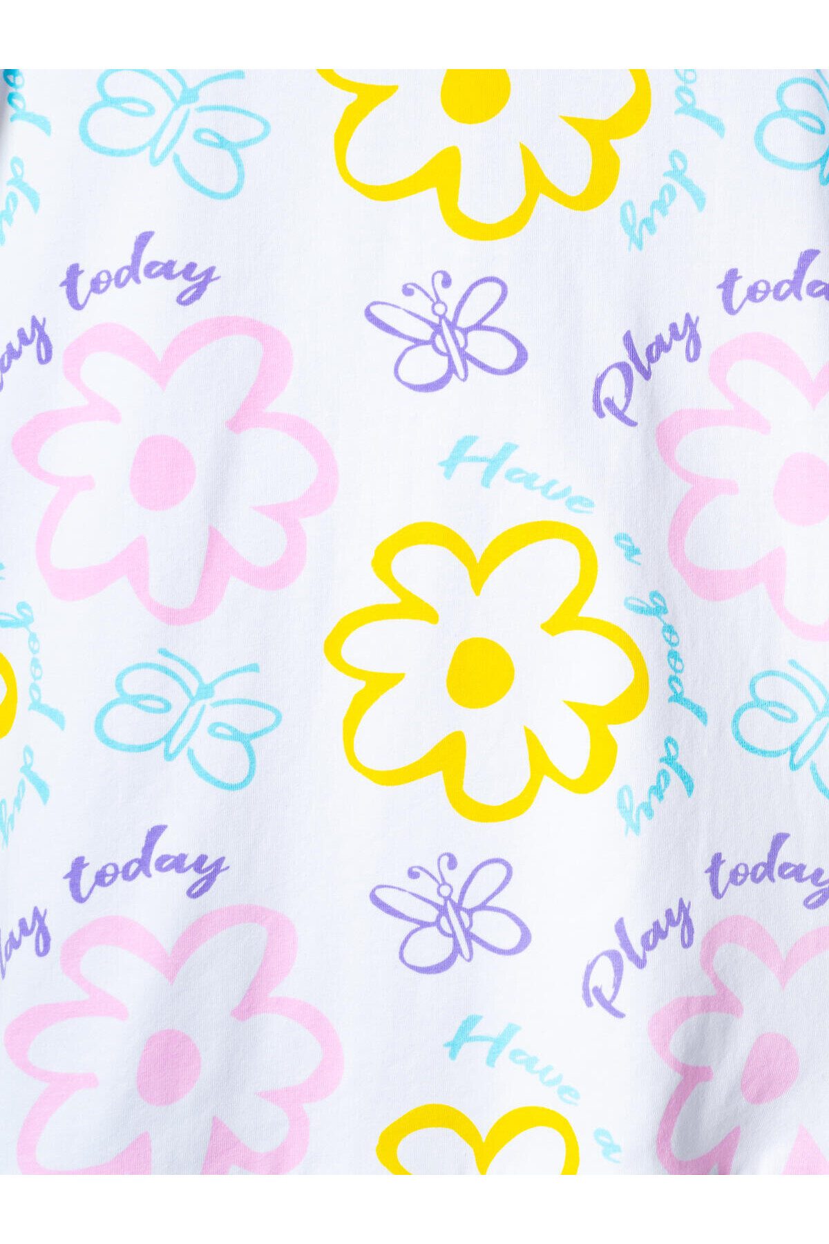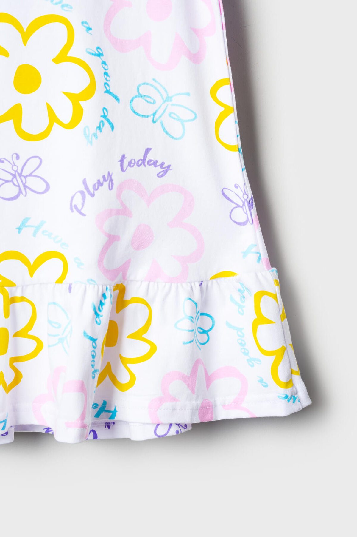 Детская ночная сорочка для девочки. Модель без рукавов из трикотажа, выполненная в прямом силуэте. Круглая горловина и рюши на плечах, придающие образу нежность. По низу сорочки пришита широкая оборка из ткани с контрастным принтом.