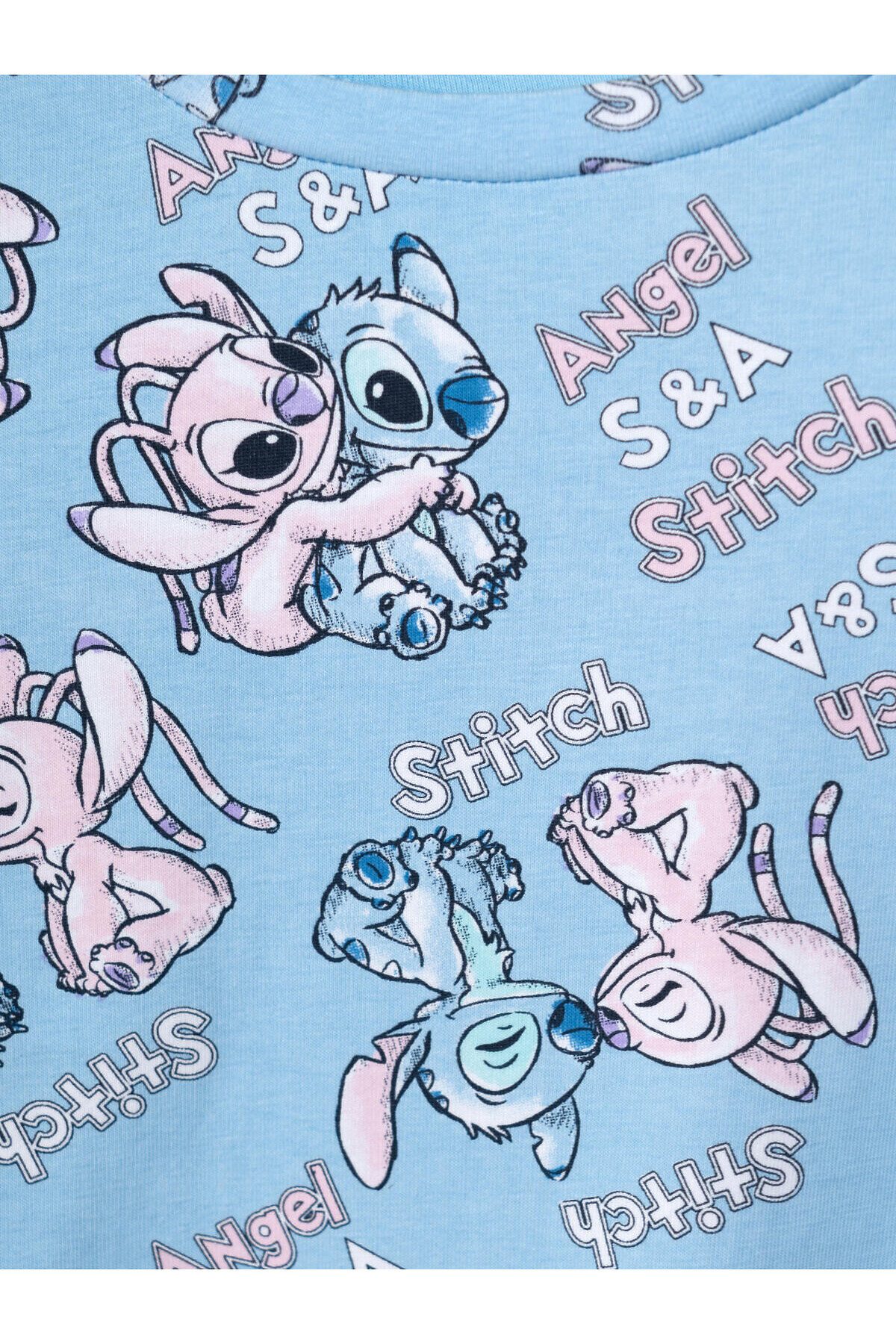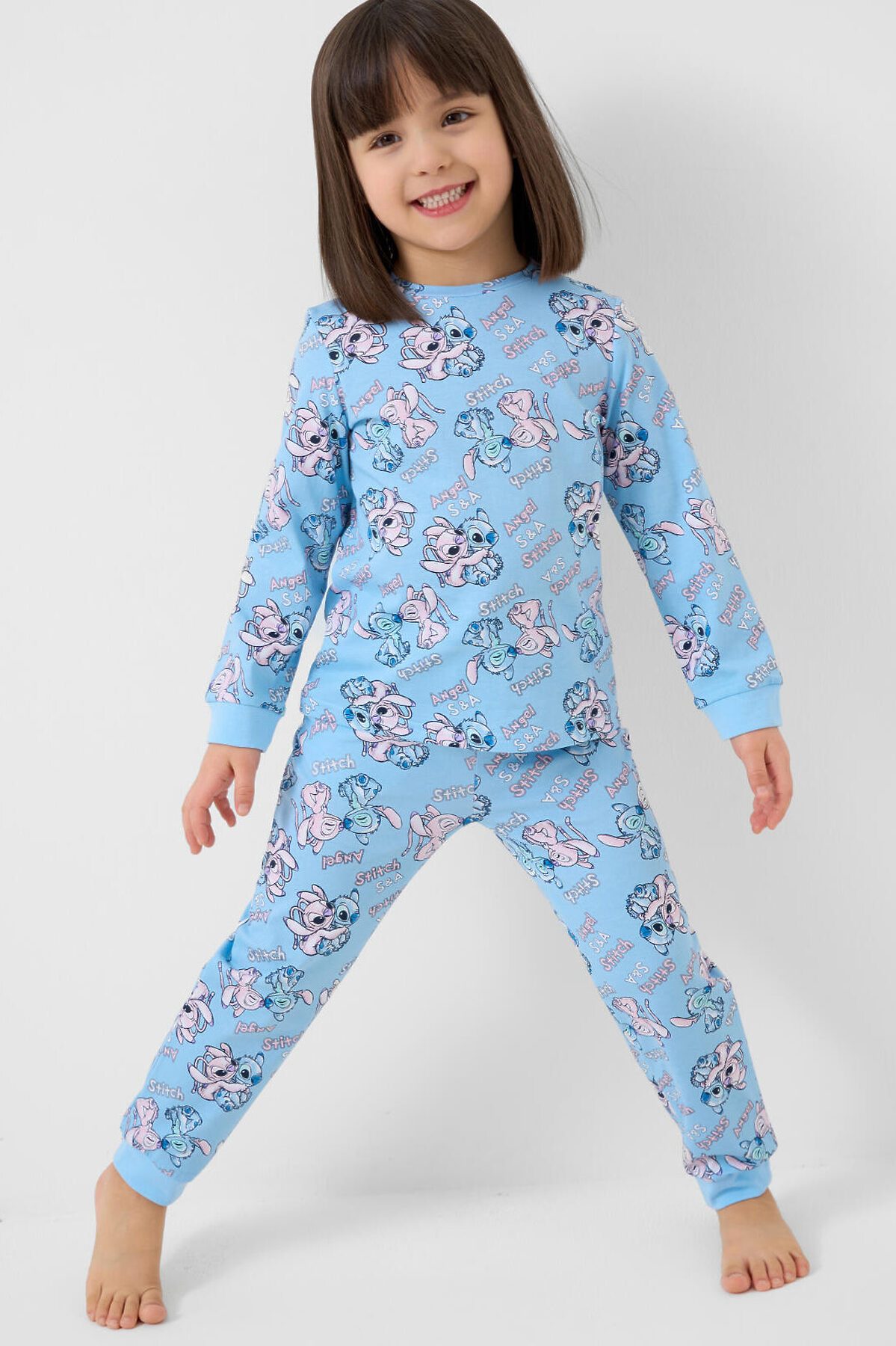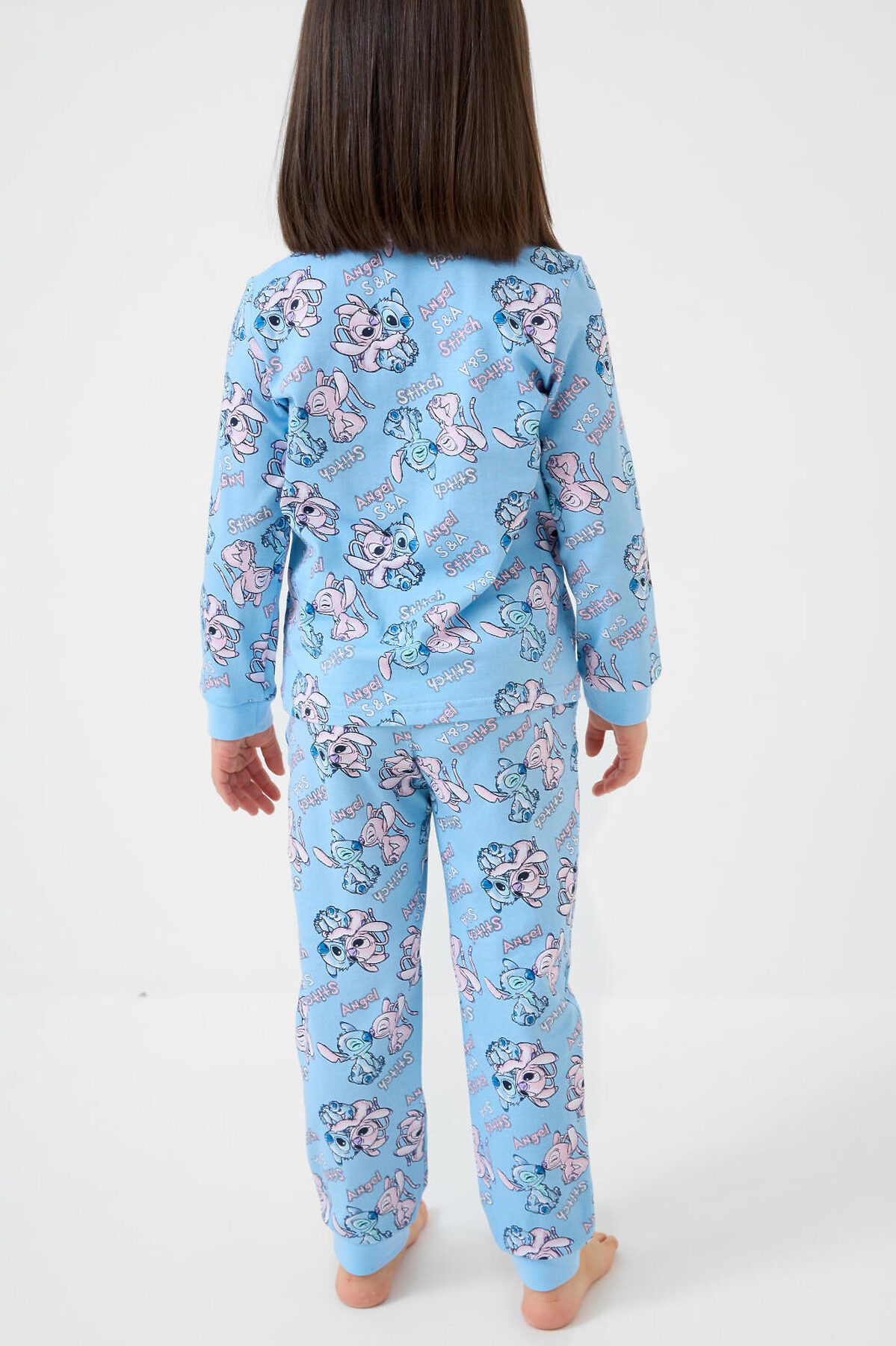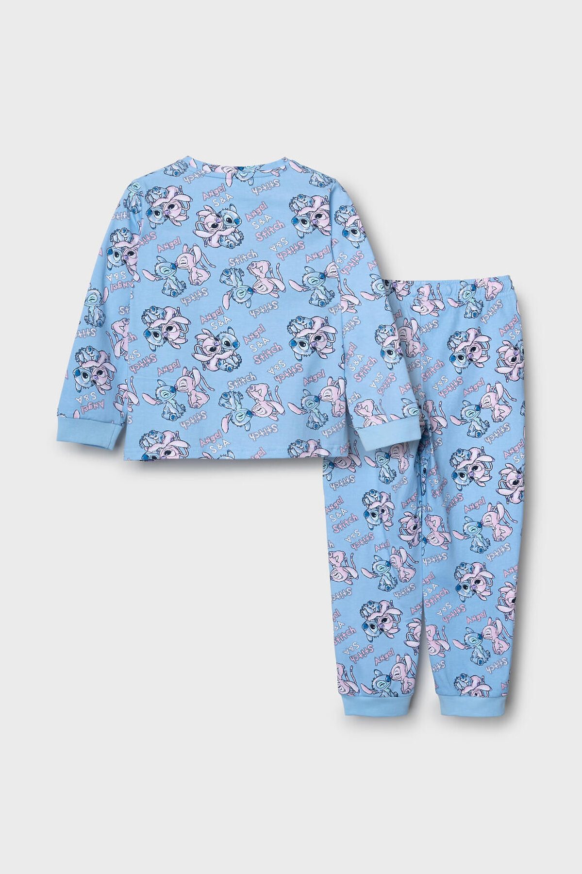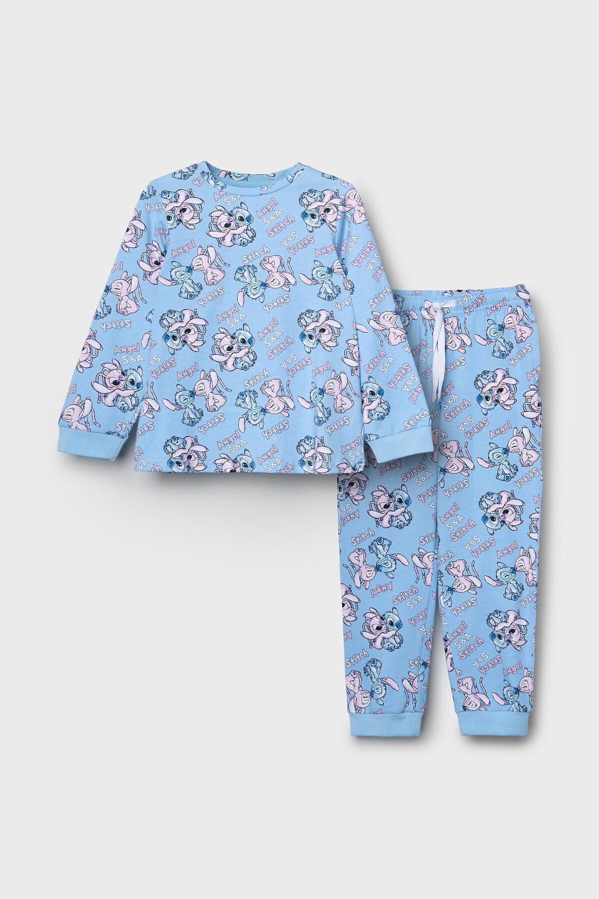 Детская пижама для девочки. Комплект из лонгслива, прямого кроя с длинными рукавами и брюк. Изделие выполнено из мягкого, хлопкового трикотажного материала и украшено ярким принтом с героями мультфильма Лило и Стич. У лонгслива круглая горловина и манжеты на рукавах, у брюк — удобный пояс на резинке, дополненный декоративным белым шнурком. Манжеты по низу брюк делают модель комфортной в носке.