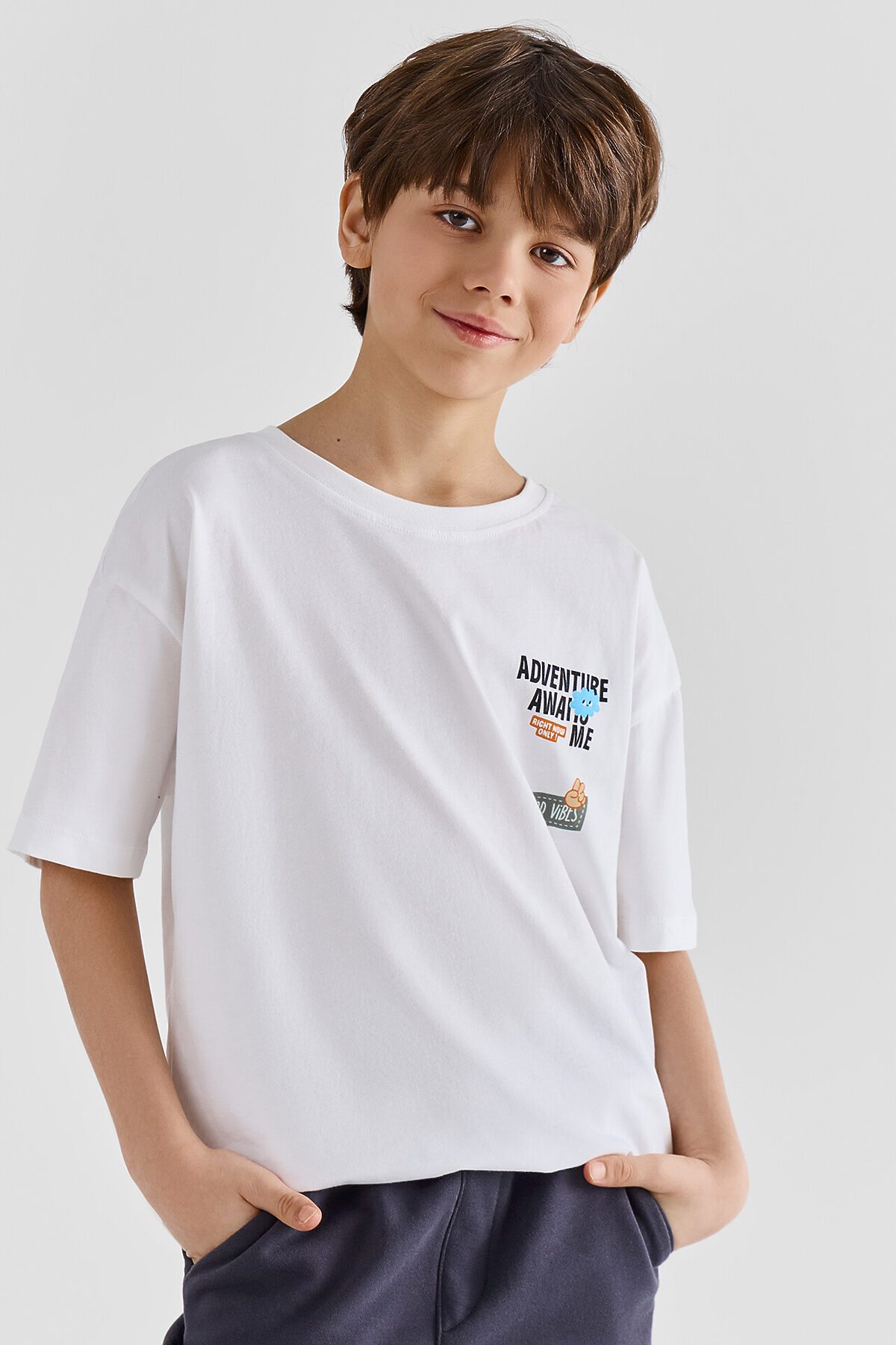 Футболка свободного силуэта из хлопковой трикотажной кулирки. Длина до середины бедер. Рукава короткие. Горловина круглой формы, с обтачкой из рибаны. Спущенная линия плеча дарит особый комфорт. Стильно и удобно!