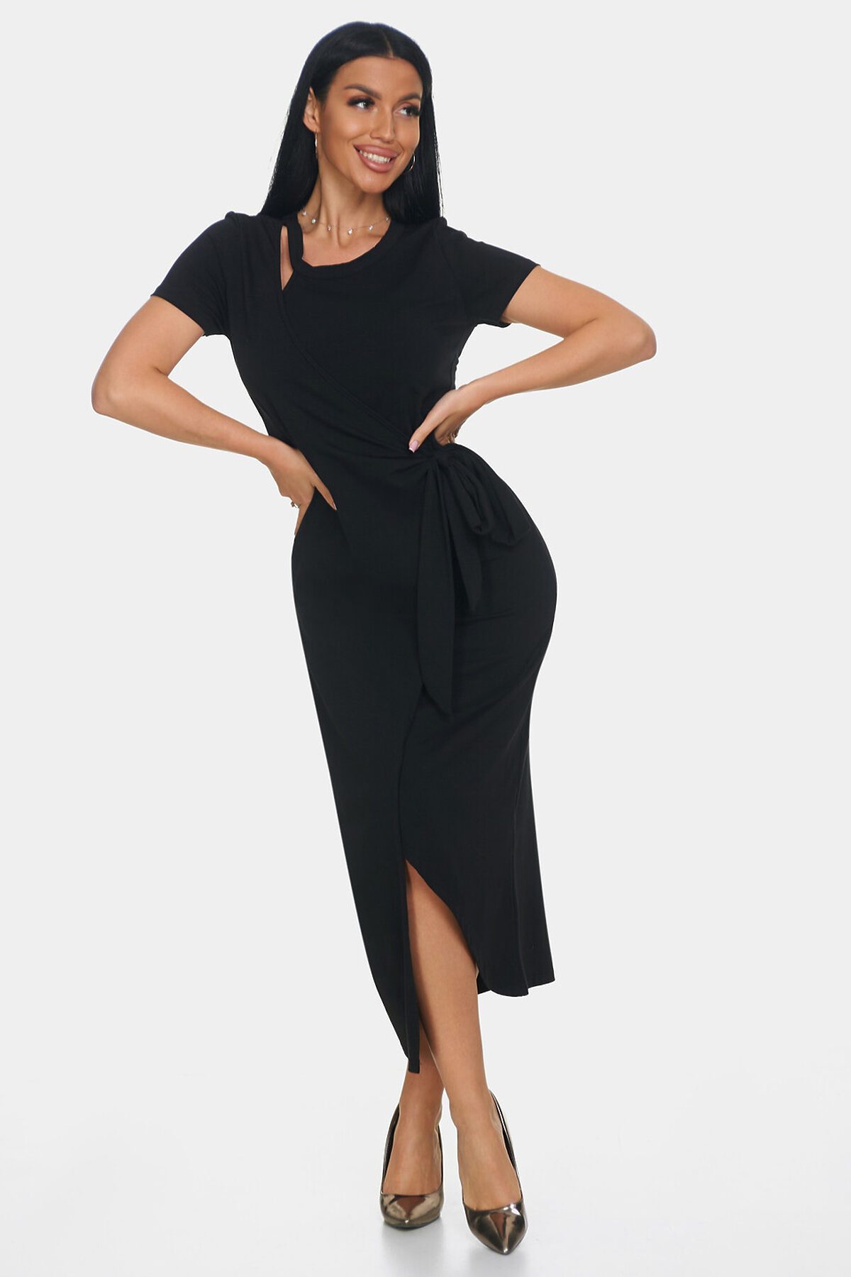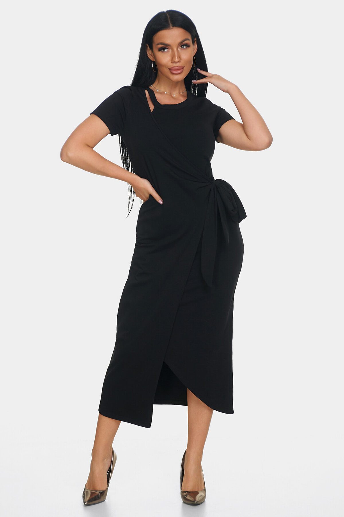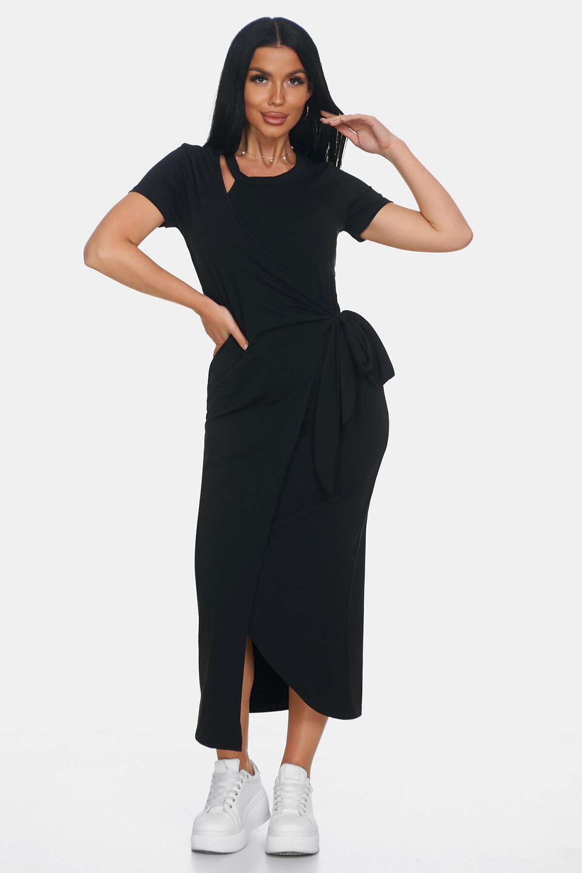 Элегантное платье идеальный выбор для создания женственного и комфортного образа. Платье офисное с длинной макси и короткими рукавами создаст утонченный и воздушный силуэт, подчеркивая вашу фигуру и обеспечивая полную свободу движений. Повседневное платье выполнено с эффектом запаха, что делает образ непринужденным и в то же время очень стильным. Необычный вырез у шеи еще одна изюминка этой модели. Такой вырез добавляет уникальности и акцента в образ, при этом оставаясь элегантным и сдержанным.
