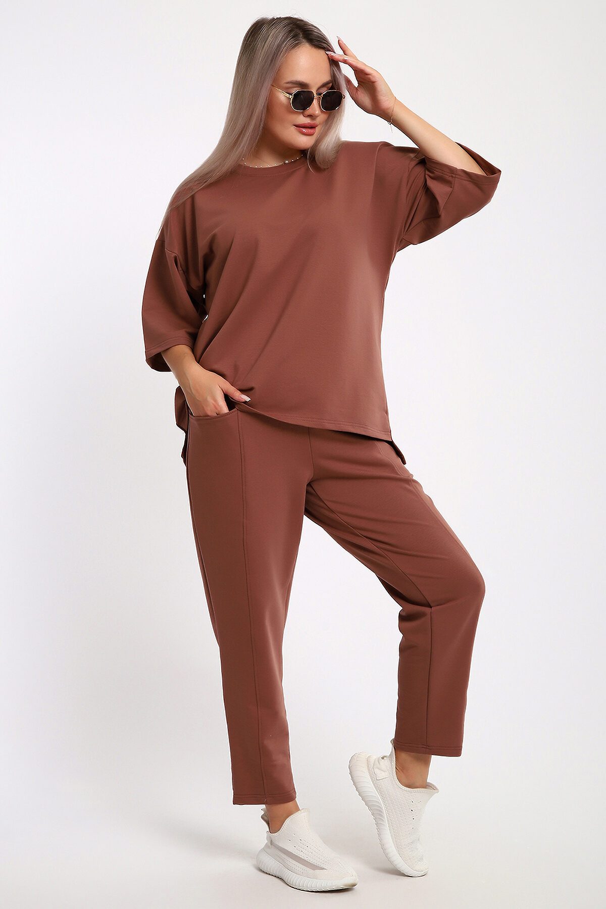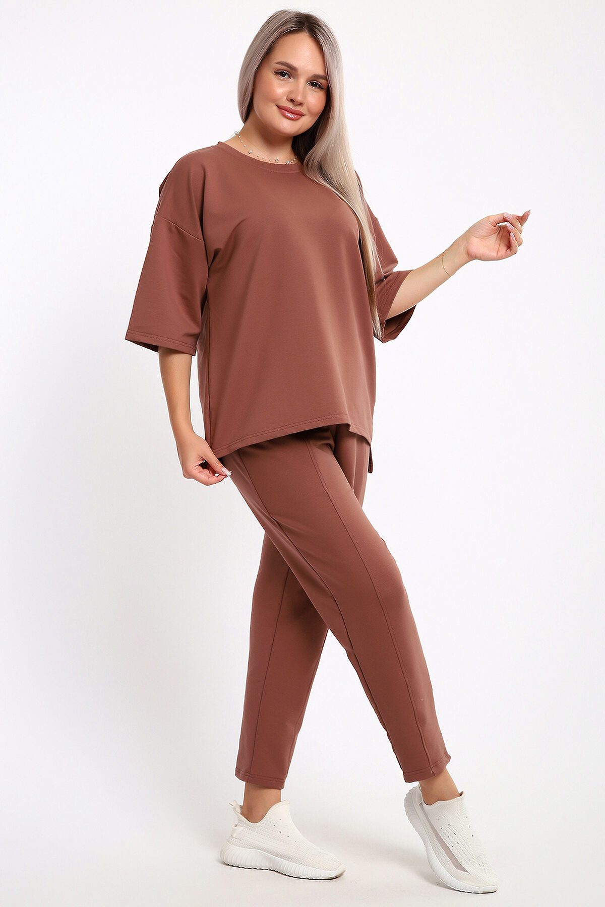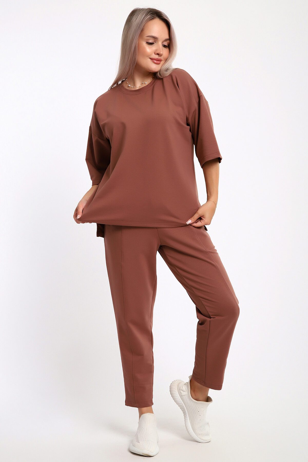 Этот женский костюм в благородном шоколадном оттенке идеальное сочетание комфорта и современного стиля. Благодаря продуманному составу ткани и свободному крою, он станет незаменимой базой для повседневного гардероба. Описание фасона: Верх (Кофта): Крой: Свободный силуэт (oversize-эффект), который мягко скрывает нюансы фигуры и не стесняет движений. Рукав: Укороченный, что придает образу легкость и позволяет демонстрировать аксессуары на запястьях. Горловина: Аккуратная обработка, обеспечивающая комфортную посадку. Низ (Брюки): Стиль: Комфортные брюки свободного кроя. Детали: Оснащены глубокими и функциональными карманами. Посадка: Эластичный пояс обеспечивает надежную фиксацию на талии без лишнего давления.