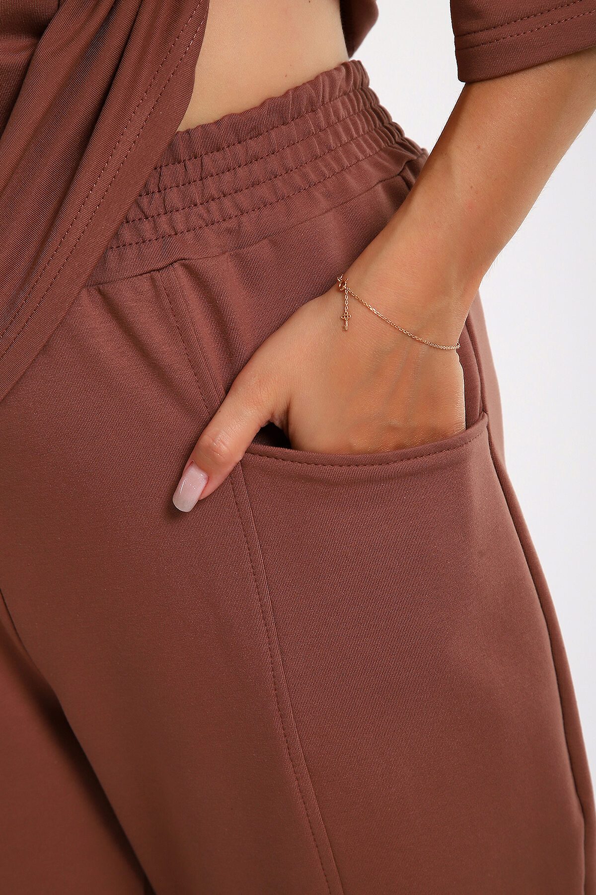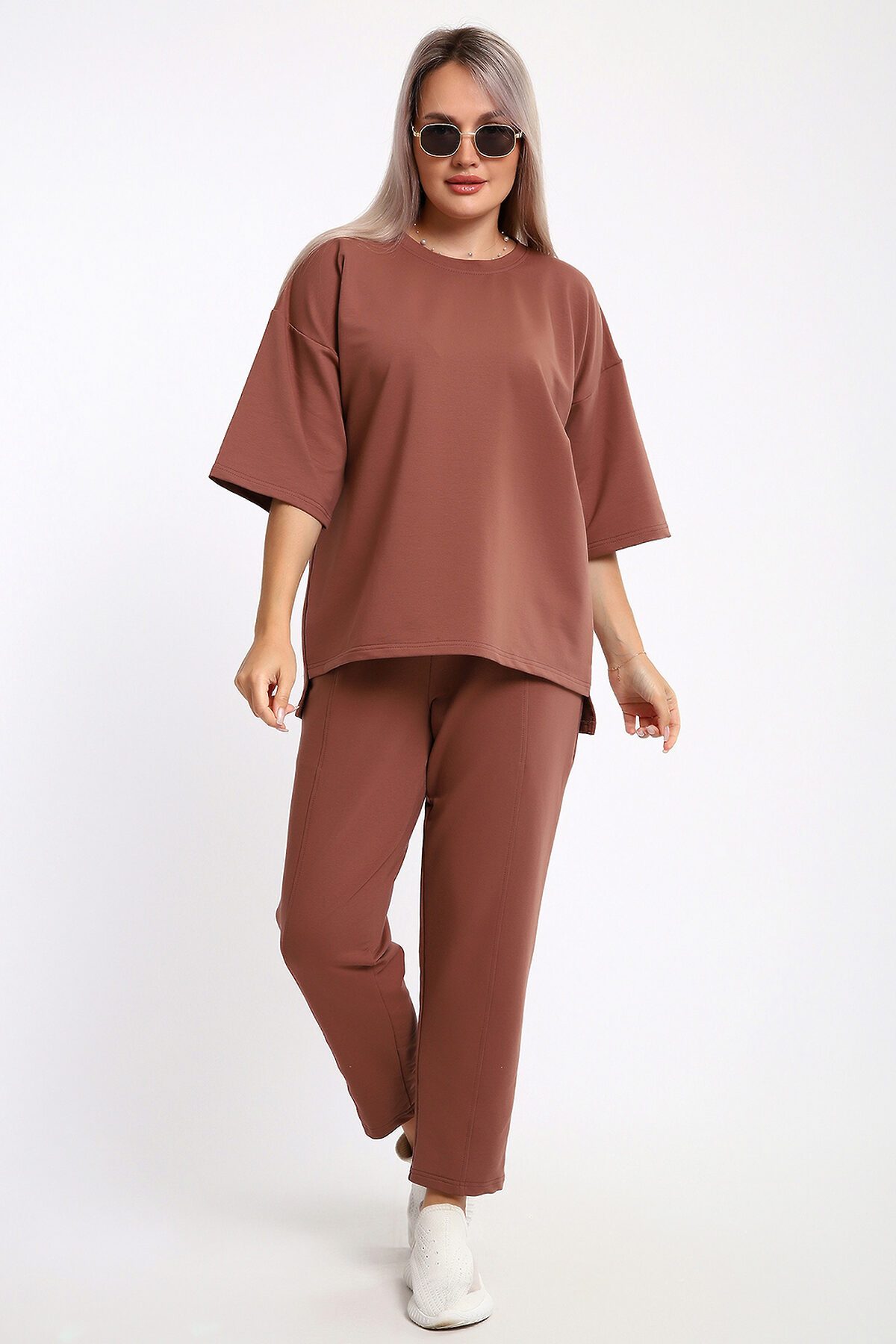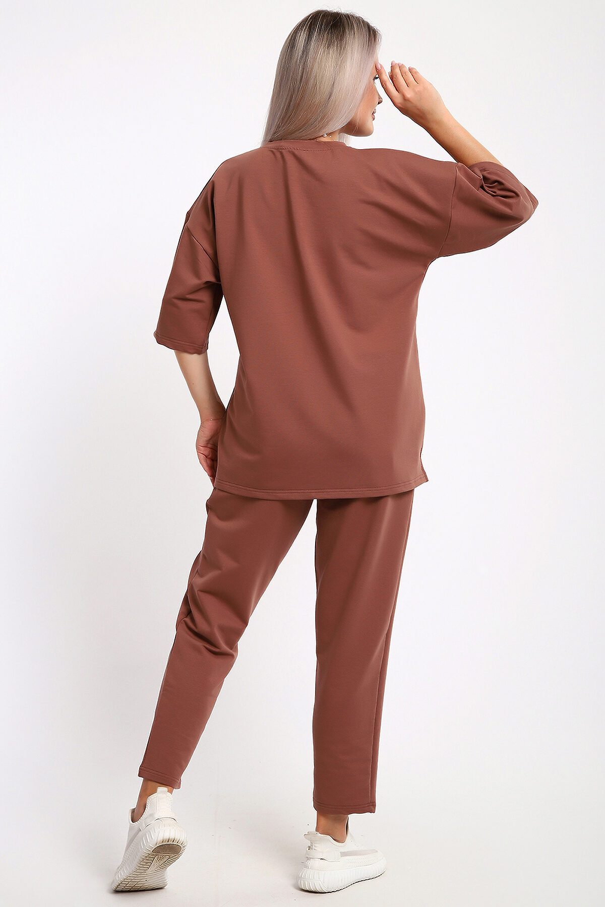 Этот женский костюм в благородном шоколадном оттенке идеальное сочетание комфорта и современного стиля. Благодаря продуманному составу ткани и свободному крою, он станет незаменимой базой для повседневного гардероба. Описание фасона: Верх (Кофта): Крой: Свободный силуэт (oversize-эффект), который мягко скрывает нюансы фигуры и не стесняет движений. Рукав: Укороченный, что придает образу легкость и позволяет демонстрировать аксессуары на запястьях. Горловина: Аккуратная обработка, обеспечивающая комфортную посадку. Низ (Брюки): Стиль: Комфортные брюки свободного кроя. Детали: Оснащены глубокими и функциональными карманами. Посадка: Эластичный пояс обеспечивает надежную фиксацию на талии без лишнего давления.