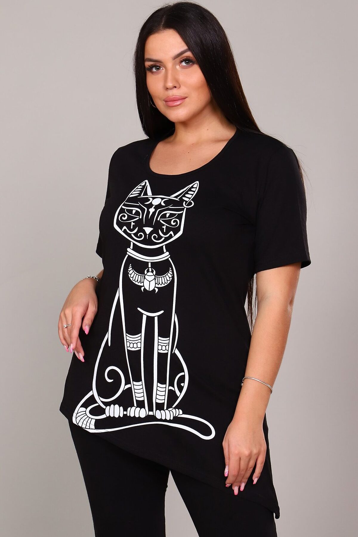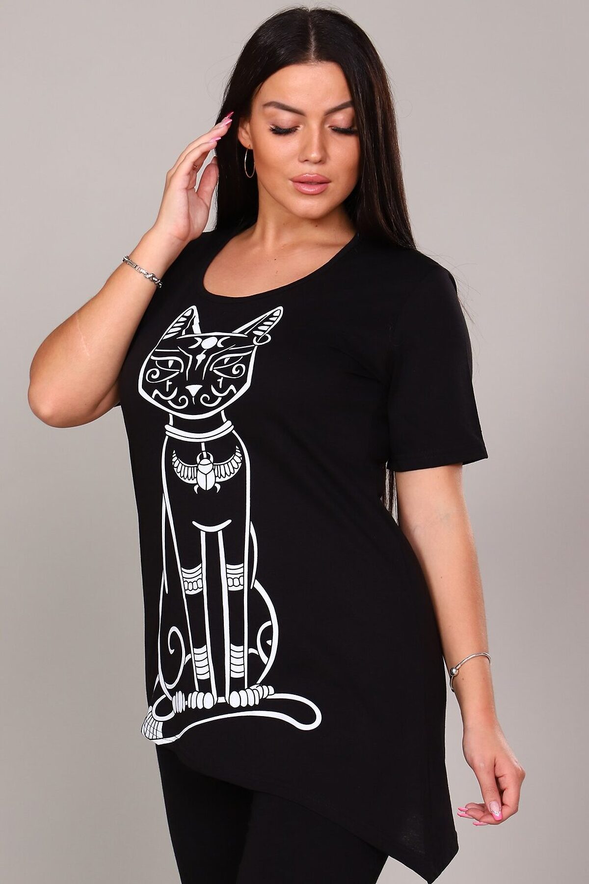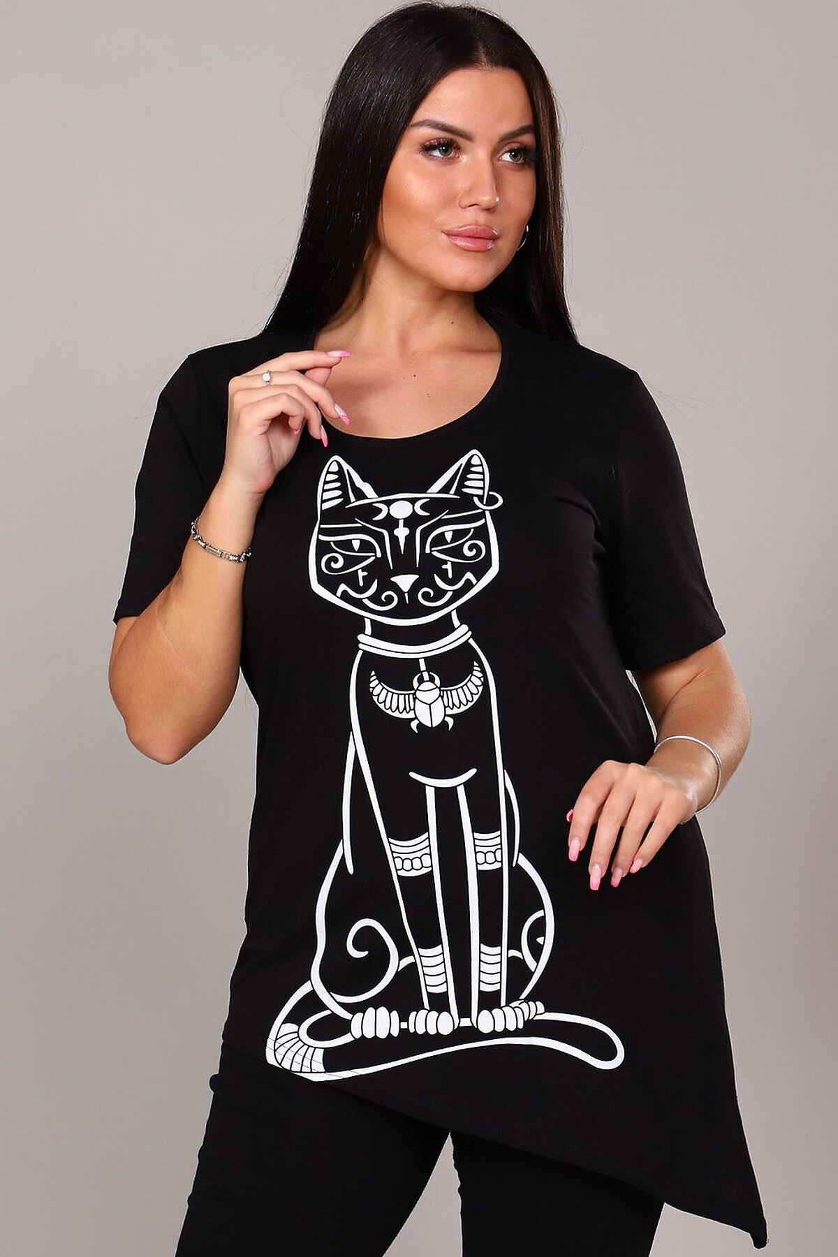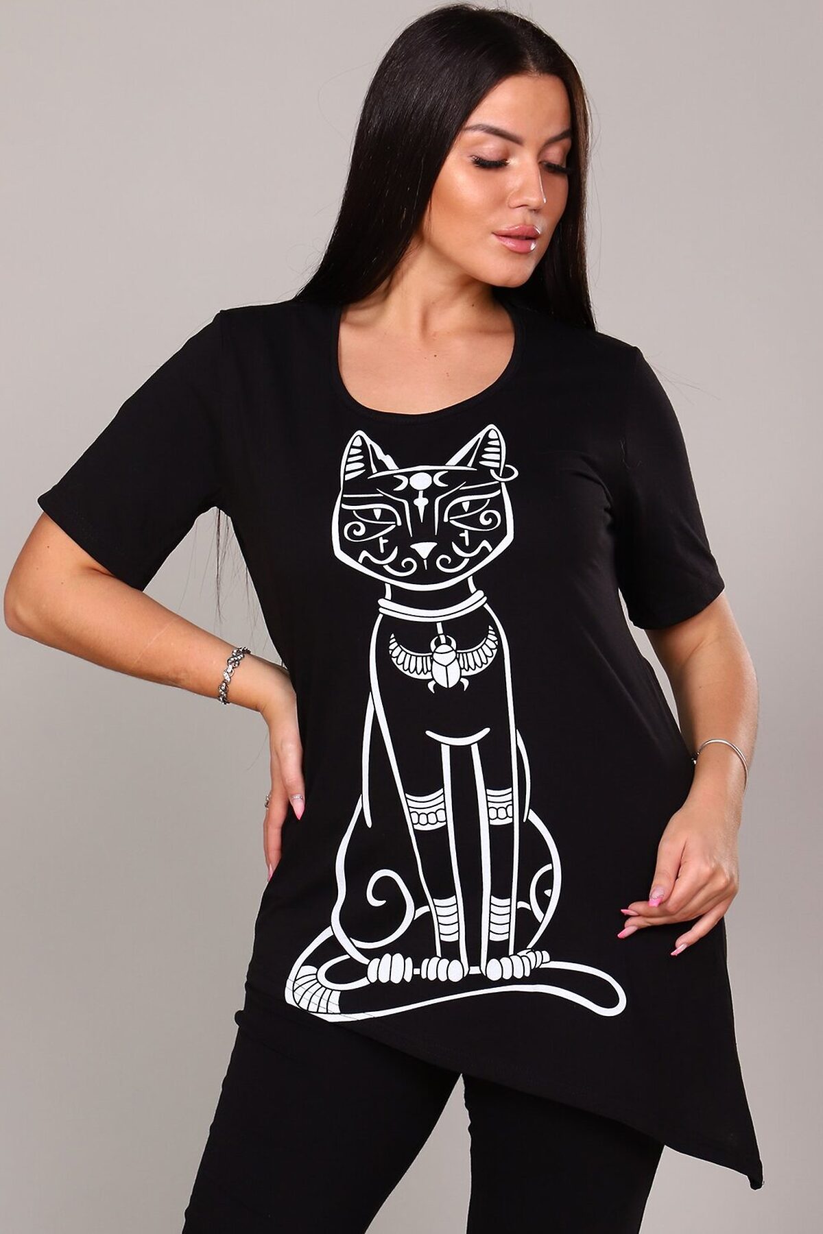 Элегантная и загадочная, эта туника идеально сочетает современный крой и элементы древней символики. Модель выполнена в классическом черном цвете, который стройнит фигуру и служит идеальным фоном для выразительного принта. Оригинальный крой Диагональ: Главная изюминка модели асимметричный крой. Нижний край туники скошен по диагонали, что создает летящий силуэт, визуально вытягивает фигуру и придает образу динамичности и легкости. Принт Египетская кошка: Центральный элемент дизайна стилизованный принт с изображением священной египетской кошки (Бастет). Это изображение придает изделию особый шарм, нотку мистики и восточной экзотики. Универсальность: Туника отлично подходит как для повседневной носки в сочетании с леггинсами или узкими брюками, так и для создания более нарядного образа с акцентными аксессуарами. Эта туника станет ярким акцентом в вашем гардеробе, подчеркивая индивидуальность и хороший вкус.