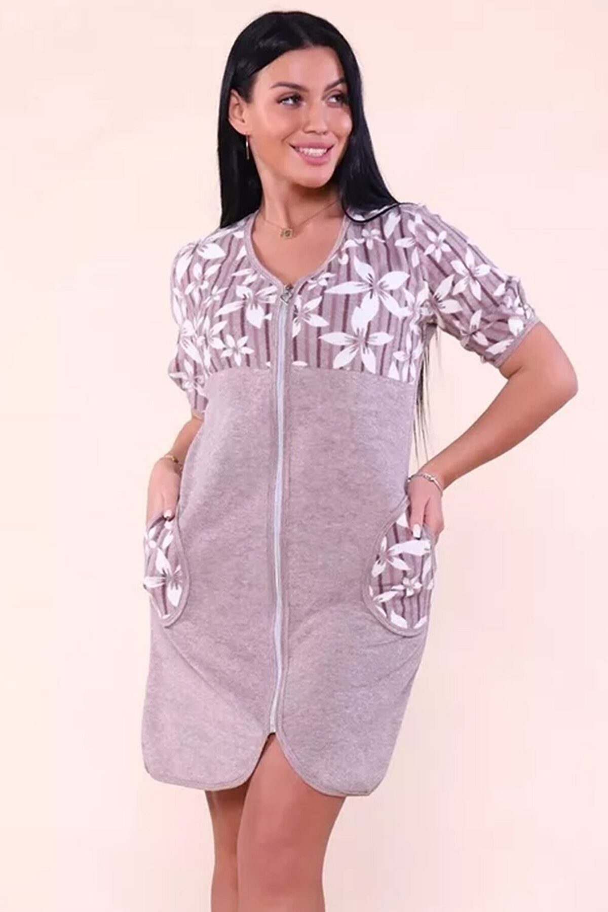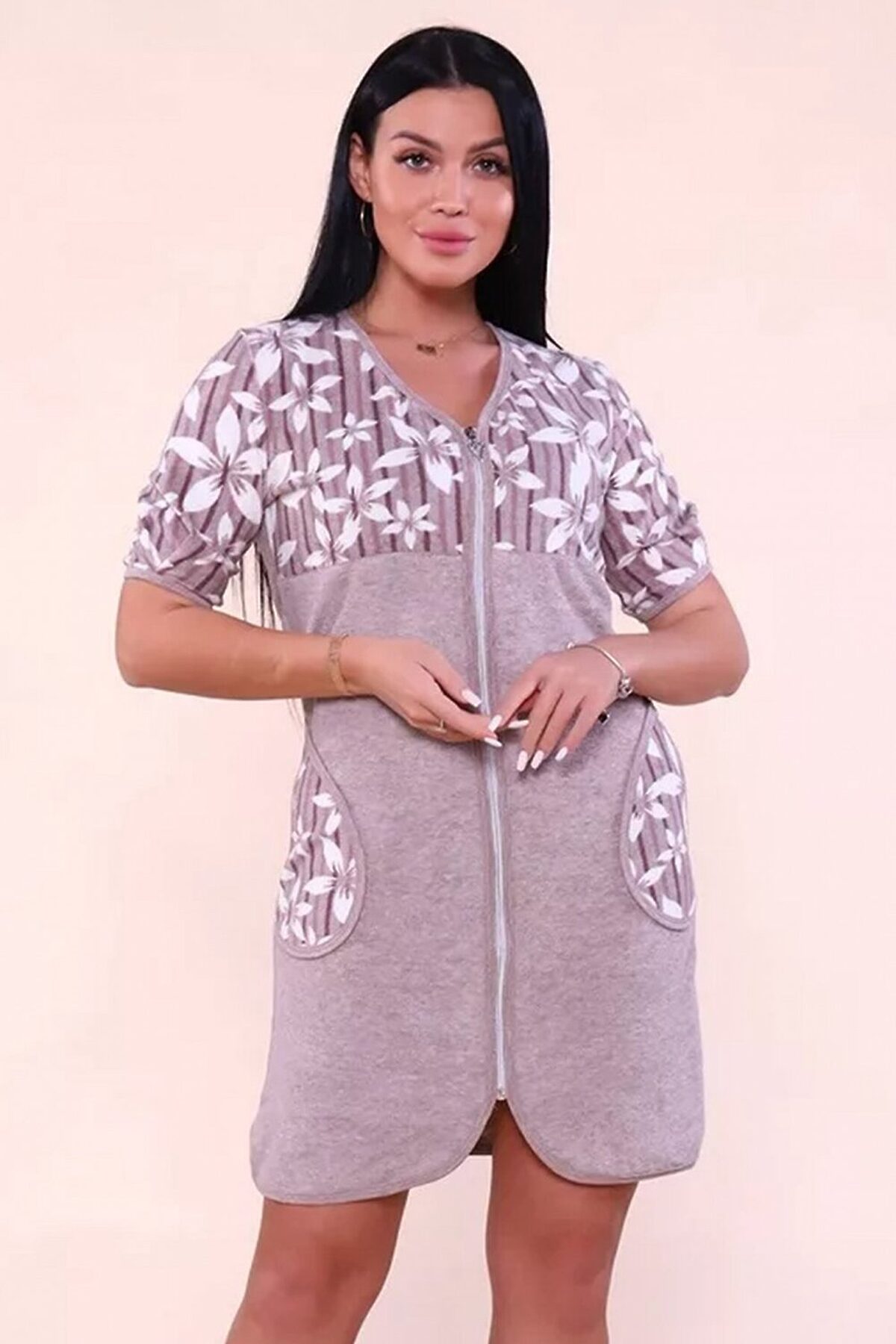 Этот уютный женский халат идеальное сочетание комфорта и практичности. Модель выполнена в современном стиле из мягкой махры, которая отлично впитывает влагу и позволяет коже дышать. Ключевые характеристики: Материал: Качественное махровое полотно (состав: 80% хлопок, 20% полиэстер). Добавление п/э делает изделие износостойким: халат не теряет форму и не грубеет после многочисленных стирок. Дизайн: Эффектная комбинация материалов. Верхняя часть с карманами украшена набивным цветочным принтом, а основная выполнена из однотонной махры, что создает гармоничный и свежий образ. Крой: Практичная застежка на молнии позволяет быстро надевать и снимать халат. Удобный рукав 3/4 не мешает при домашних делах. Детали: Наличие функциональных карманов для необходимых мелочей. Этот халат подарит ощущение домашнего уюта и станет отличным подарком для ценительниц качественного трикотажа.