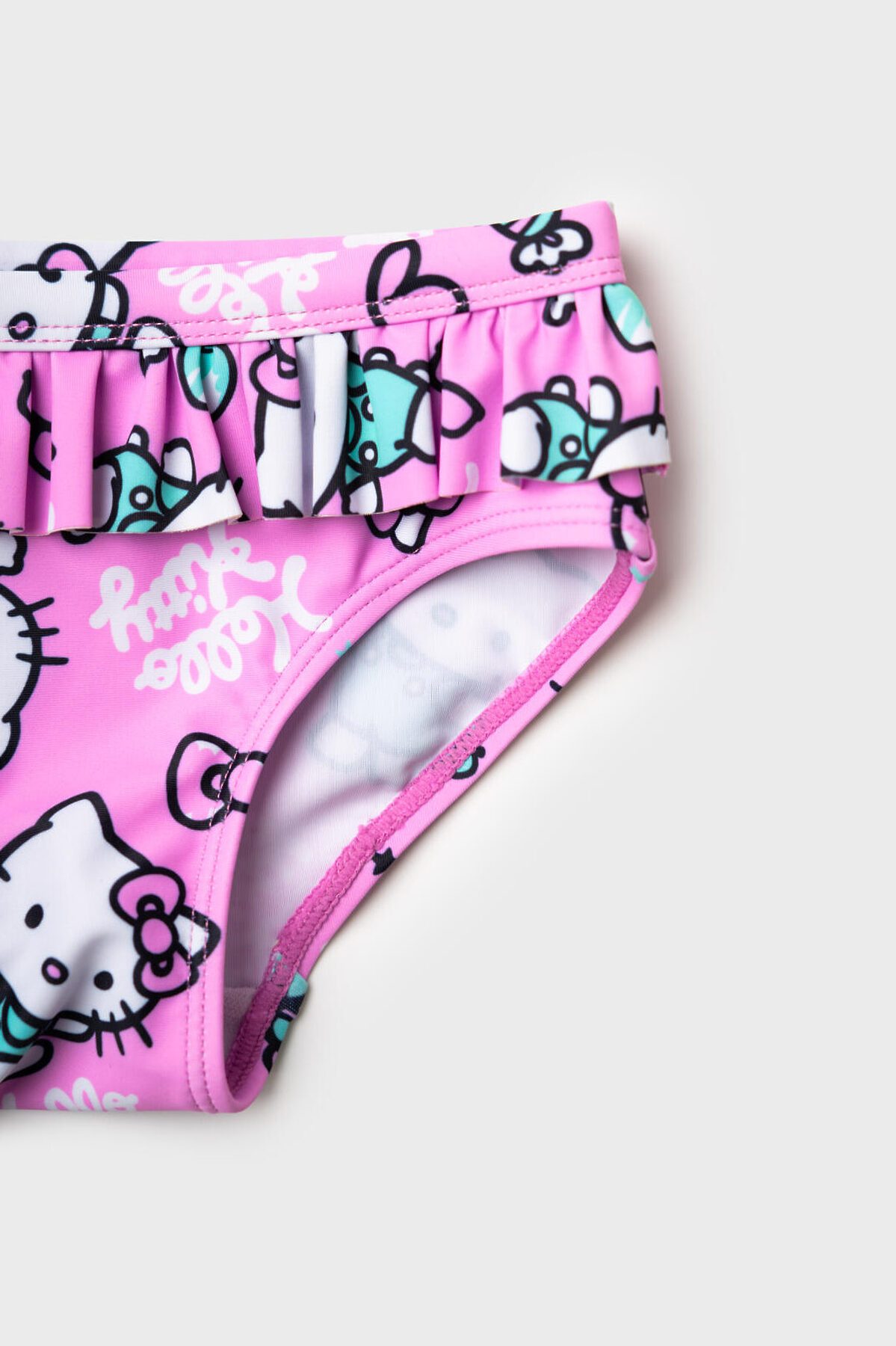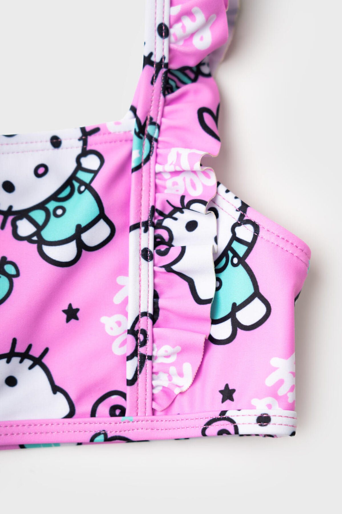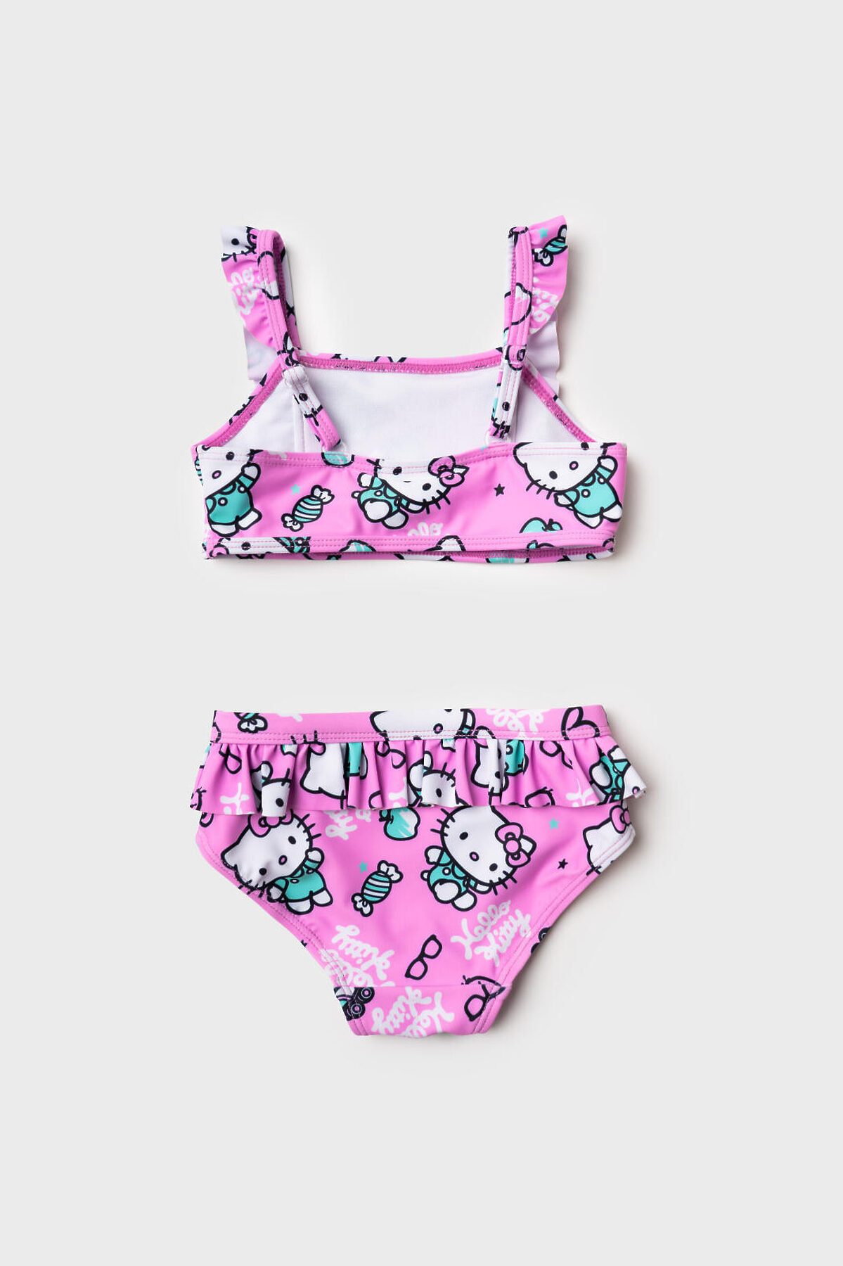 Купальник детский раздельный для девочки. Выполнен в светло-розовом цвете с принтом Hello Kitty, конфетами и сердечками. У топа — широкие бретели с милыми воланами, которые делают образ особенно воздушным. Плавки украшены воланом по линии талии, создавая нежный. Все детали сделаны из мягкой эластичной ткани, с подкладкой внутри. Благодаря UF-защите, ткань сохраняет первоначальный вид даже при длительном пребывании на солнце. Подходит для плавания и активного отдыха.