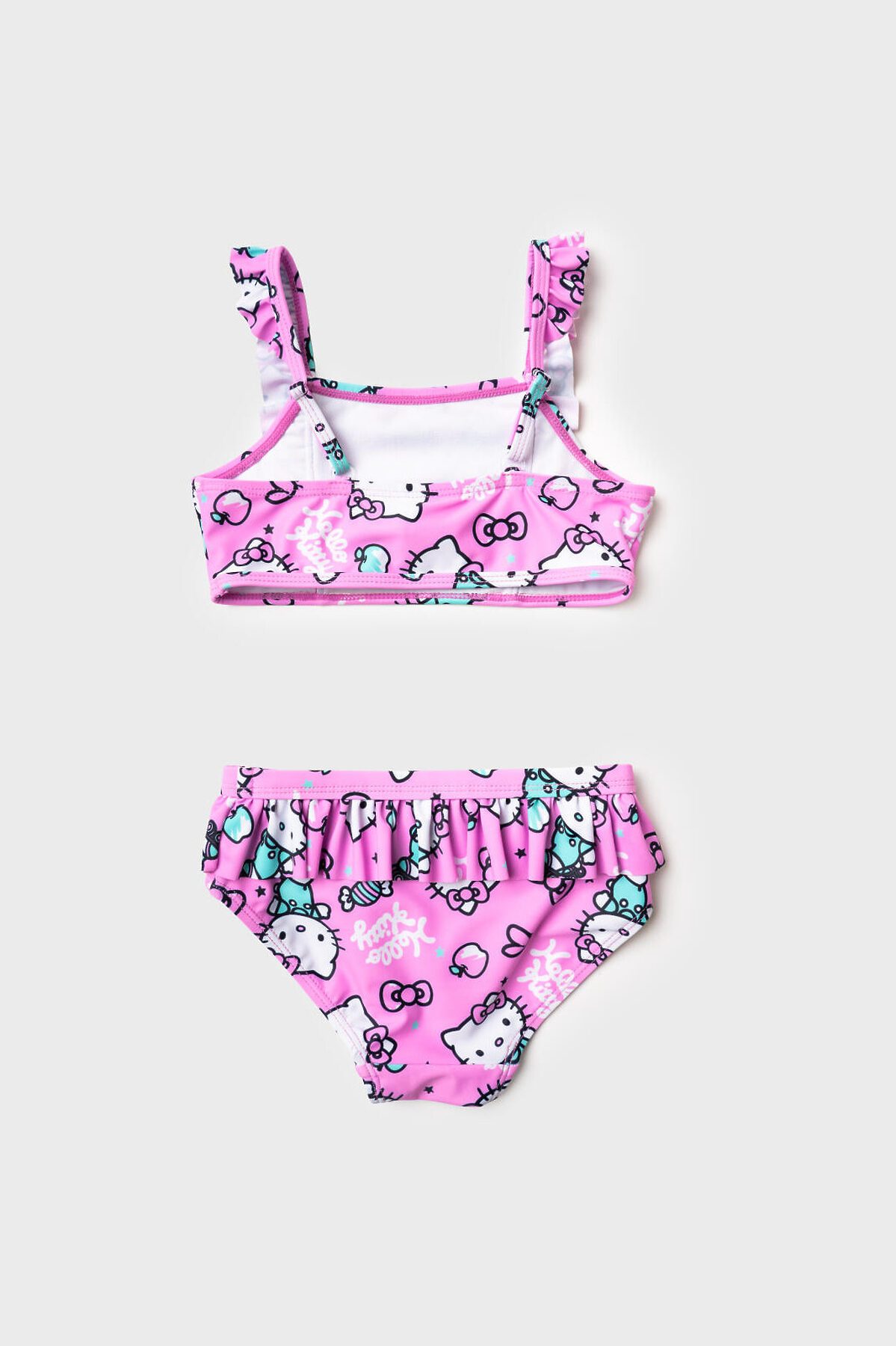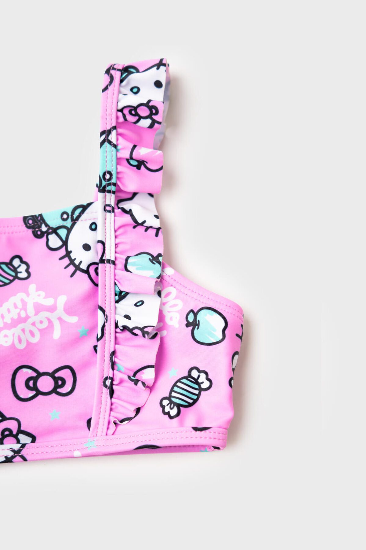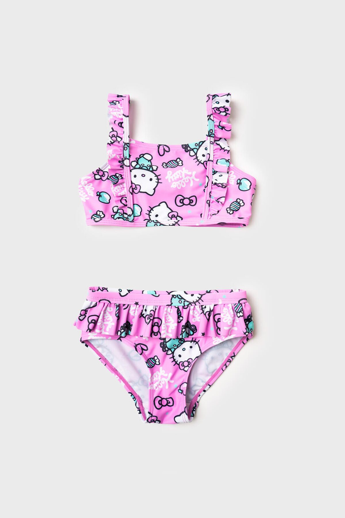 Купальник детский раздельный для девочки. Модель с принтом Hello Kitty с конфетами и бантиками. Топ с прямым вырезом и декоративными воланами на лямках, которые регулируются по длине. Плавки украшены воланом по поясу. Внутри предусмотрена подкладка, а по краям изделия использованы эластичные резинки для удобной посадки. Благодаря UF-защите, ткань сохраняет первоначальный вид даже при длительном пребывании на солнце. Подходит для плавания и активного отдыха.