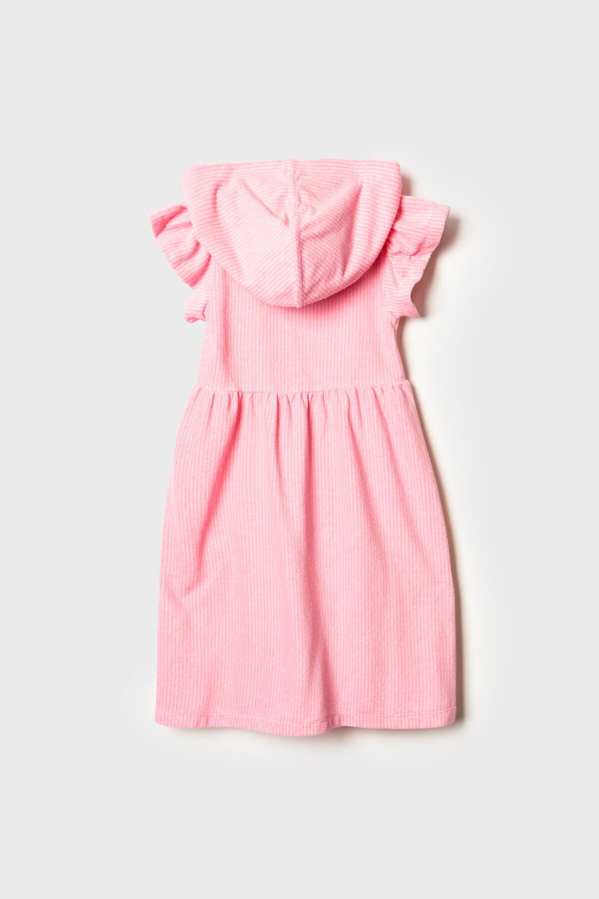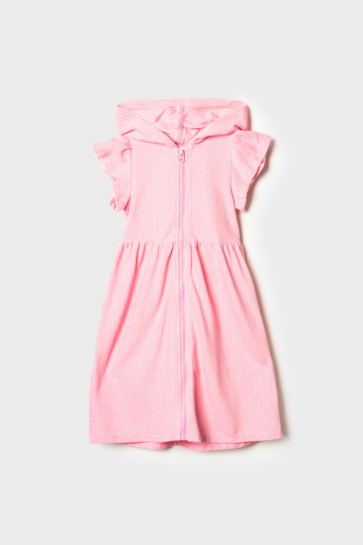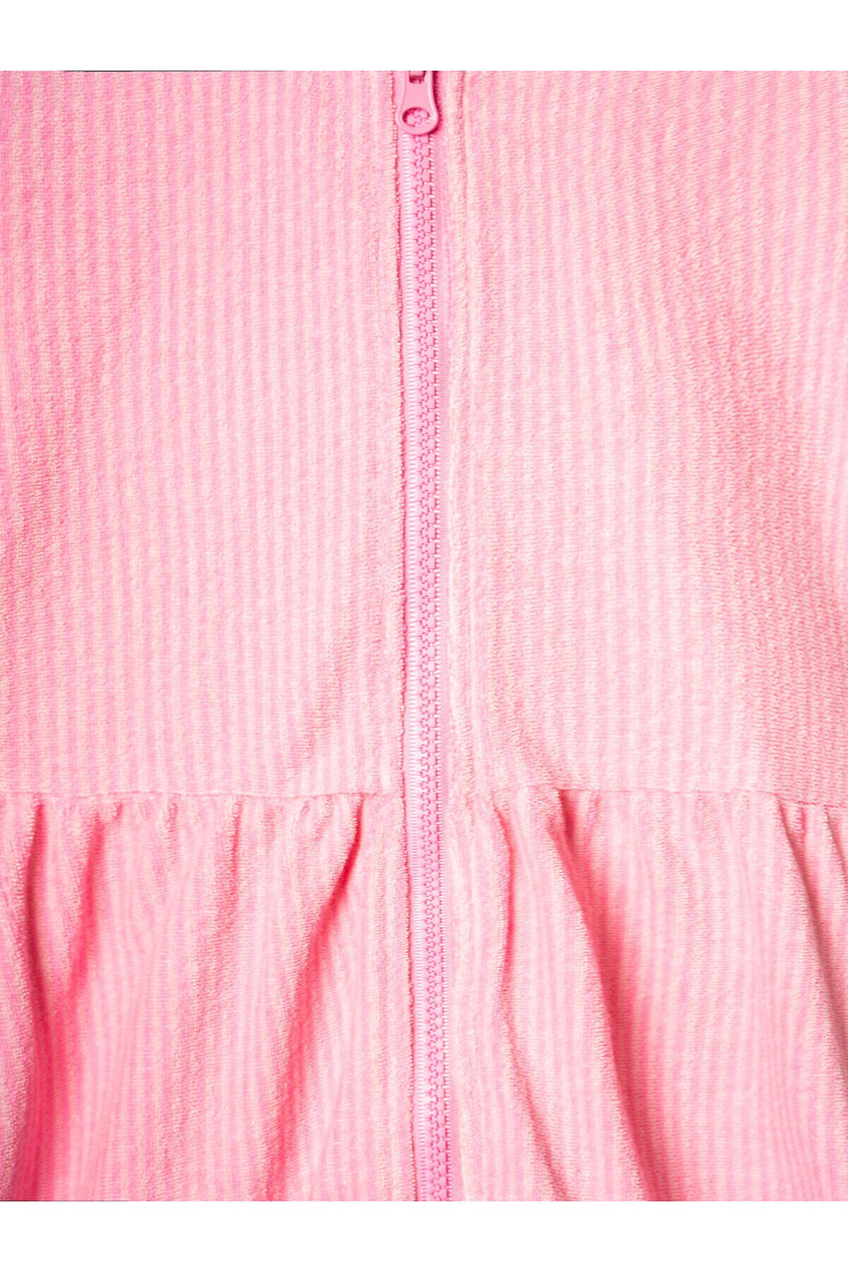 Детский махровый халат на молнии для девочки. Выполненный из мягкой хлопковой трикотажной ткани. Капюшон, короткие рукава с оборками и расклешённый низ. Центральная застёжка-молния делает халат удобным для повседневного использования. Светлый розовый цвет в белую полоску.