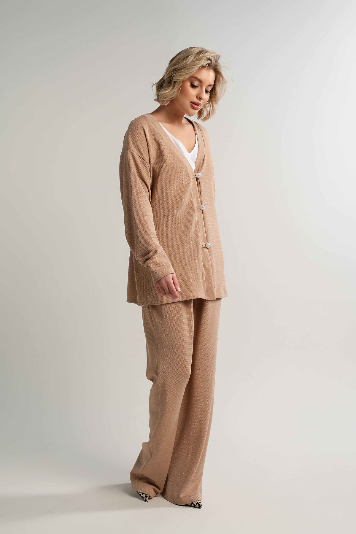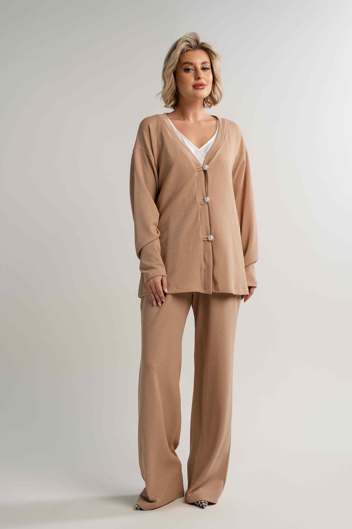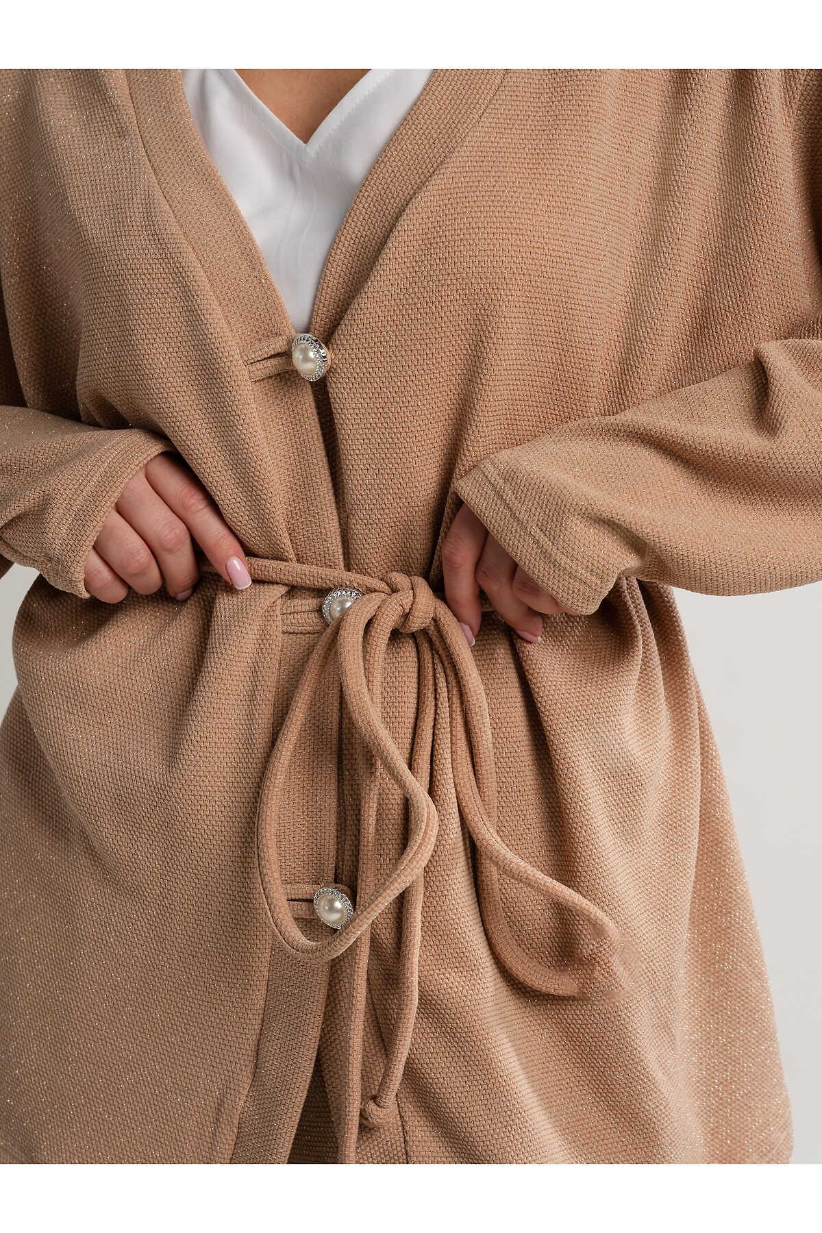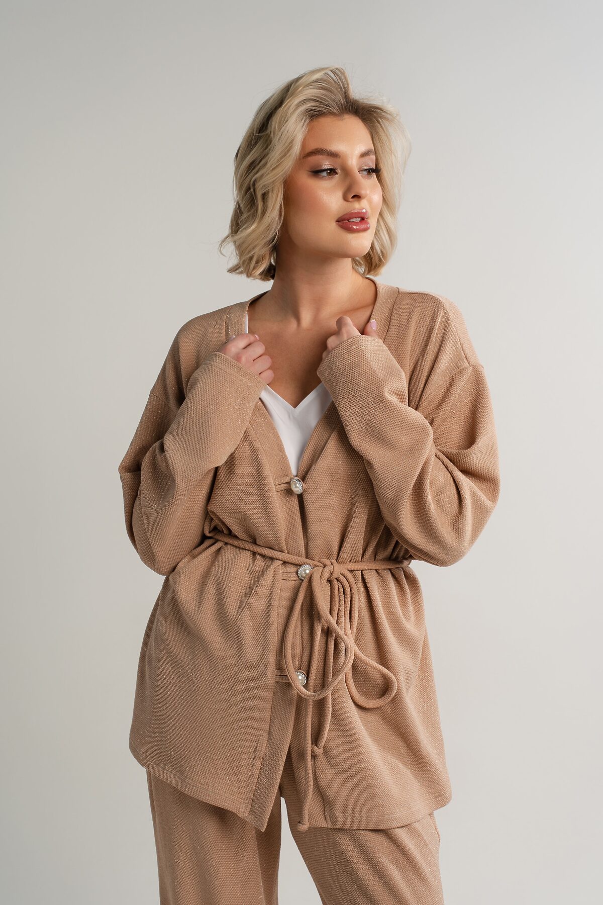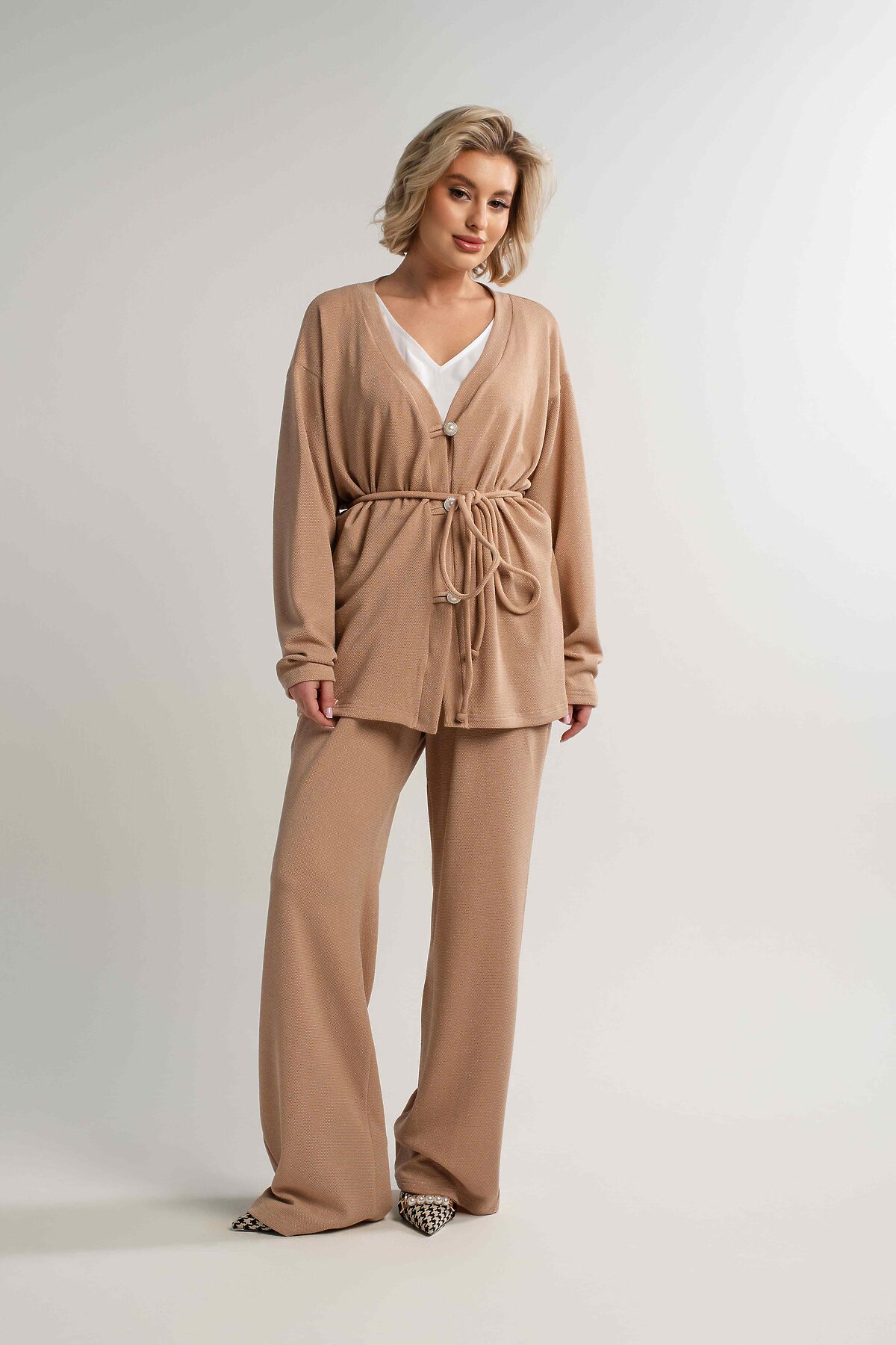 Кардиган свободного силуэта из трикотажного полотна с ниткой люрекс. В комплекте есть съёмный пояс шнур. Центральная застёжка на декоративные пуговицы и воздушные петли. Кардиган можно носить как самостоятельный элемент одежды, либо комплектовать с брюками или юбкой А-силуэта из того же трикотажного полотна.