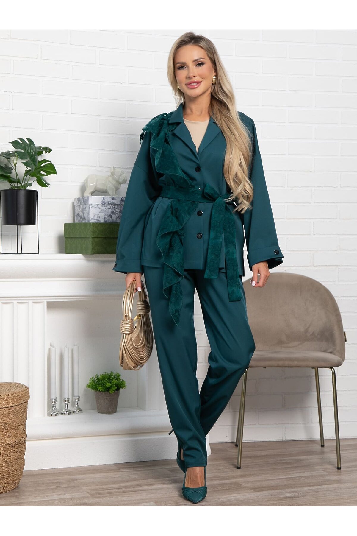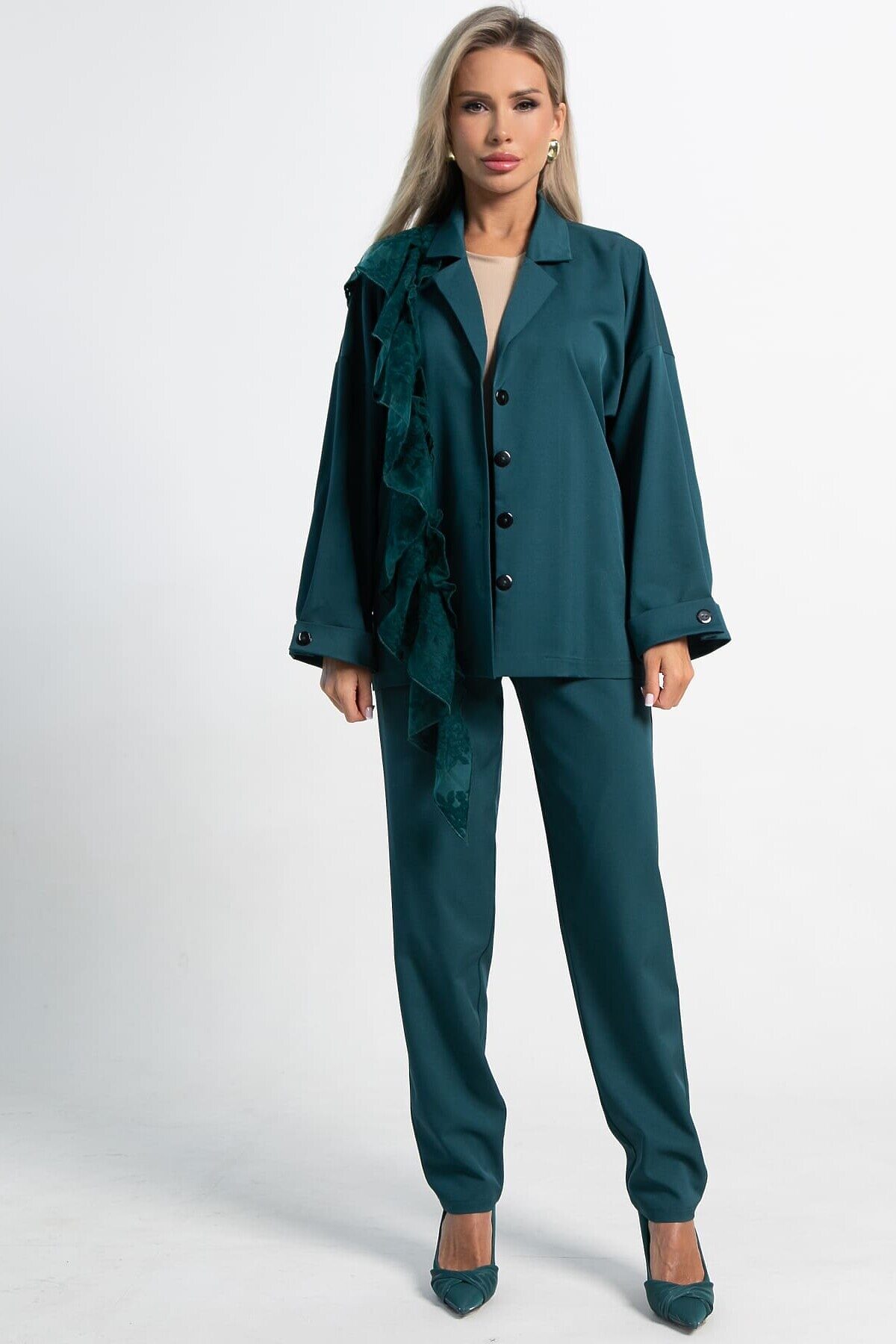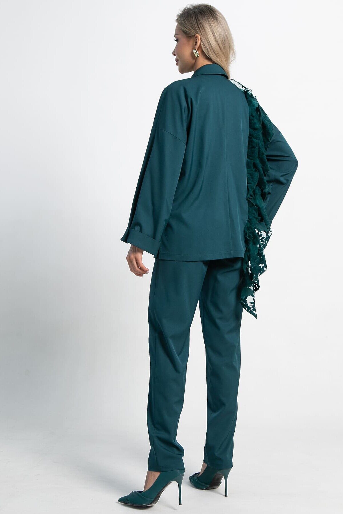 Изысканный женский костюм в изумрудном цвете, который станет воплощением вашей утонченности и безупречного стиля. Сочетание классического жакета с изысканным кружевом и комфортных брюк – идеальный выбор для создания запоминающихся образов. Жакет имеет отложной воротник, который плавно переходит в застежку на пуговицах, создавая изысканный и завершенный образ. Плечевой шов спущен, рукав на манжете украшен пуговицей. Разрезы по боковым швам жакета не только придают ему легкость и свободу движений, но и добавляют стильный акцент. Одна из сторон жакета украшена эффектным воланом из кружева, который придает изделию неповторимую женственность и шарм. В комплекте идет изысканный пояс из кружева, который позволяет подчеркнуть талию и придать образу дополнительную элегантность. Брюки прямого классического кроя – это основа элегантного гардероба. Они прекрасно сидят на любой фигуре и подходят для самых разнообразных случаев. Функциональные боковые карманы добавляют удобства и практичности. Пояс на резинке обеспечивает идеальную посадку и максимальный комфорт в течение всего дня, не стесняя движений. Этот комплект – воплощение женственности и стиля. Жакет с кружевным декором и классические брюки создают гармоничный и элегантный образ, который подойдет как для особых случаев, так и для создания изысканных повседневных луков. Добавьте этот комплект в свой гардероб и почувствуйте себя неотразимой!