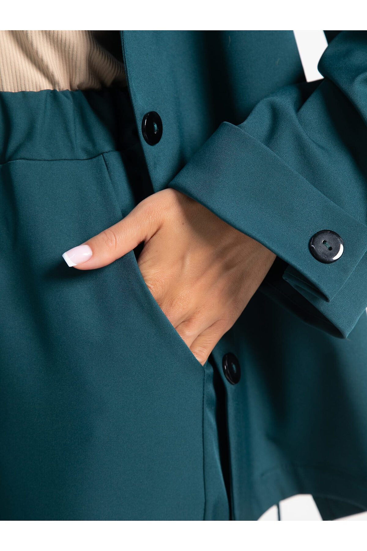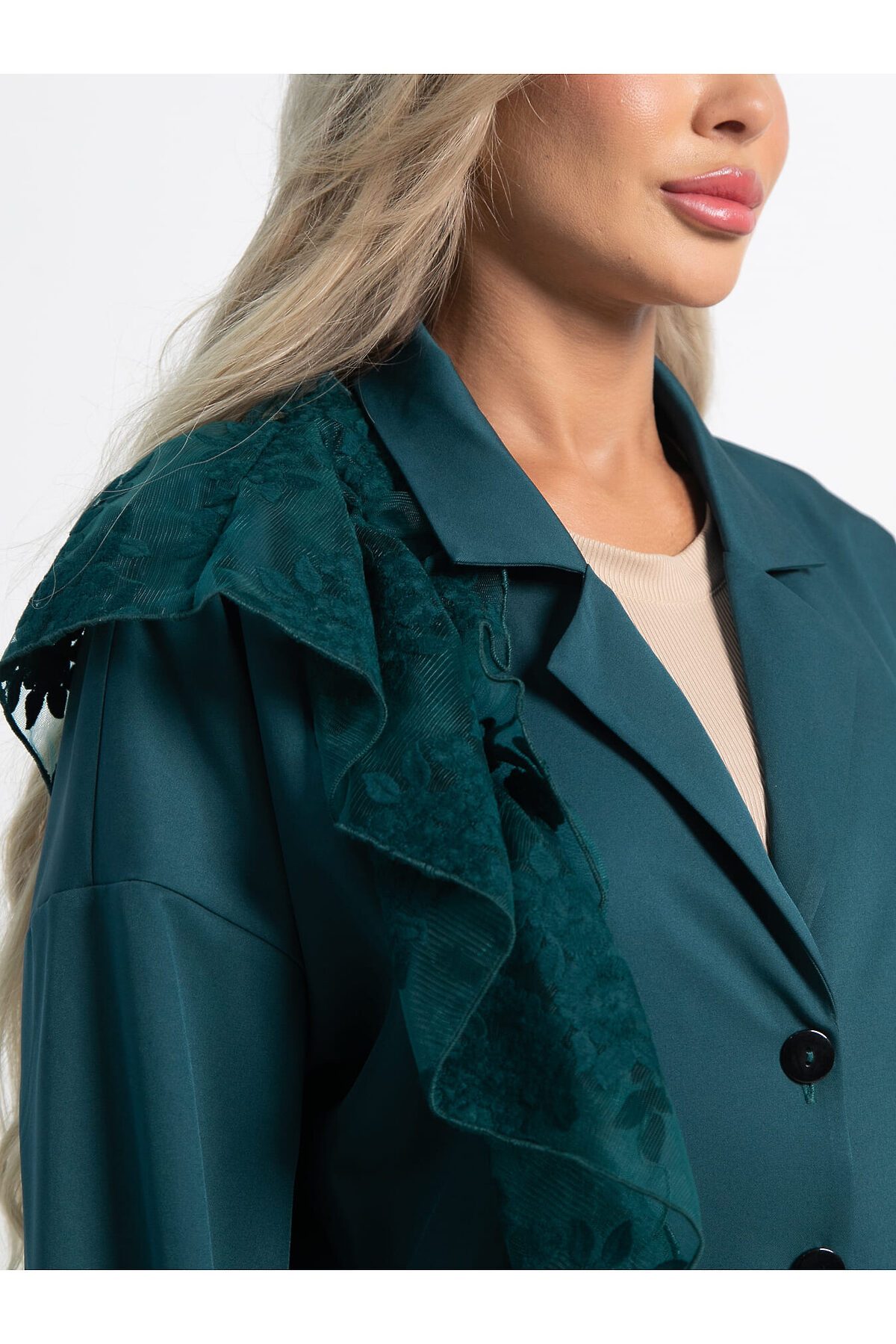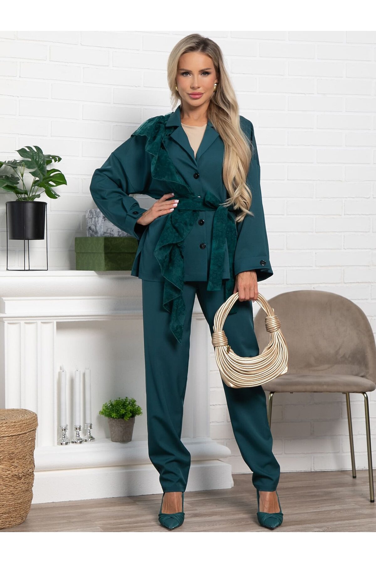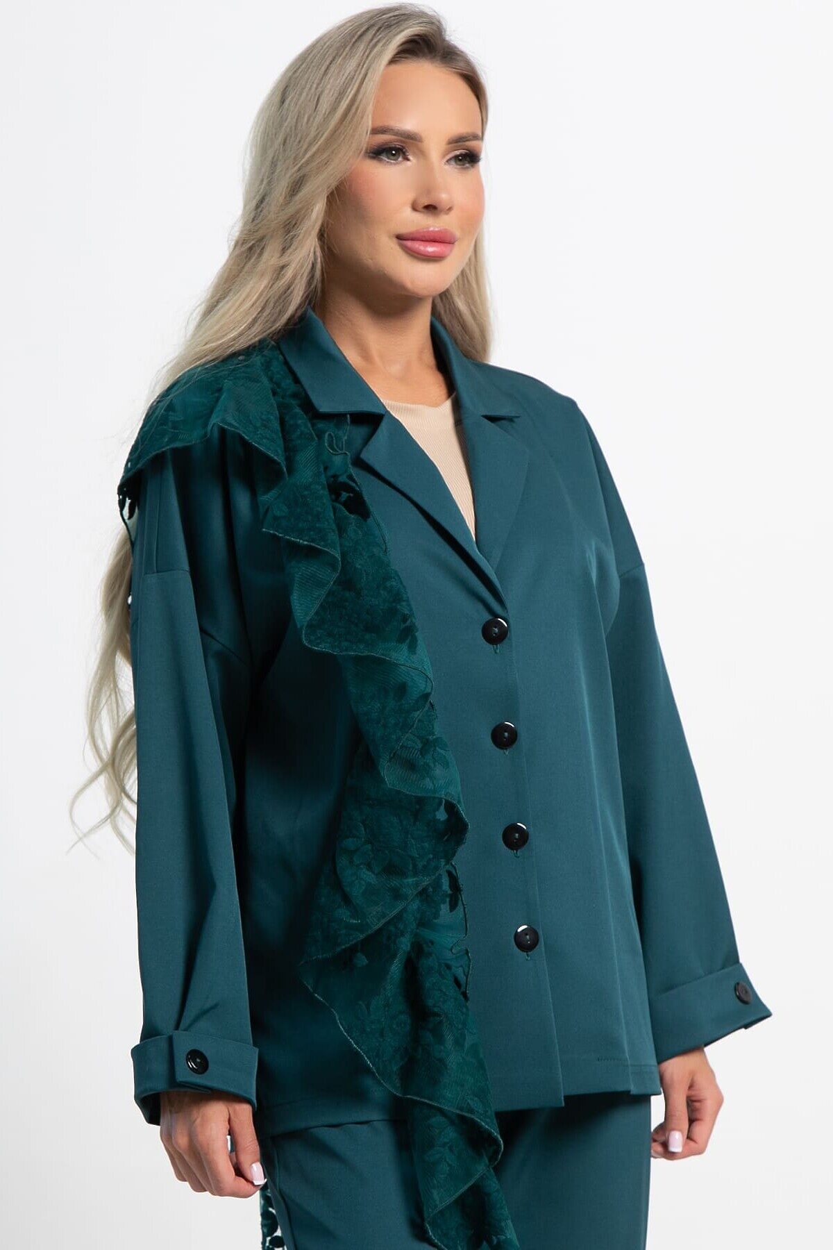 Изысканный женский костюм в изумрудном цвете, который станет воплощением вашей утонченности и безупречного стиля. Сочетание классического жакета с изысканным кружевом и комфортных брюк – идеальный выбор для создания запоминающихся образов. Жакет имеет отложной воротник, который плавно переходит в застежку на пуговицах, создавая изысканный и завершенный образ. Плечевой шов спущен, рукав на манжете украшен пуговицей. Разрезы по боковым швам жакета не только придают ему легкость и свободу движений, но и добавляют стильный акцент. Одна из сторон жакета украшена эффектным воланом из кружева, который придает изделию неповторимую женственность и шарм. В комплекте идет изысканный пояс из кружева, который позволяет подчеркнуть талию и придать образу дополнительную элегантность. Брюки прямого классического кроя – это основа элегантного гардероба. Они прекрасно сидят на любой фигуре и подходят для самых разнообразных случаев. Функциональные боковые карманы добавляют удобства и практичности. Пояс на резинке обеспечивает идеальную посадку и максимальный комфорт в течение всего дня, не стесняя движений. Этот комплект – воплощение женственности и стиля. Жакет с кружевным декором и классические брюки создают гармоничный и элегантный образ, который подойдет как для особых случаев, так и для создания изысканных повседневных луков. Добавьте этот комплект в свой гардероб и почувствуйте себя неотразимой!