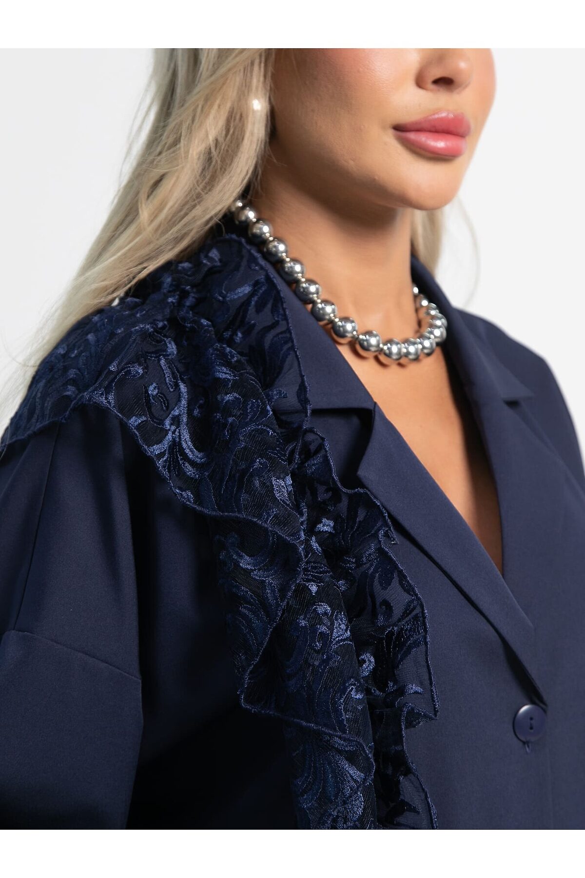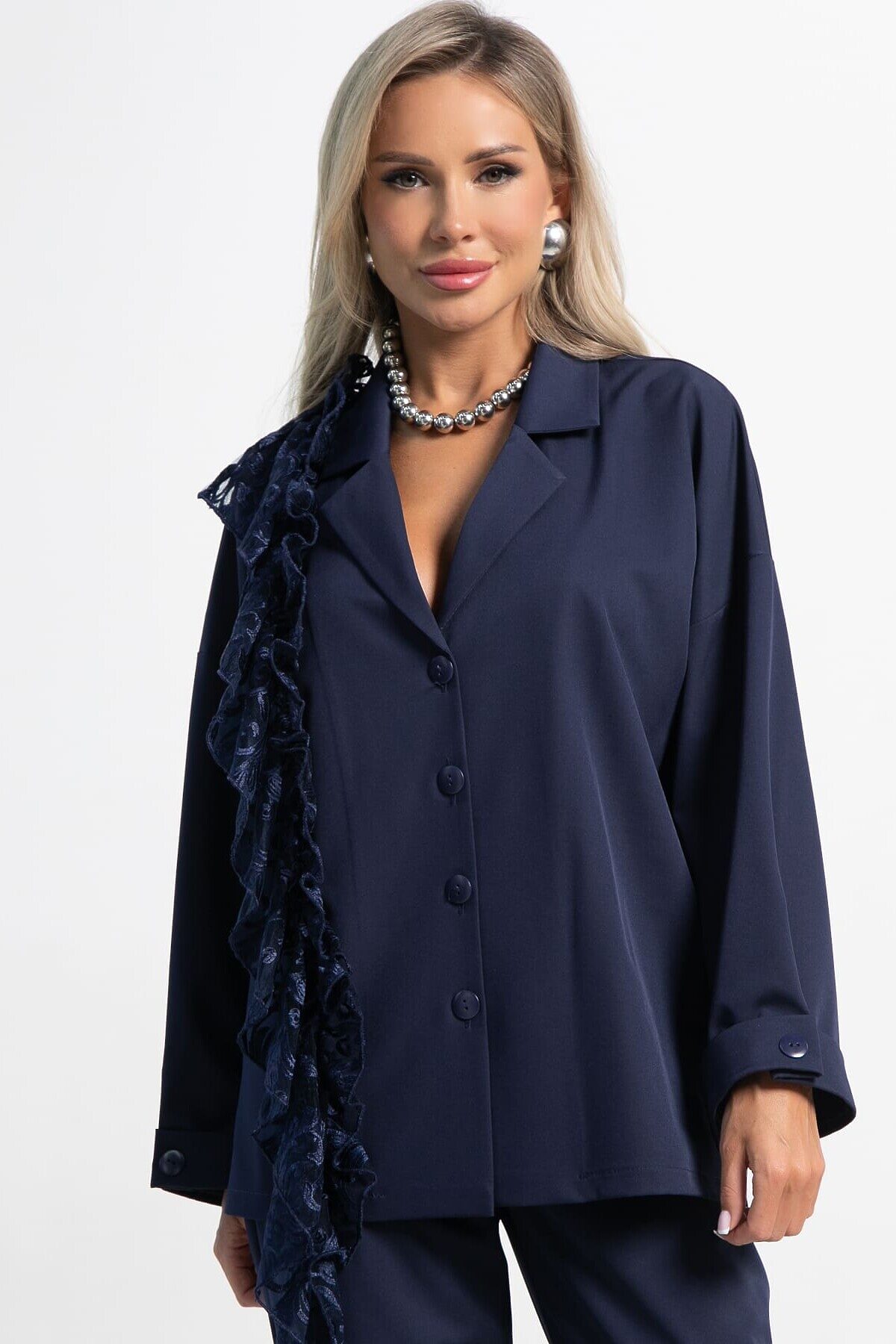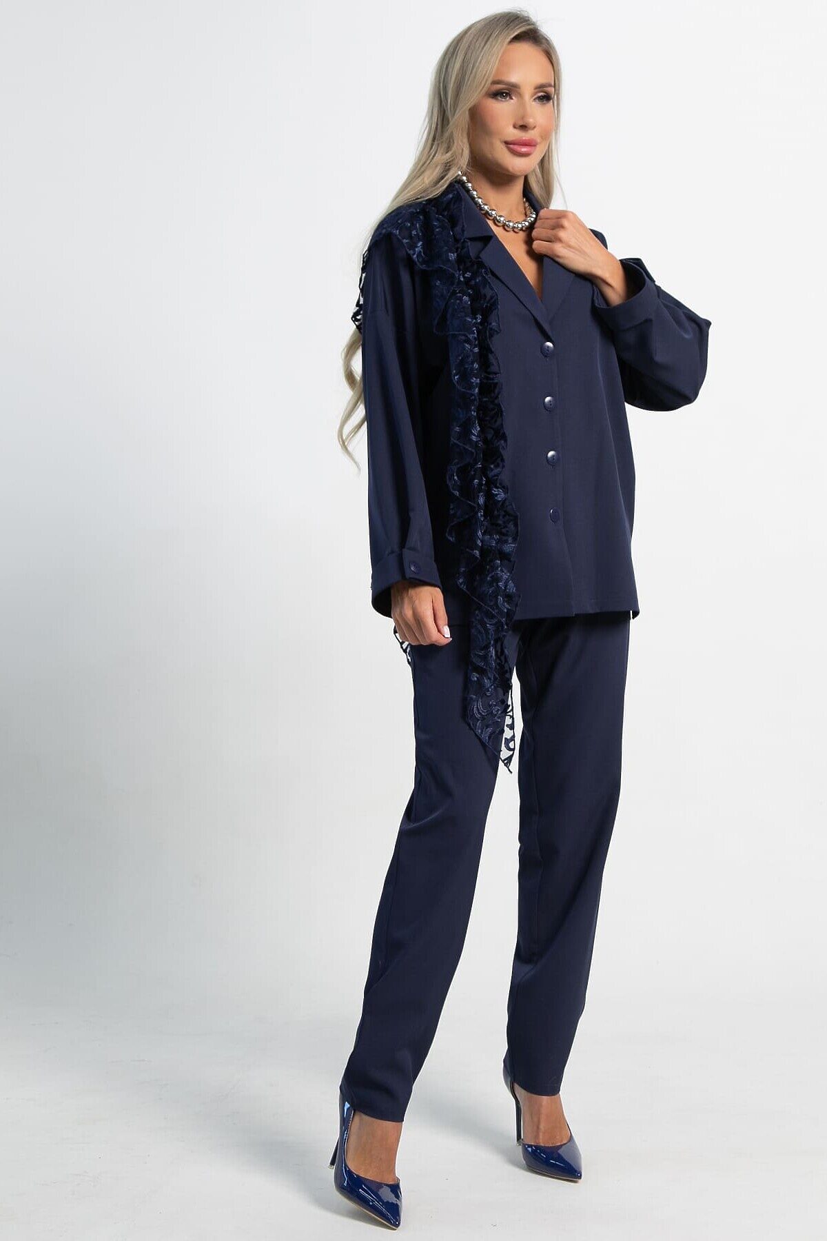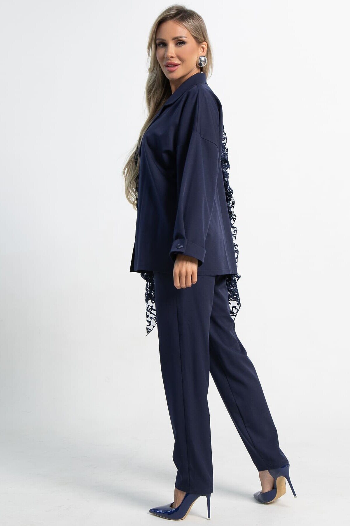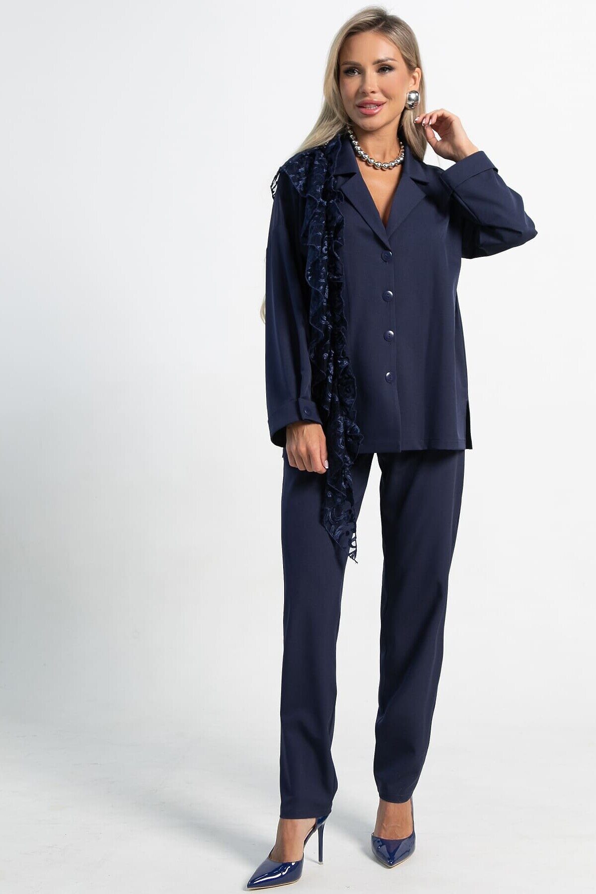 Изысканный женский костюм в темно-синем цвете, который станет воплощением вашей утонченности и безупречного стиля. Сочетание классического жакета с изысканным кружевом и комфортных брюк – идеальный выбор для создания запоминающихся образов. Жакет имеет отложной воротник, который плавно переходит в застежку на пуговицах, создавая изысканный и завершенный образ. Плечевой шов спущен, рукав на манжете украшен пуговицей. Разрезы по боковым швам жакета не только придают ему легкость и свободу движений, но и добавляют стильный акцент. Одна из сторон жакета украшена эффектным воланом из кружева, который придает изделию неповторимую женственность и шарм. В комплекте идет изысканный пояс из кружева, который позволяет подчеркнуть талию и придать образу дополнительную элегантность. Брюки прямого классического кроя – это основа элегантного гардероба. Они прекрасно сидят на любой фигуре и подходят для самых разнообразных случаев. Функциональные боковые карманы добавляют удобства и практичности. Пояс на резинке обеспечивает идеальную посадку и максимальный комфорт в течение всего дня, не стесняя движений. Этот комплект – воплощение женственности и стиля. Жакет с кружевным декором и классические брюки создают гармоничный и элегантный образ, который подойдет как для особых случаев, так и для создания изысканных повседневных луков. Добавьте этот комплект в свой гардероб и почувствуйте себя неотразимой!