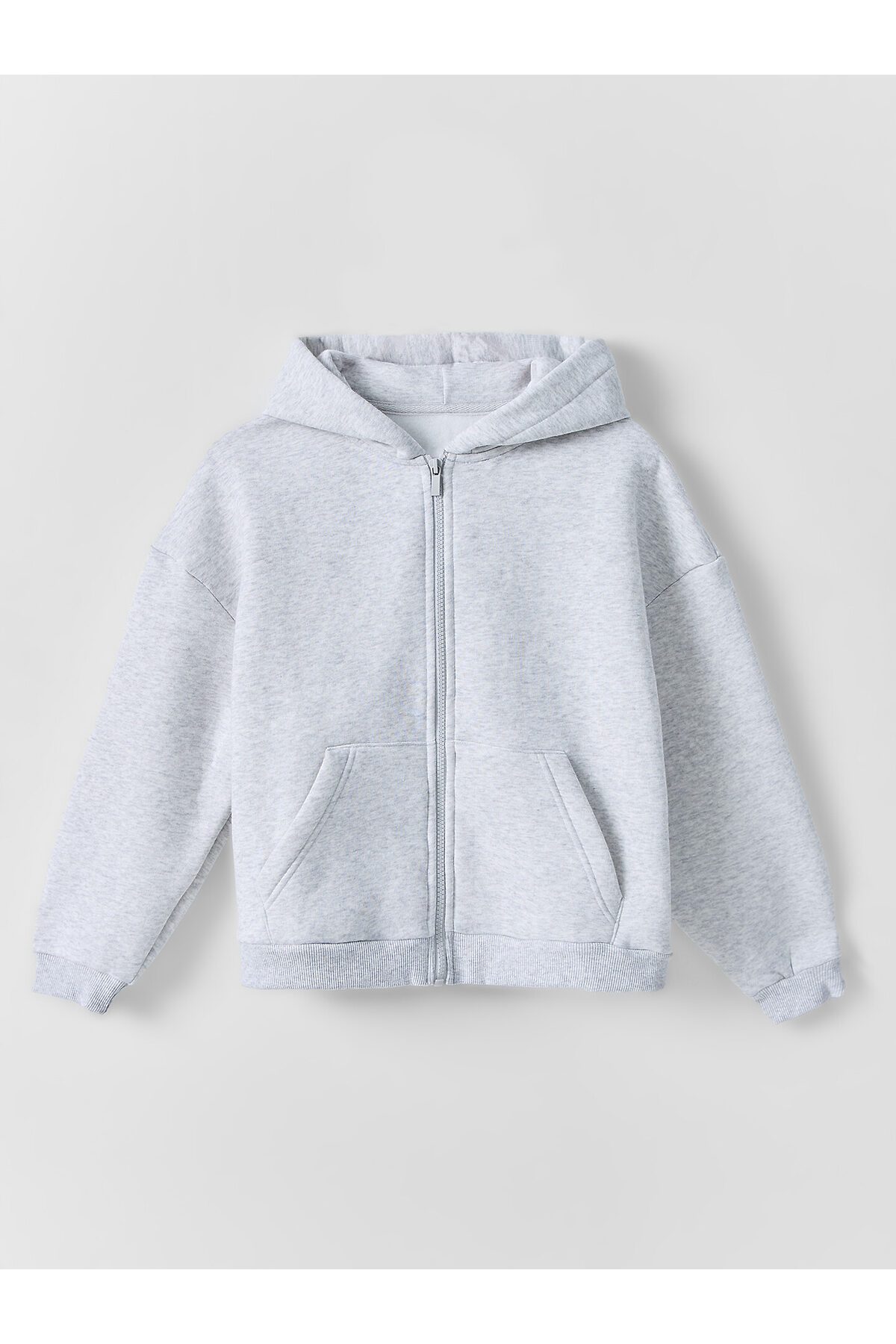 Толстовка свободного силуэта, с капюшоном. Горловина округлой формы. Капюшон на подкладке из основного полотна. Рукава втачные длинные, плечо спущено. По низу рукава отрезная манжета из рибаны. Центральная застежка на тесьму молнию. По переду накладные карманы кенгуру. Пояс отрезной из рибаны.