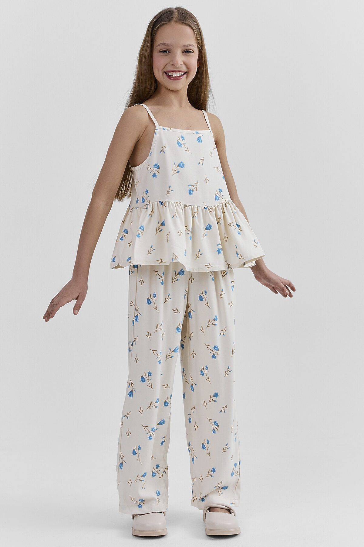 Комплект состоит из топа и брюк. Топ с узкими бретелями и с воланом на сборке по низу. Брюки прямые с цельнокроенным поясом. Внутрь пояса застрочена эластичная тесьма. Низ изделия обработан швом в подгибку с закрытым срезом.