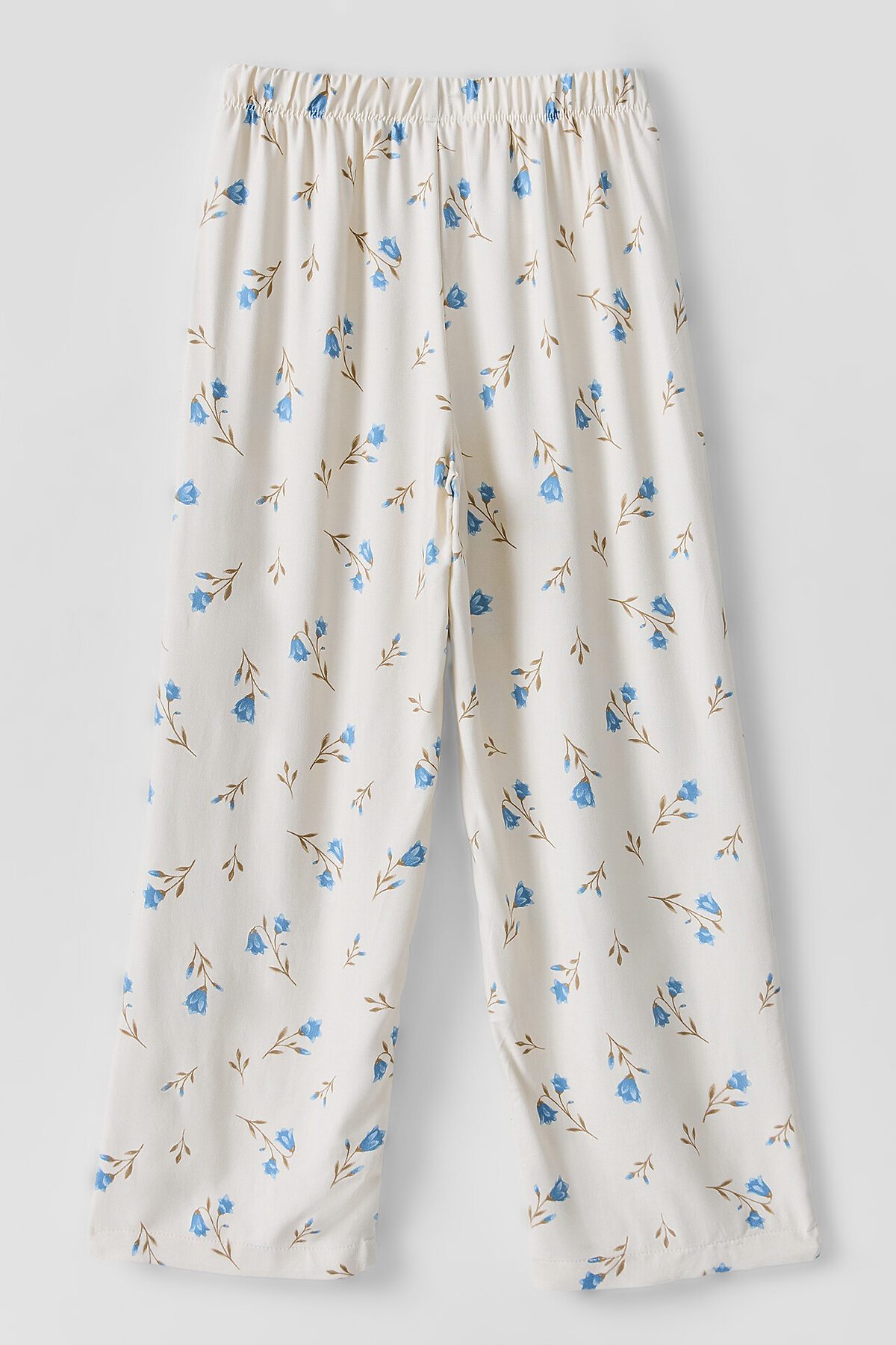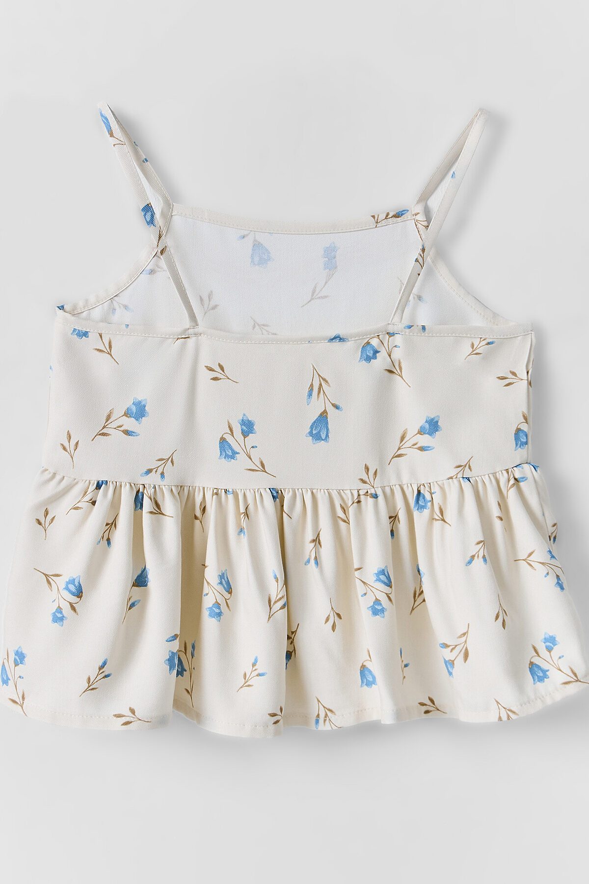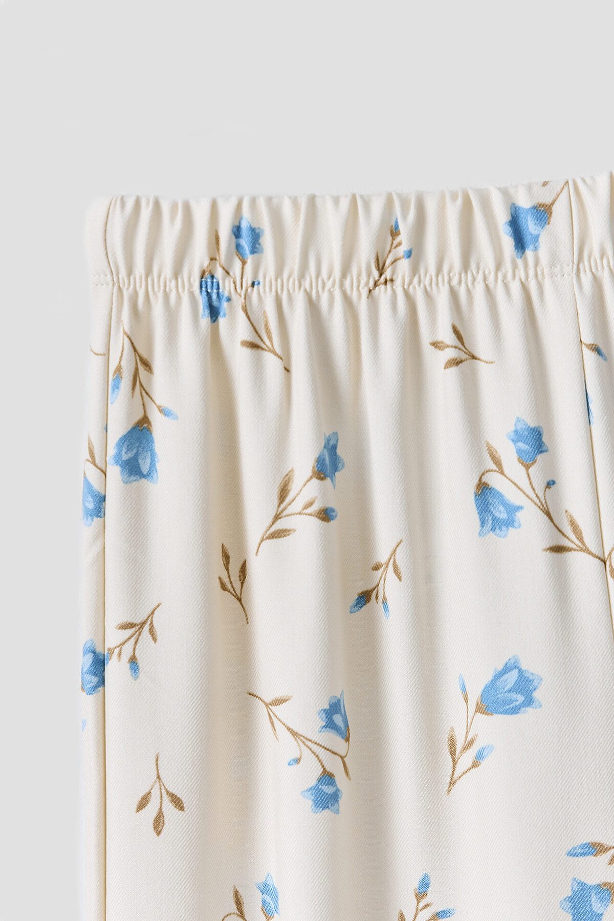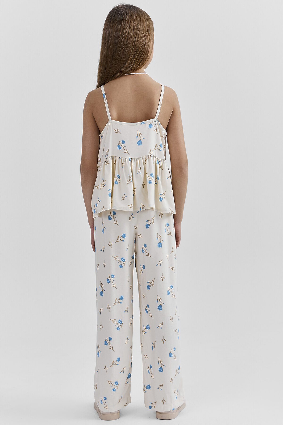 Комплект состоит из топа и брюк. Топ с узкими бретелями и с воланом на сборке по низу. Брюки прямые с цельнокроенным поясом. Внутрь пояса застрочена эластичная тесьма. Низ изделия обработан швом в подгибку с закрытым срезом.