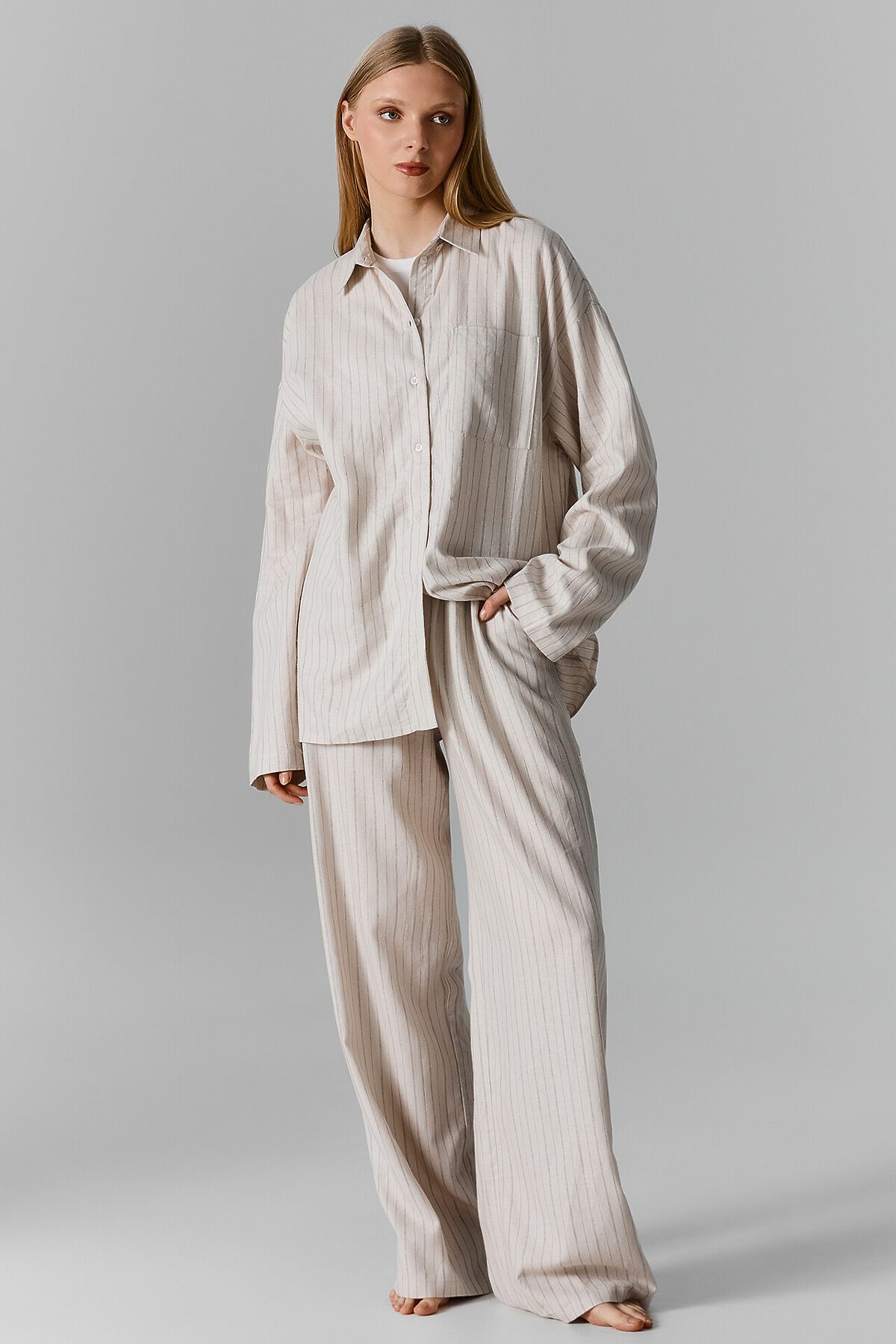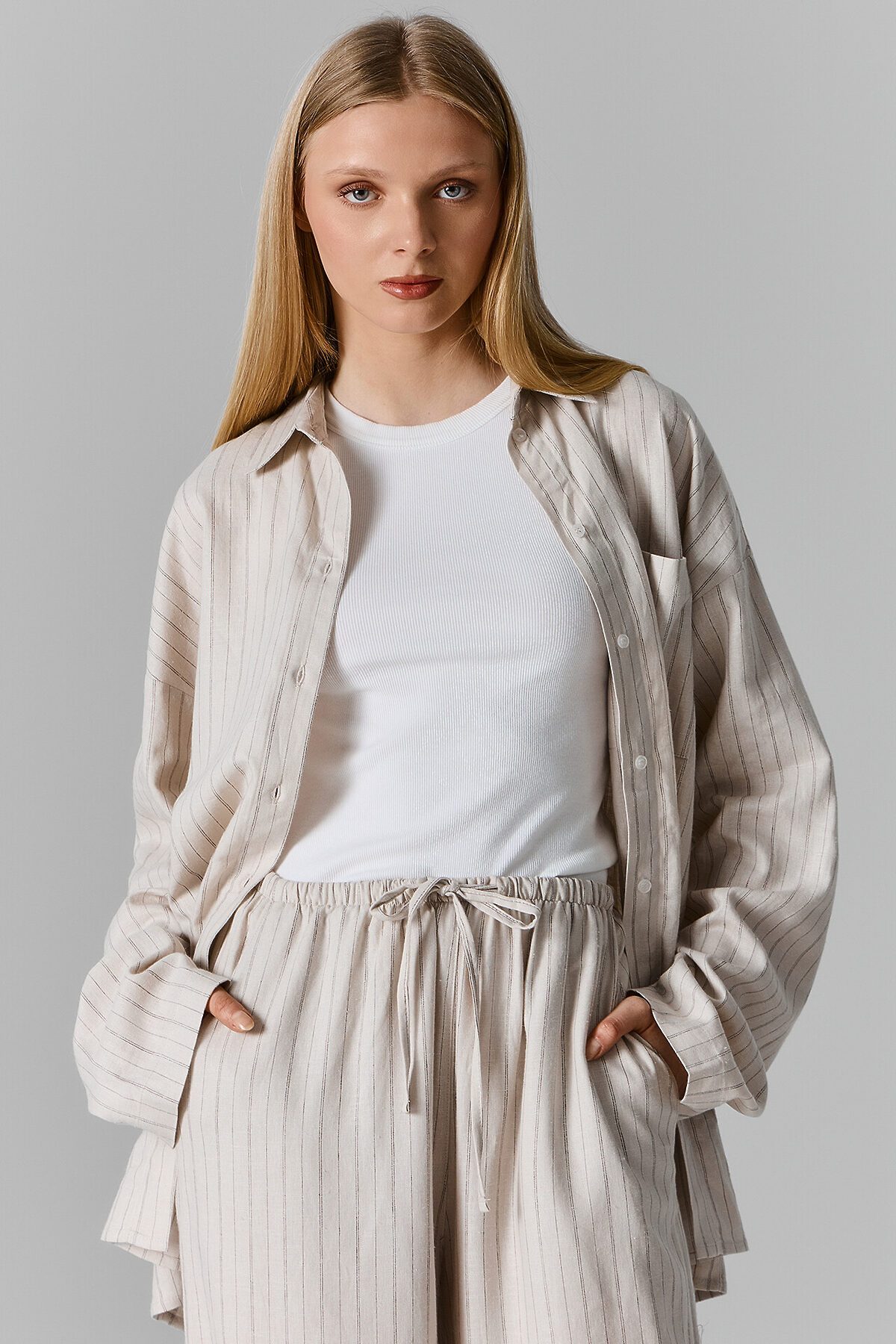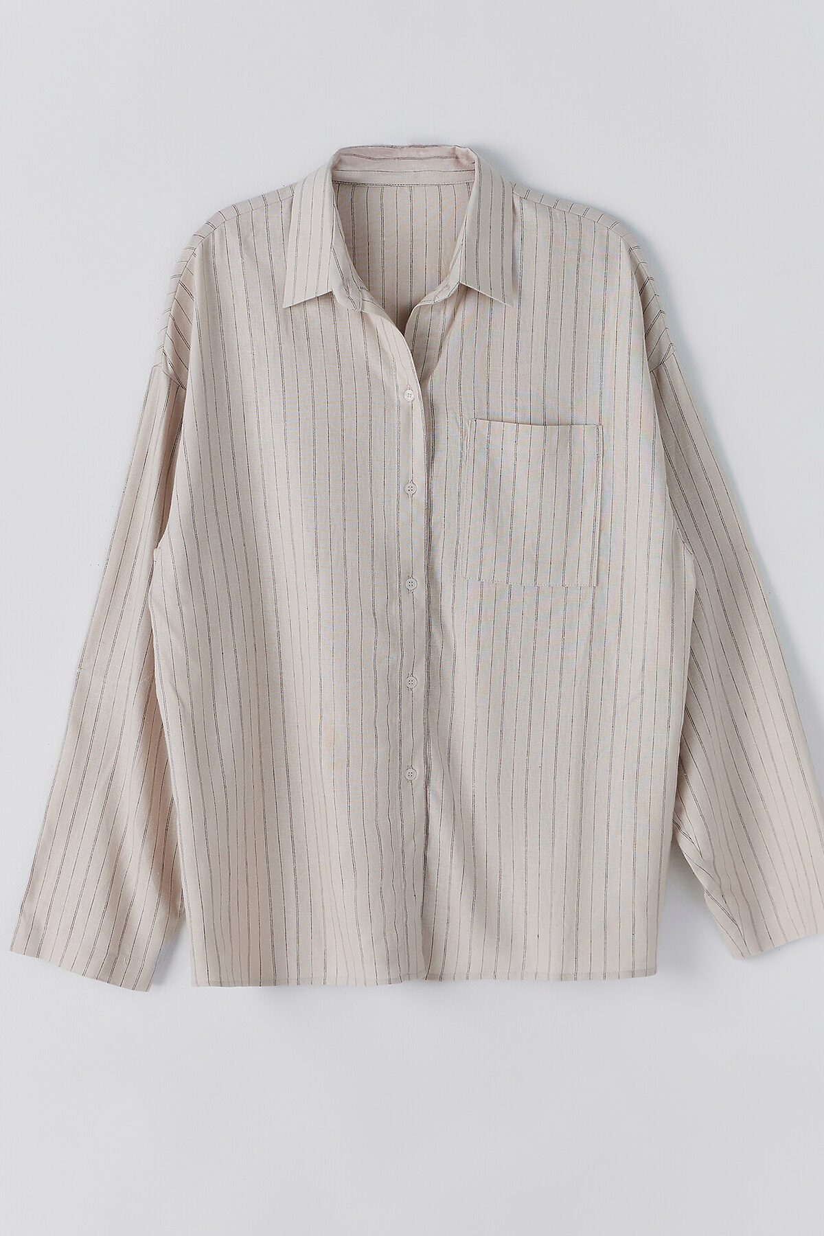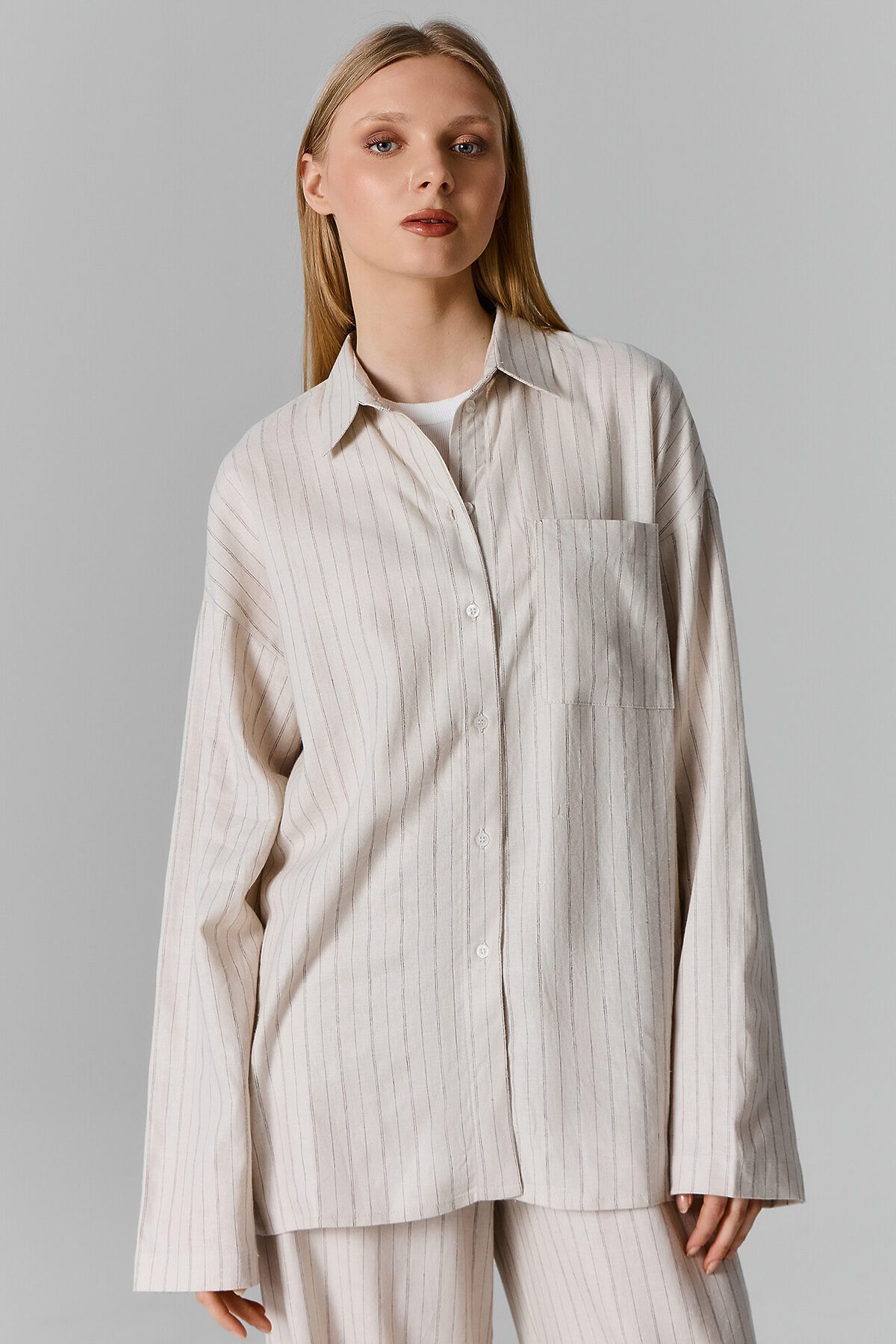Женская рубашка свободного силуэта — это сочетание легкости, стиля и комфорта. Модель с воротником-стойкой добавляет современный акцент, а спущенное плечо и длинные рукава создают непринужденный и расслабленный образ. Центральная застёжка на пуговицах спереди делает модель функциональной, а накладной карман на груди добавляет интересный штрих и практичность. Прямой низ и обработка срезов швом вподгибку придают рубашке аккуратный и завершенный вид. Материал, состоящий из льна с добавлением вискозы, обеспечивает комфорт, воздухопроницаемость и мягкость, что делает эту рубашку идеальной для носки в любое время года. Она станет универсальной частью гардероба, легко сочетаясь с джинсами, брюками или юбками, создавая стильные образы на каждый день. Отличный выбор для тех, кто ценит практичность и элегантность!