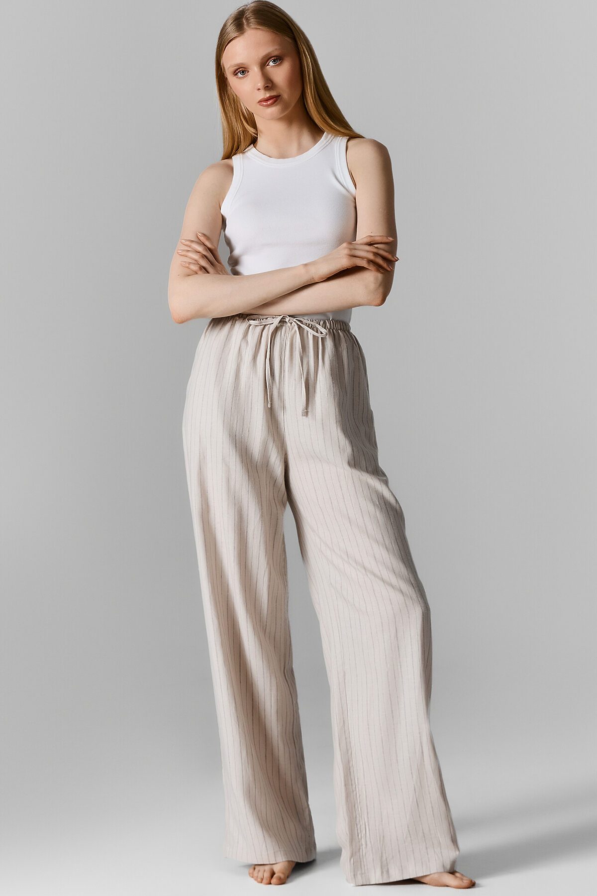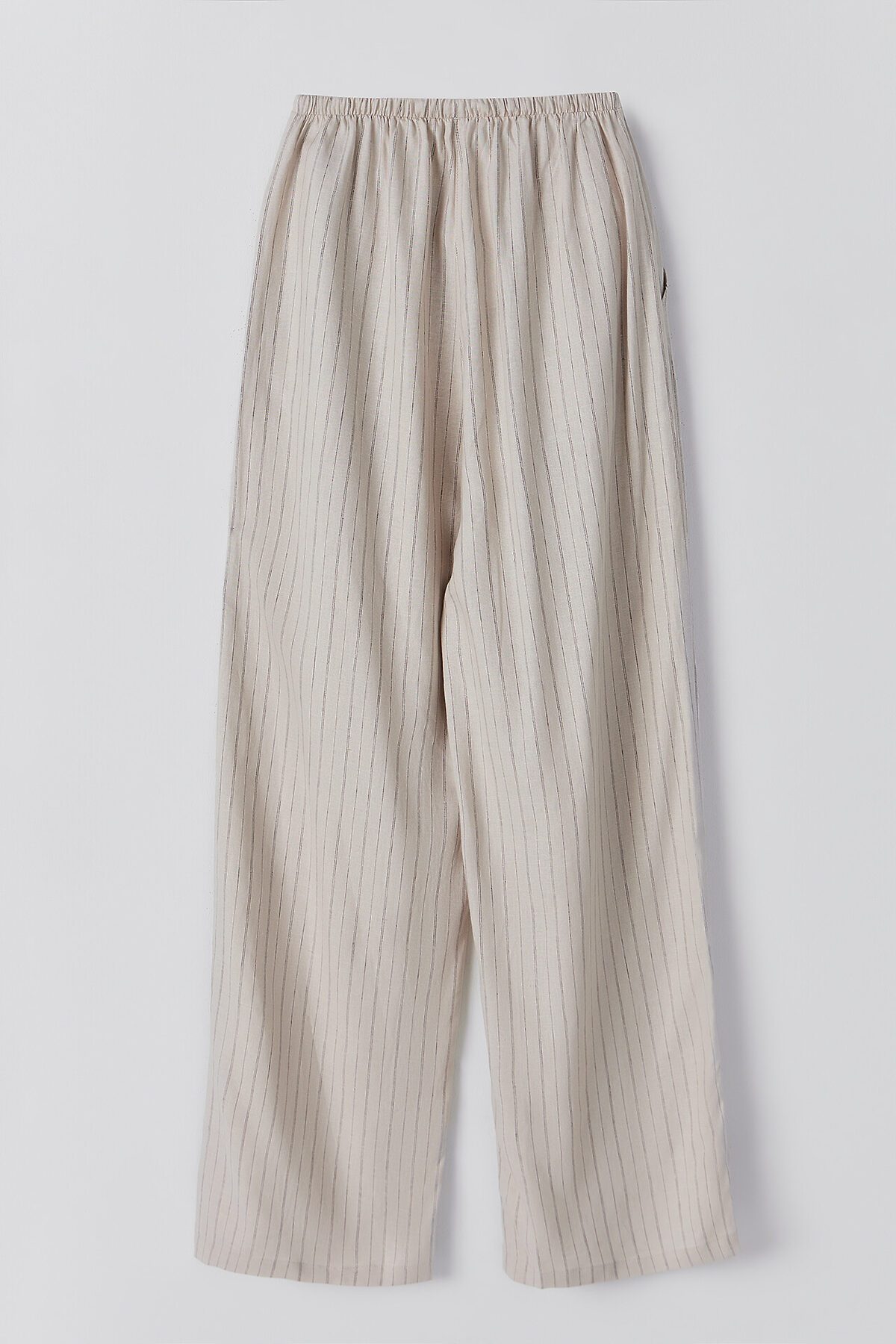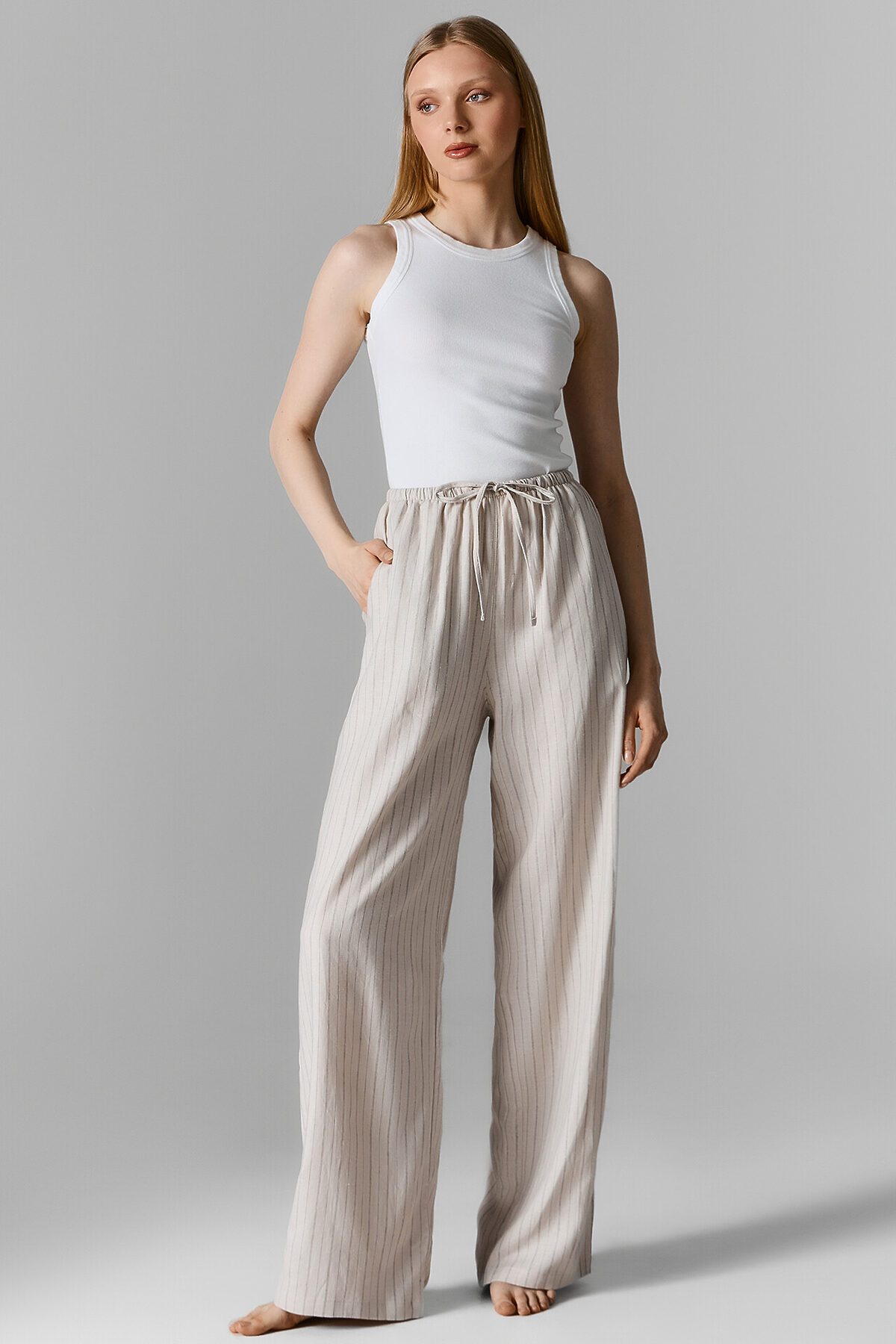 Классический дизайн в полоску и светлый цвет делают эти брюки универсальным элементом домашнего гардероба. Они легко комбинируются с различными топами, футболками или рубашками, позволяя создавать стильные и комфортные образы для расслабленных дней.