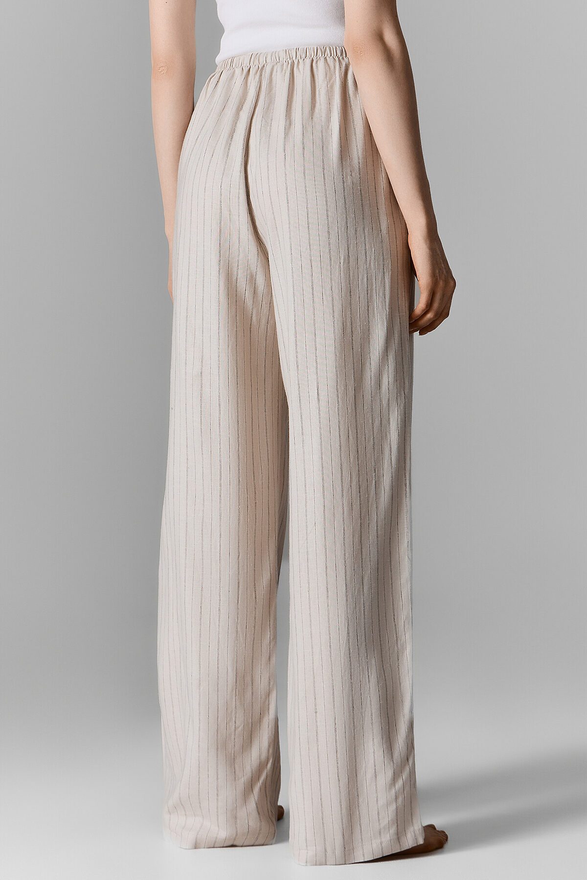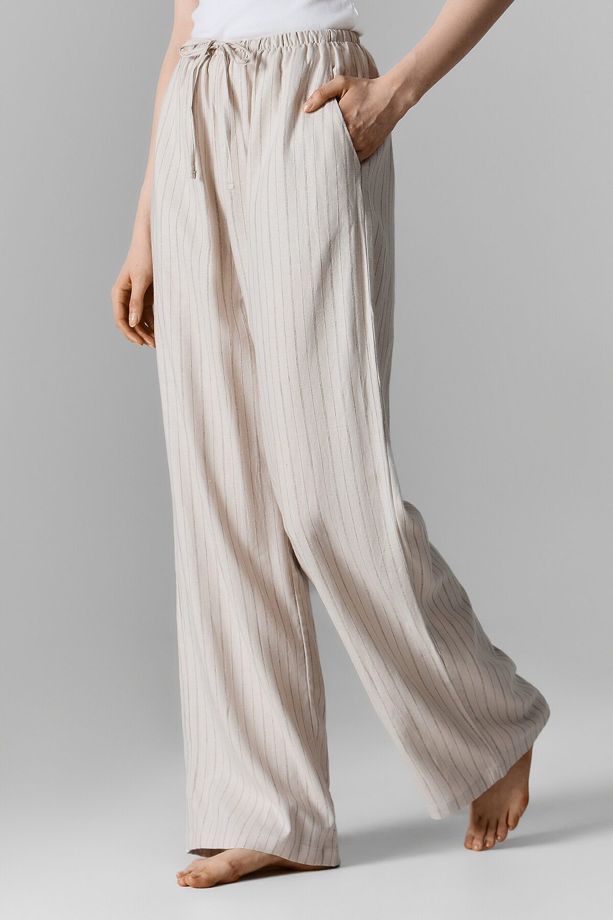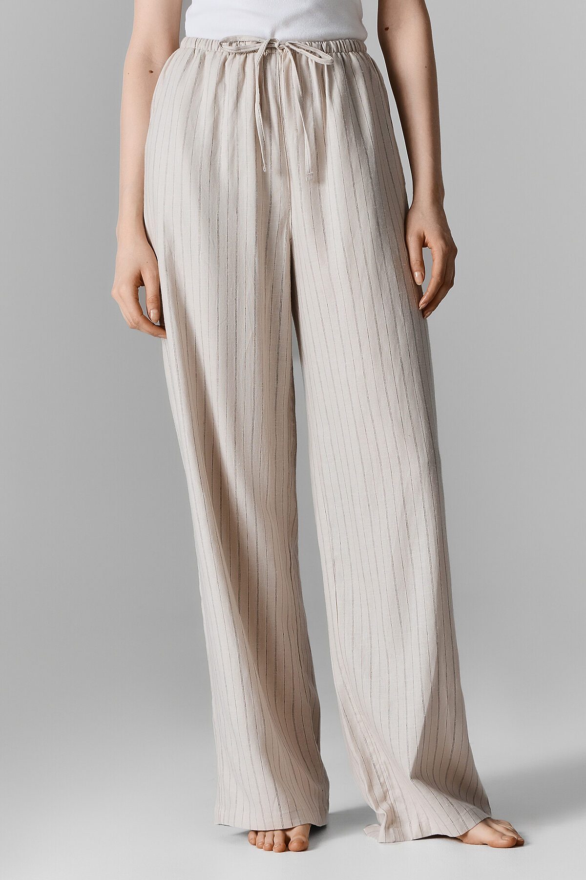 Классический дизайн в полоску и светлый цвет делают эти брюки универсальным элементом домашнего гардероба. Они легко комбинируются с различными топами, футболками или рубашками, позволяя создавать стильные и комфортные образы для расслабленных дней.