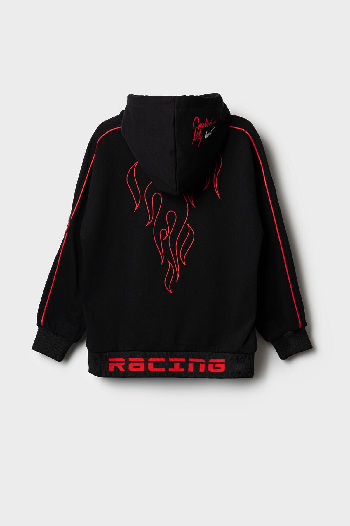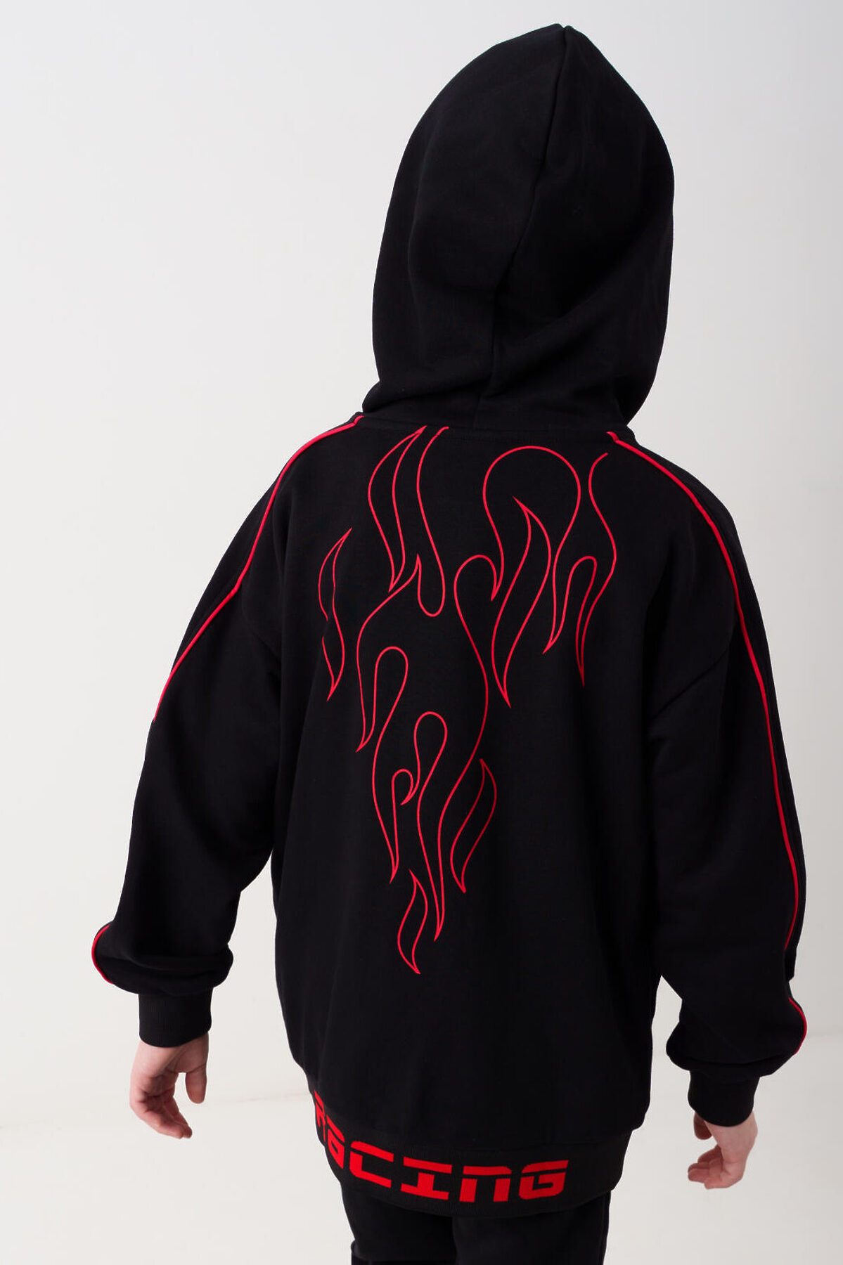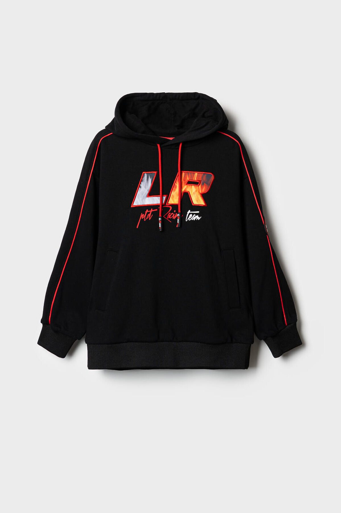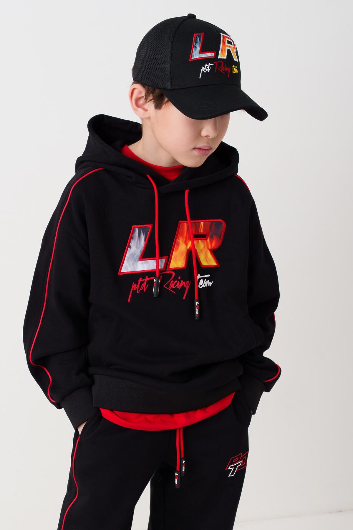Худи оверсайз для мальчика подростка. Выполнено из хлопкового футера без начеса. На груди — крупный логотип и надписи, вдохновлённые мотоспортом. Капюшон регулируется шнурком, а на передней части расположен удобный карман-кенгуру. Манжеты и низ изделия выполнены из эластичного риба, что обеспечивает комфортную посадку. На правом рукаве — яркий силиконовый ярлык.