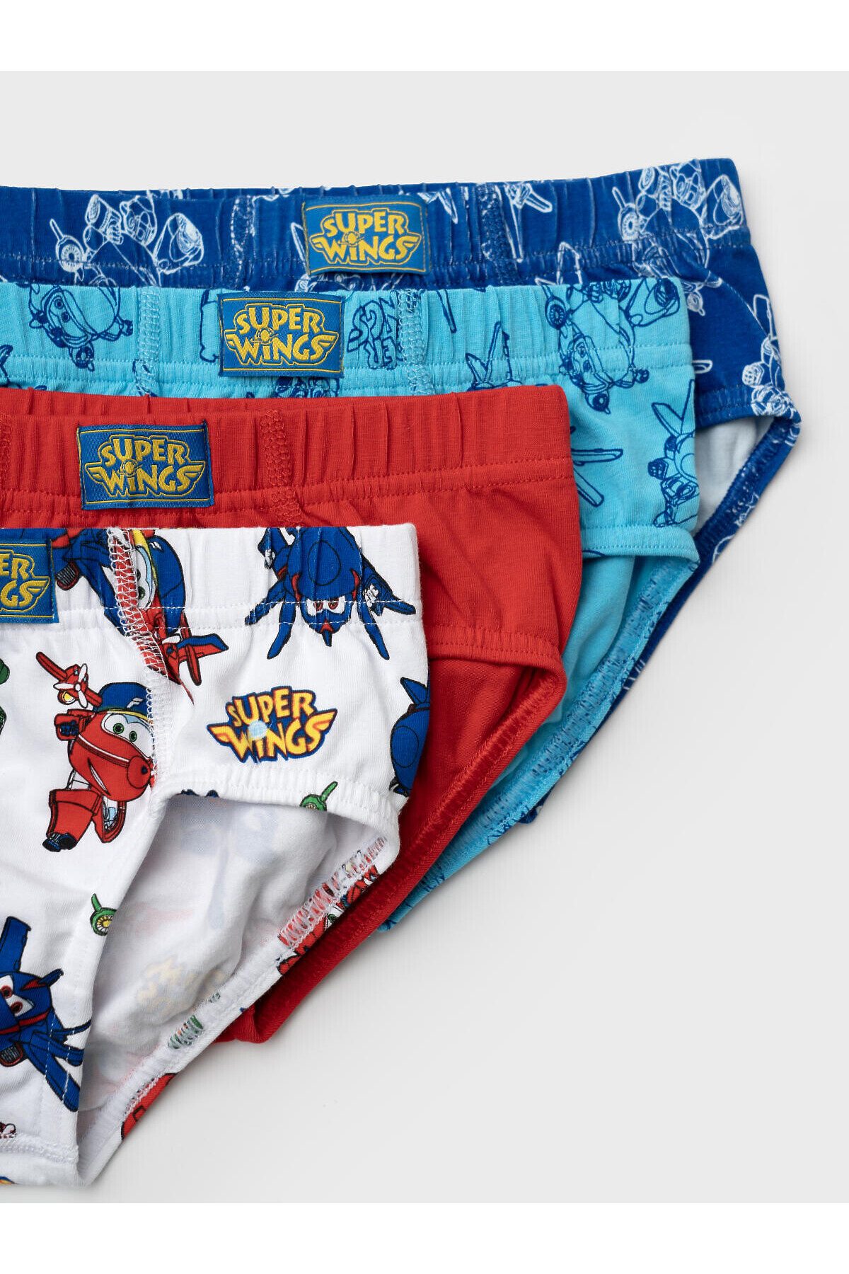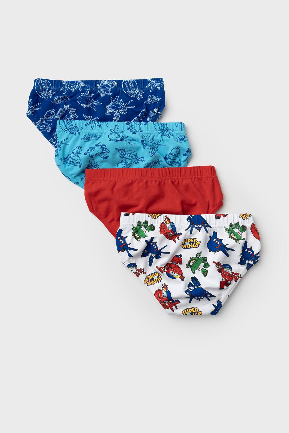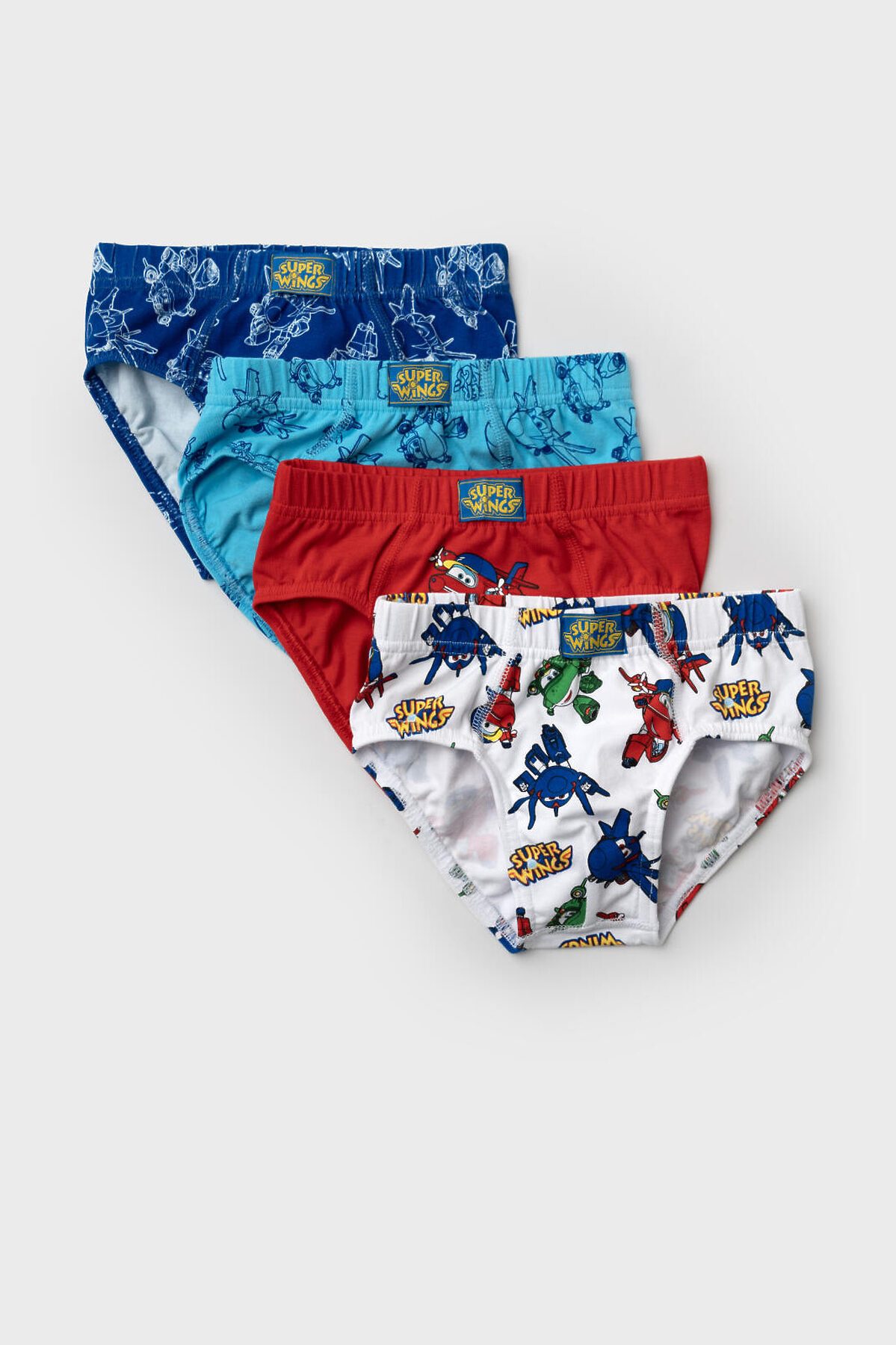 Набор из четырех детских трусов-брифов для мальчика. У изделий удобный эластичный пояс, мягкие обработанные края пройм и анатомическая вставка спереди. Такой крой обеспечивает хорошую посадку и комфорт в носке. Принт с любимыми мультяшными героями - Super Wings. Материал - хлопковый, мягкий трикотаж.