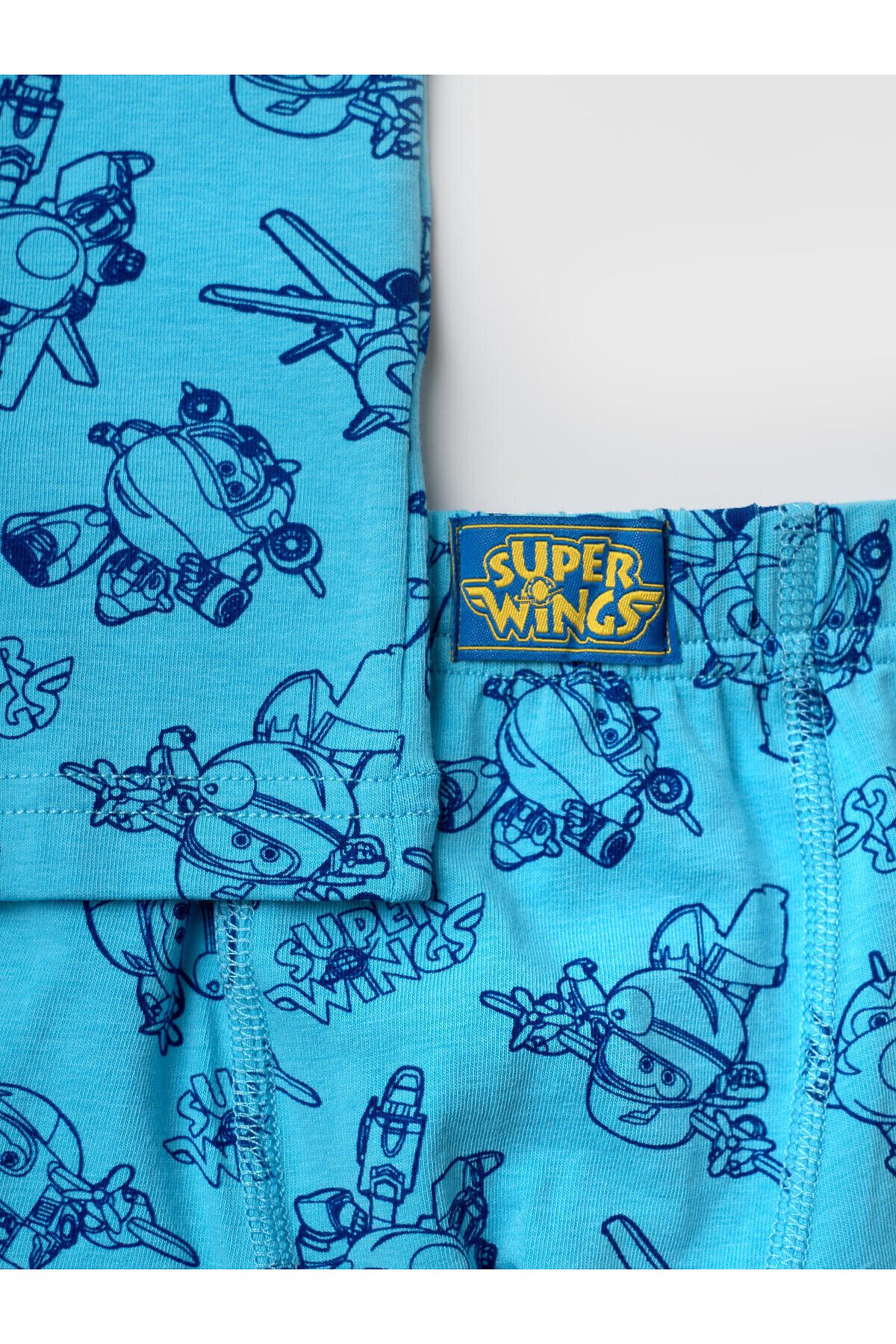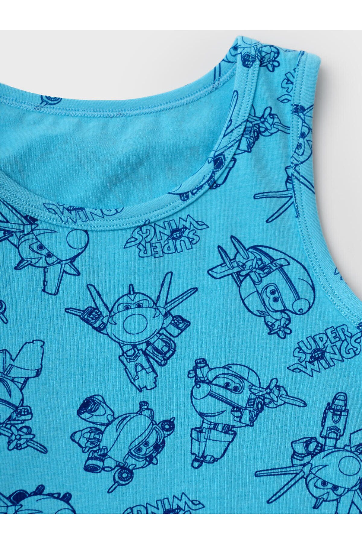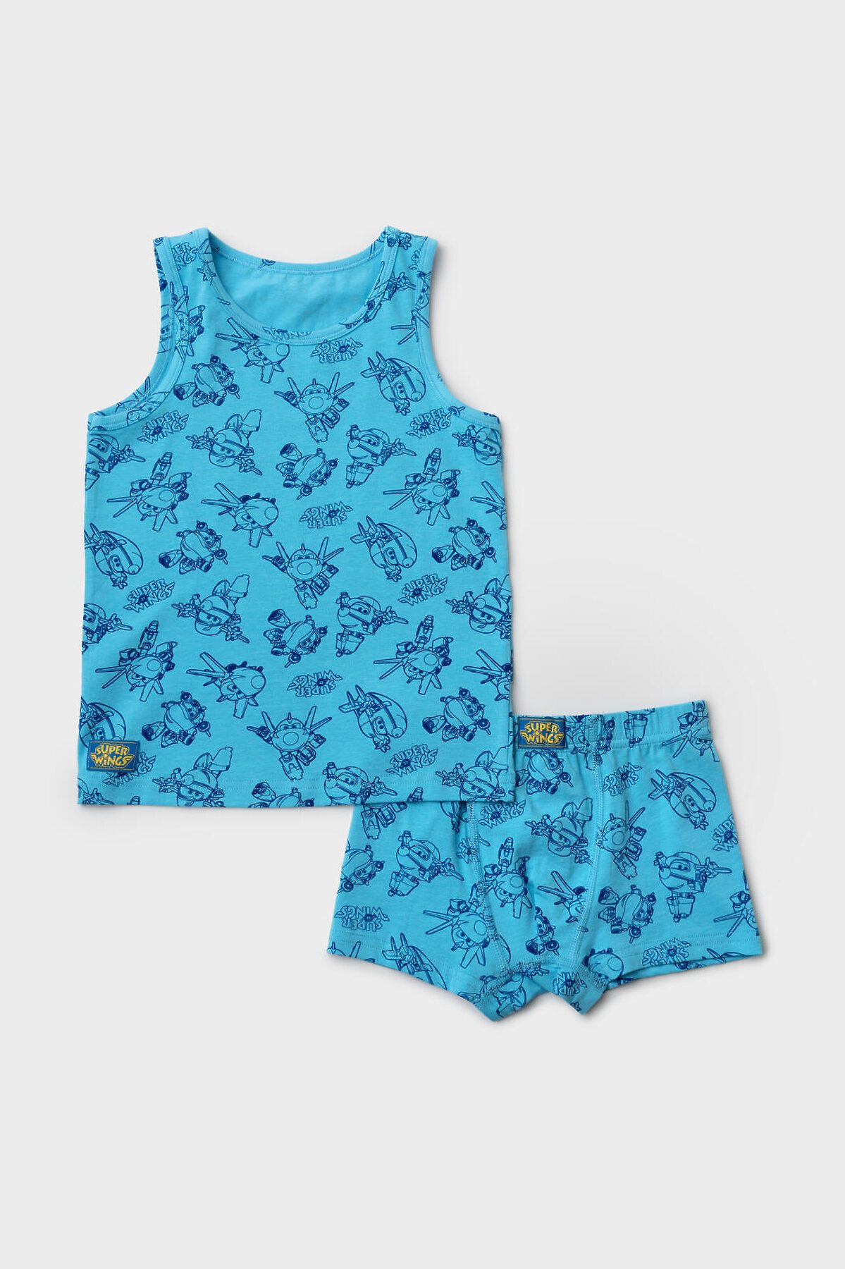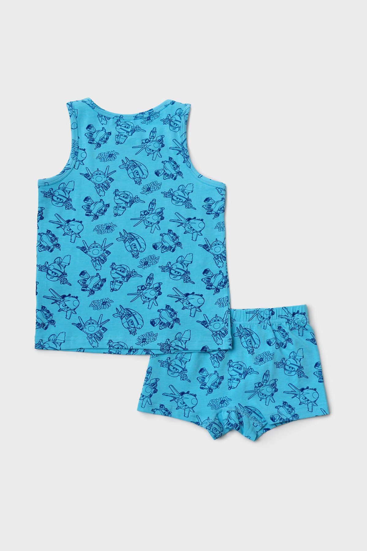 Детский комплект для мальчика, состоящий из майки и трусов-боксеров. Майка без рукавов, с классической круглой горловиной и ярким принтом с героями мультфильма "Super Wings". Пояс трусов выполнен из эластичной тесьмы для удобной посадки. Комплект выполнен из приятного хлопкового трикотажа.