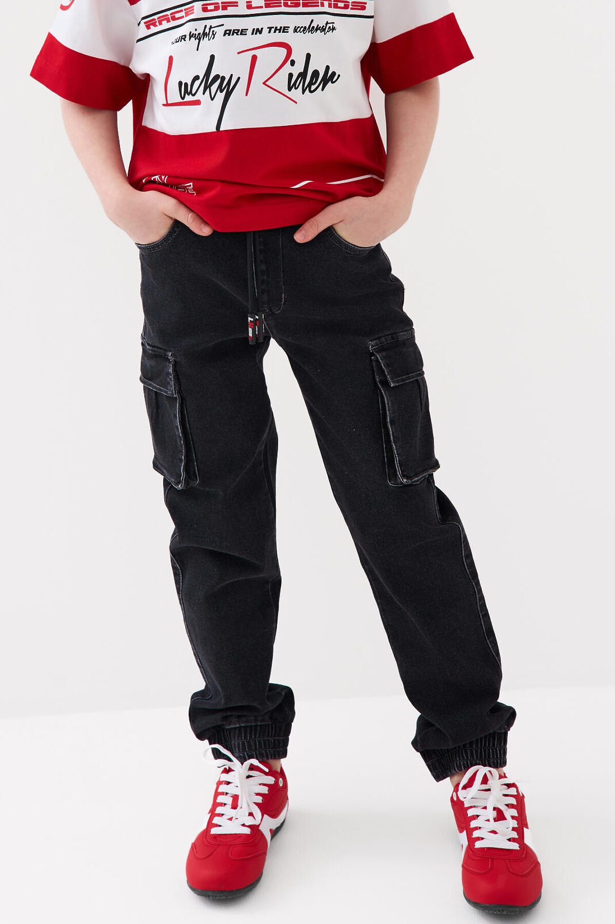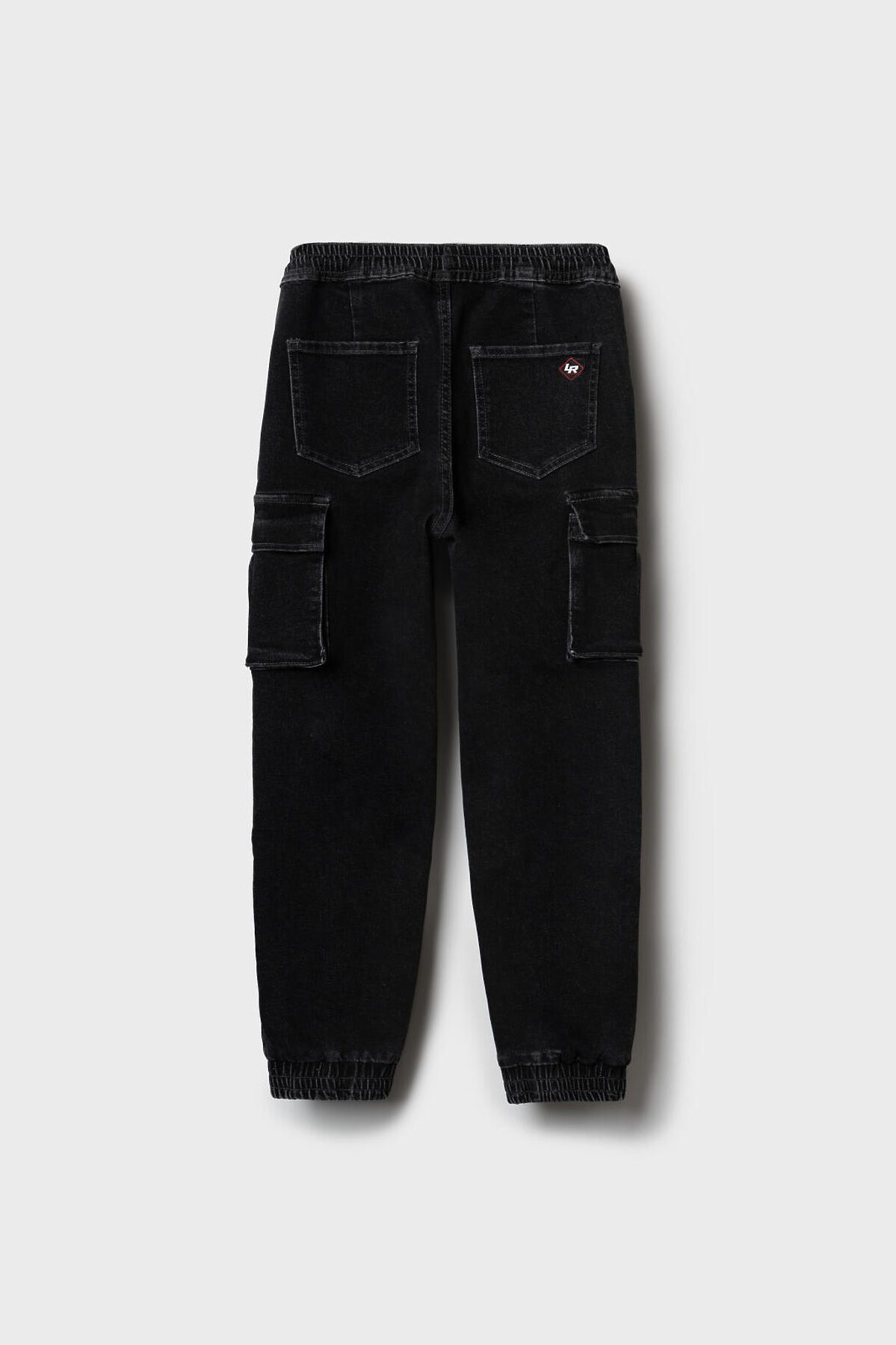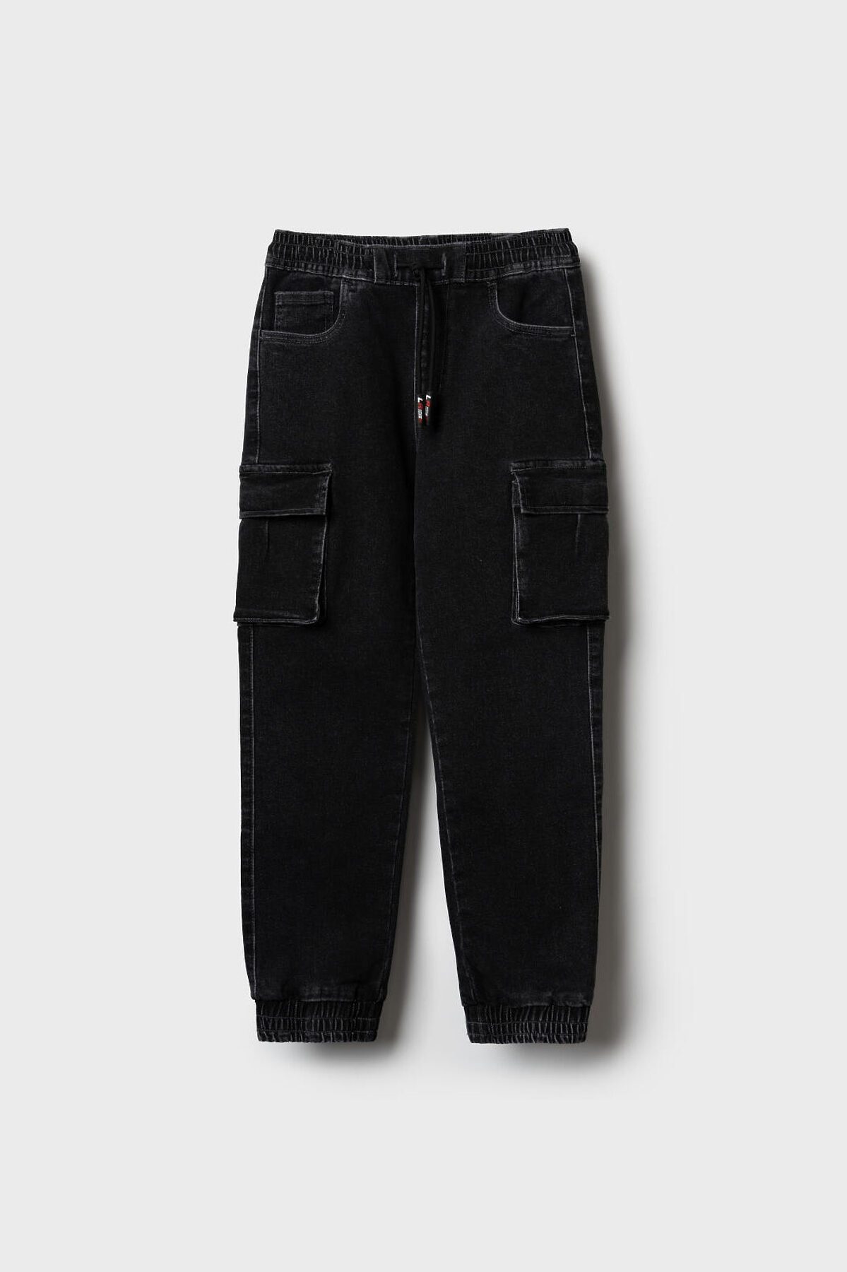 Джинсы-джоггеры для мальчика подростка, выполненные из сверхудобного эластичного материала Loop Denim. Loop denim имеет внешний вид классической джинсы, а по тактильным ощущениям мягкий и комфортный, как трикотаж. Свободный крой с заужением к низу. Пояс на резинке с утягивающим шнурком. Объёмные боковые накладные карманы с клапанами на липучке. Сзади — два накладных кармана. Низ брюк собран на резинку. По брюкам расположены декоративные складки и строчки, имитирующие заломы. На заднем кармане — силиконовая нашивка с логотипом.