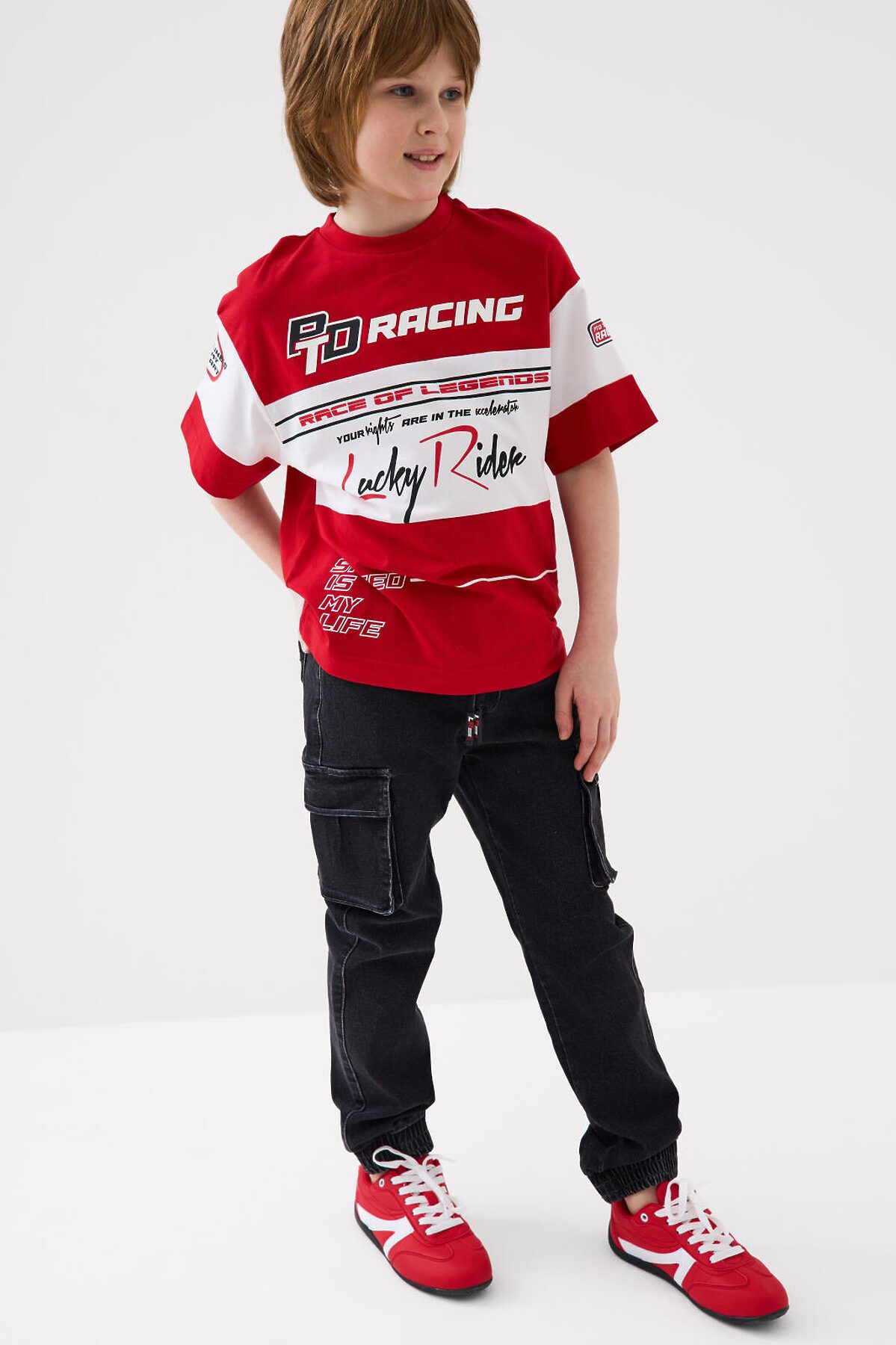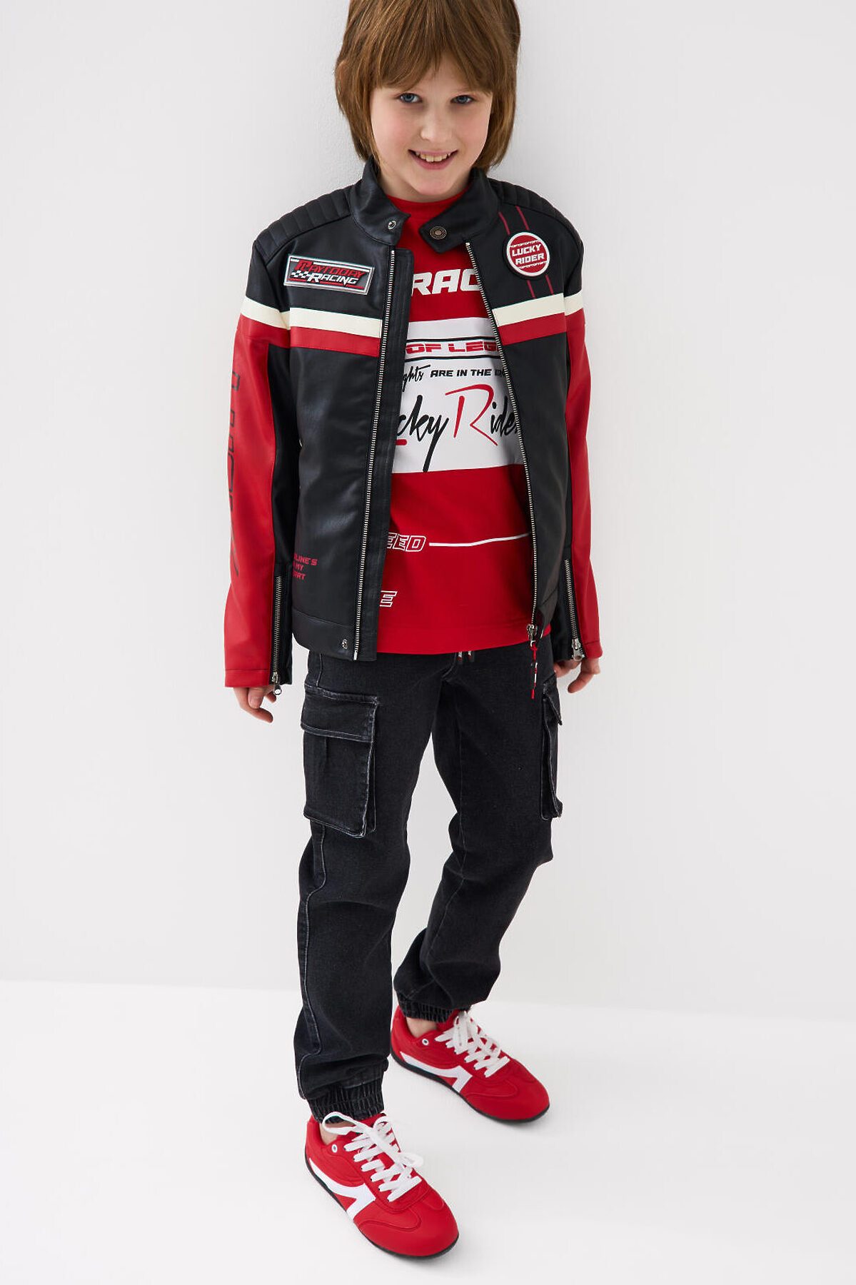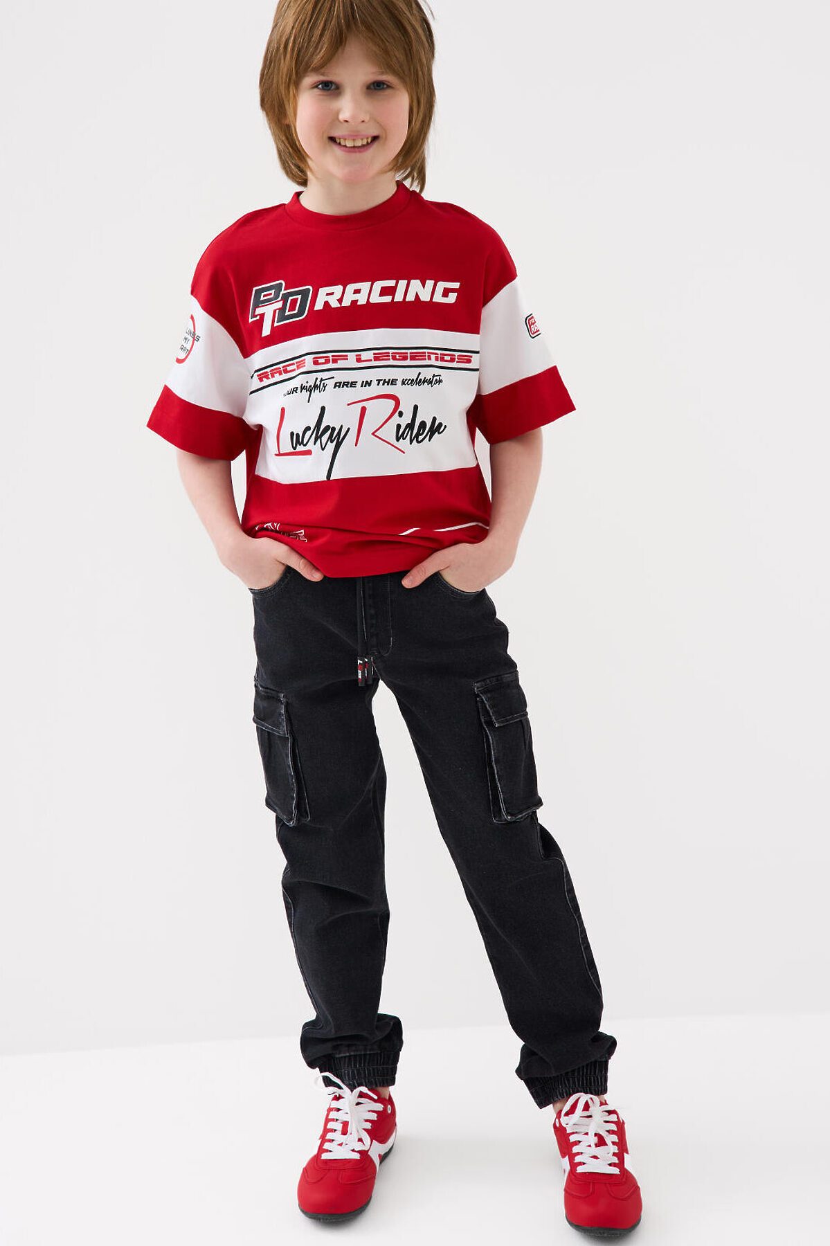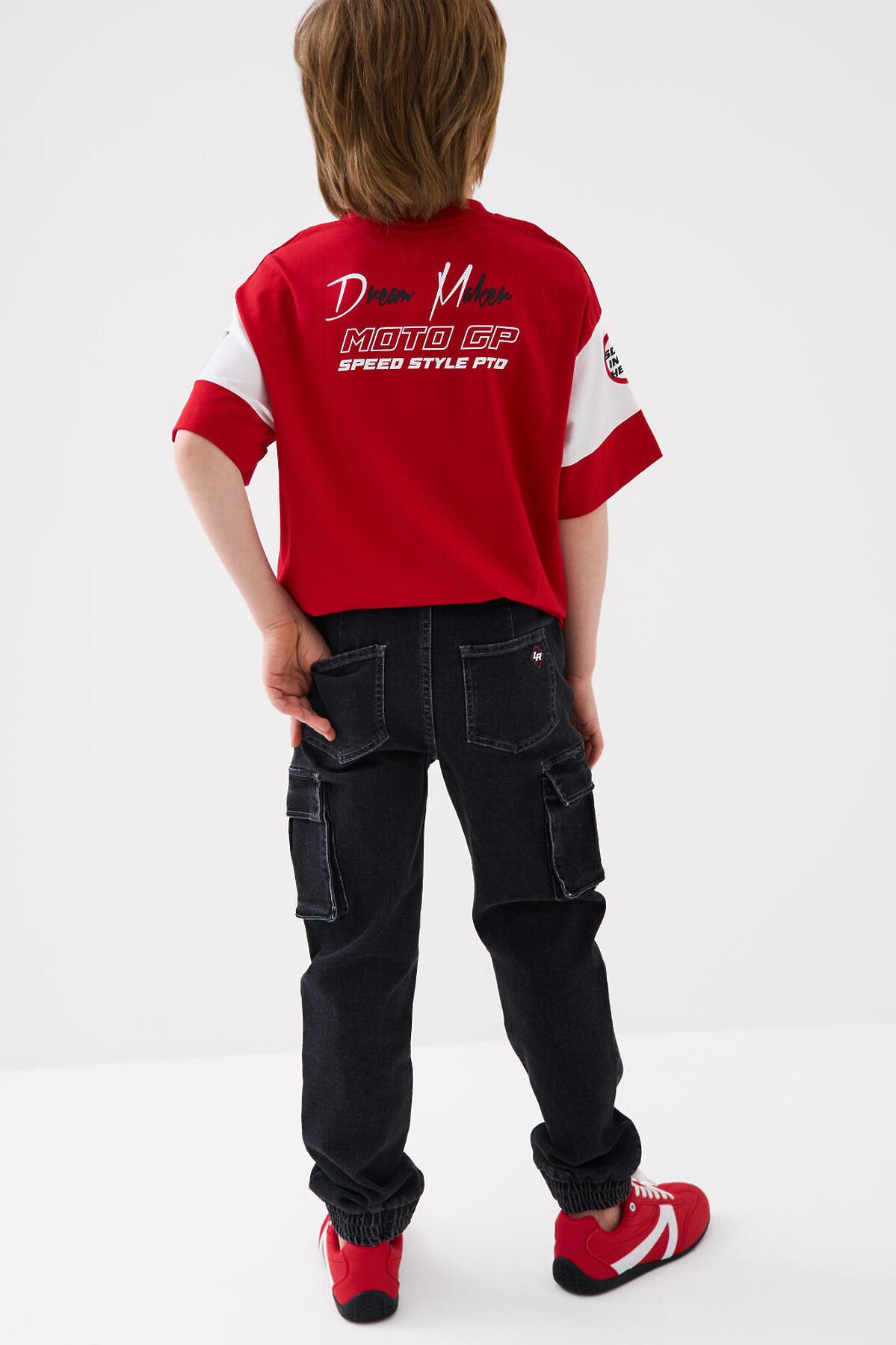 Джинсы-джоггеры для мальчика подростка, выполненные из сверхудобного эластичного материала Loop Denim. Loop denim имеет внешний вид классической джинсы, а по тактильным ощущениям мягкий и комфортный, как трикотаж. Свободный крой с заужением к низу. Пояс на резинке с утягивающим шнурком. Объёмные боковые накладные карманы с клапанами на липучке. Сзади — два накладных кармана. Низ брюк собран на резинку. По брюкам расположены декоративные складки и строчки, имитирующие заломы. На заднем кармане — силиконовая нашивка с логотипом.