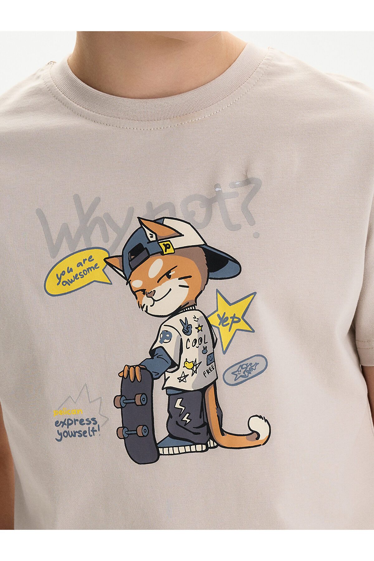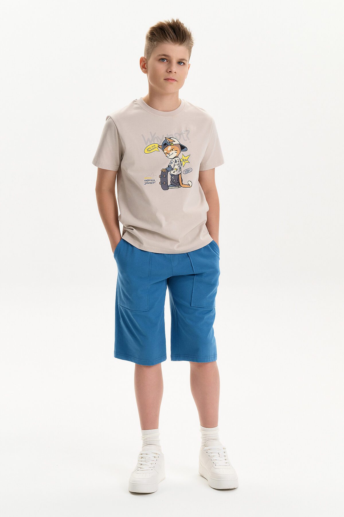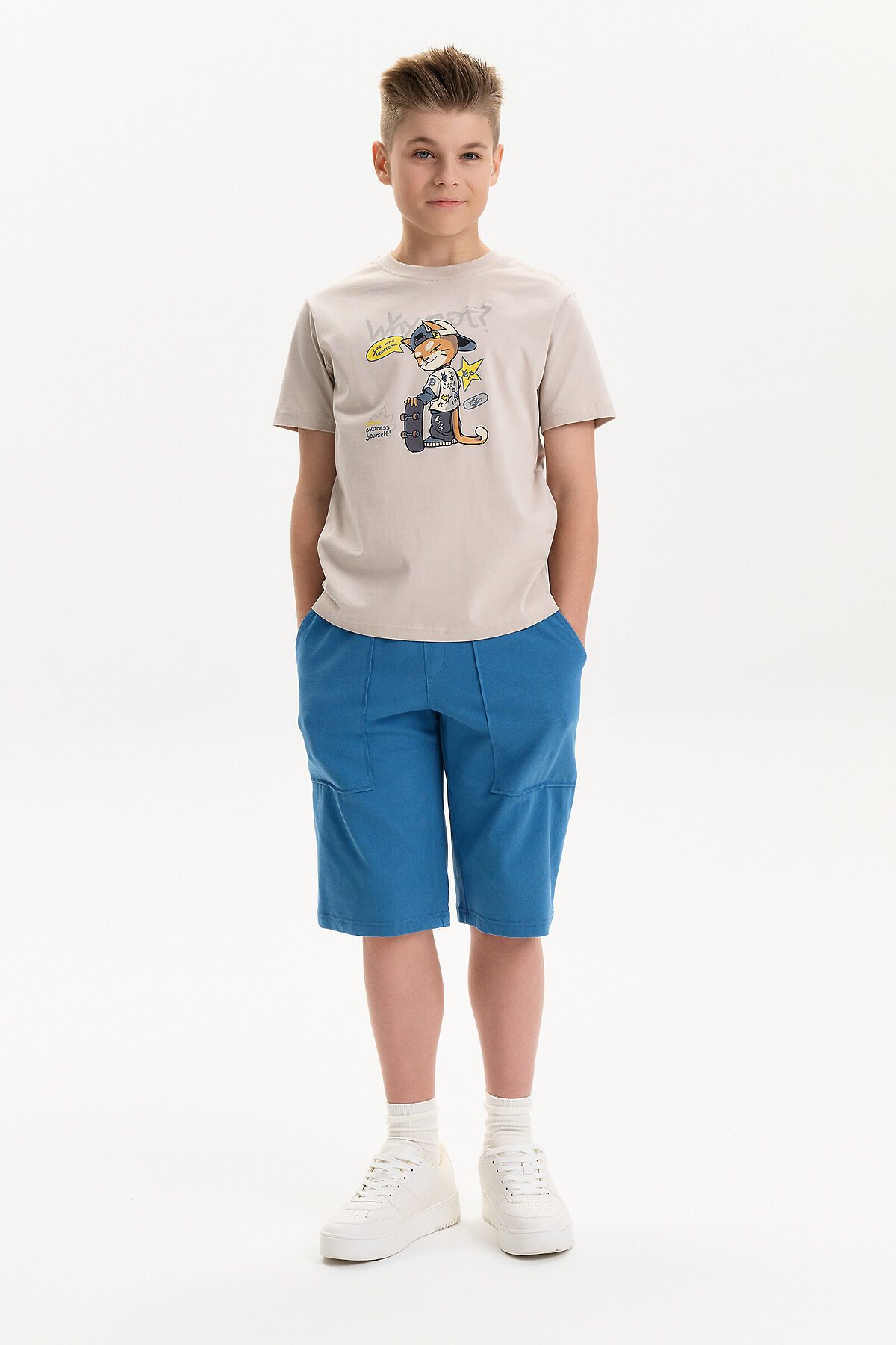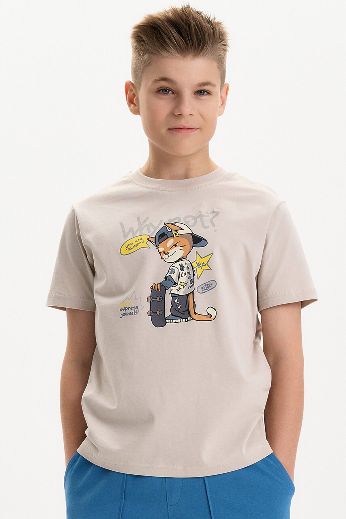 Футболка для мальчика прямого кроя умеренного объема. Уменьшена длина по сравнению с футболками Осень 25. Вырез горловины обработан эластичной рибаной — она прекрасно держит форму, не растягивается, при этом ребёнку удобно надевать и снимать футболку. Футболка с принтом и надписями. Перевод: Why not? - почему бы и нет? you are awesome - ты классный/потрясающий express yourself- Самовыражайся!