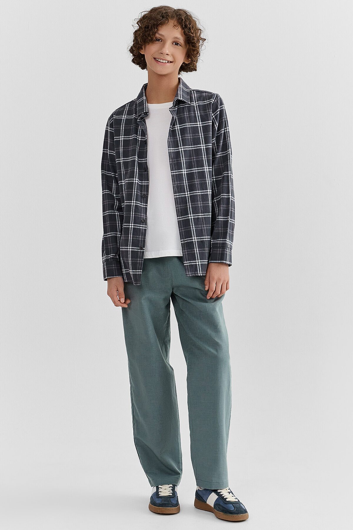 Брюки для мальчиков из ткани. Брюки длинные с классической линией талии. Силуэт прямой, брюки заужены немного к низу. Пояс цельнокроеный. Верхний срез брюк застрочен с эластичной тесьмой. В боковых швах карманы "хулиганы". На внешней стороне пояса пробиты петли, и втянут шнур из основного полотна. Низ брюк обработан швом в подгибку.