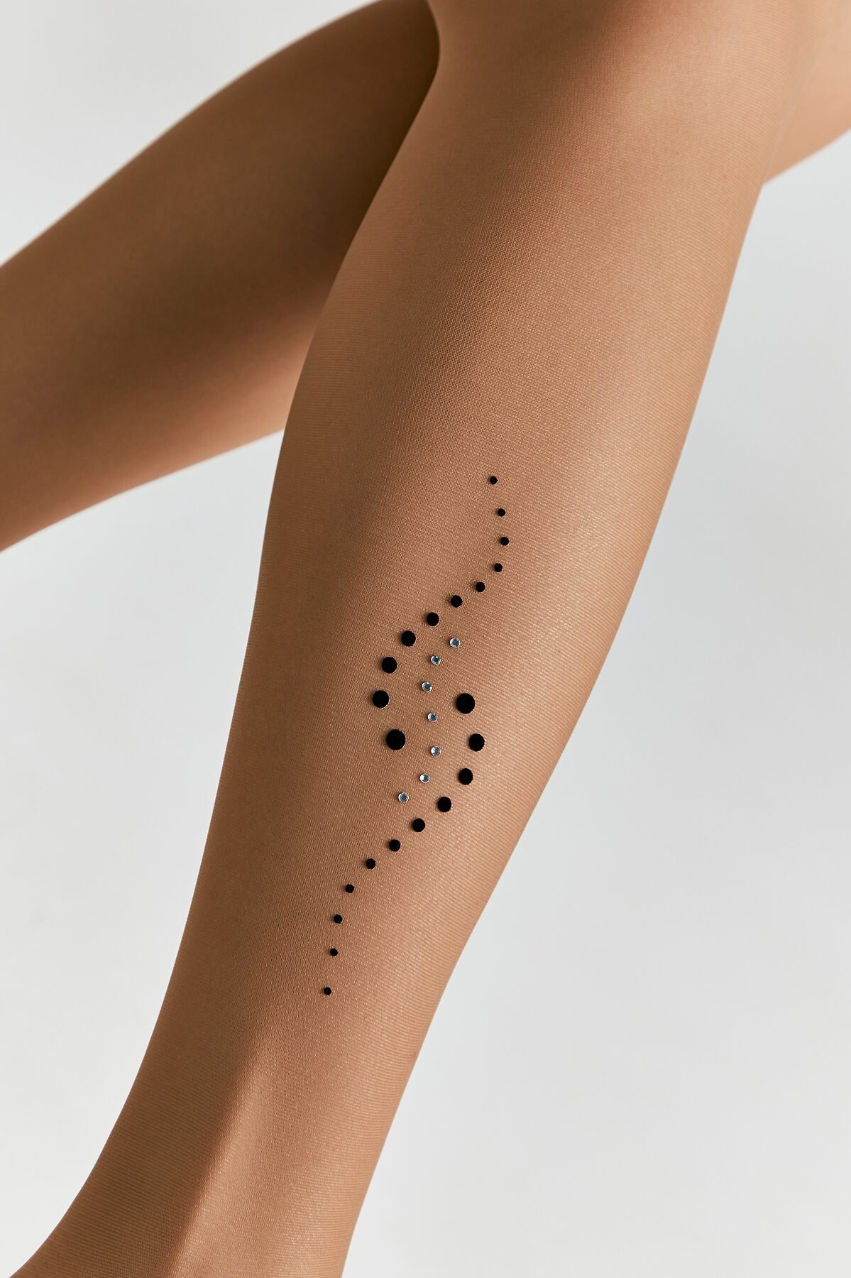 Тонкие эластичные женские колготки 20 ден с усиленным торсом в виде шортиков, с термоаппликацией из флока и страз, расположенной на щиколотке одной ноги, плоский шов, хлопковая ластовица, укрепленный мысок.