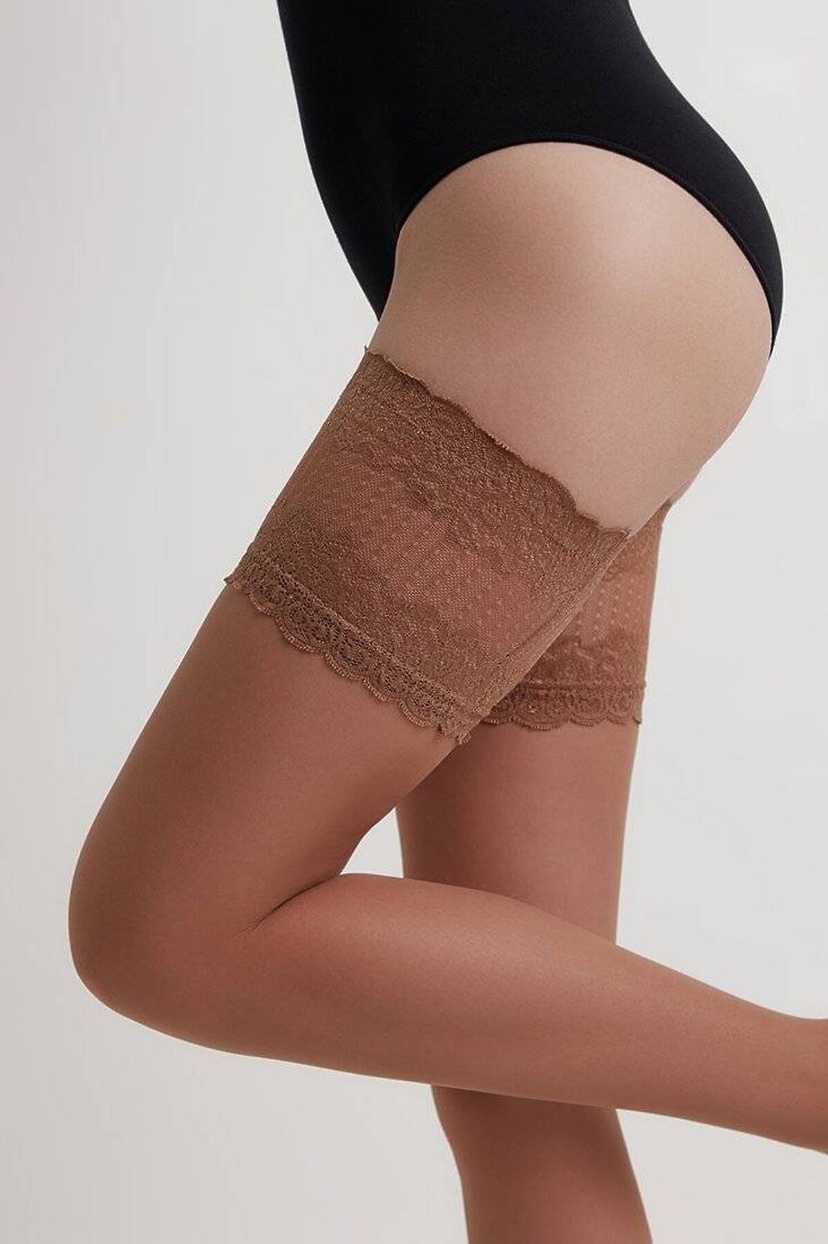 Тонкие эластичные фантазийные чулки 20 ден с широкой кружевной самоподдерживающейся резинкой.