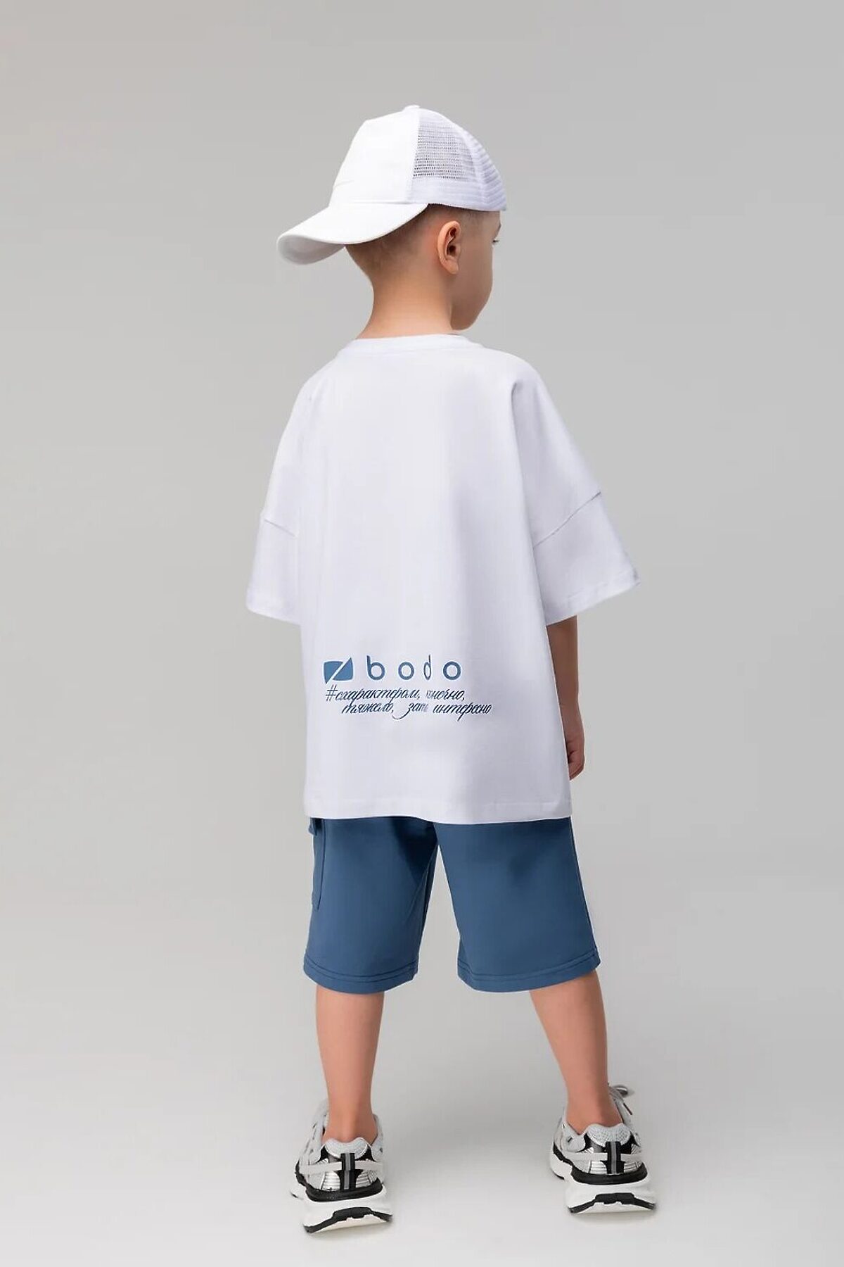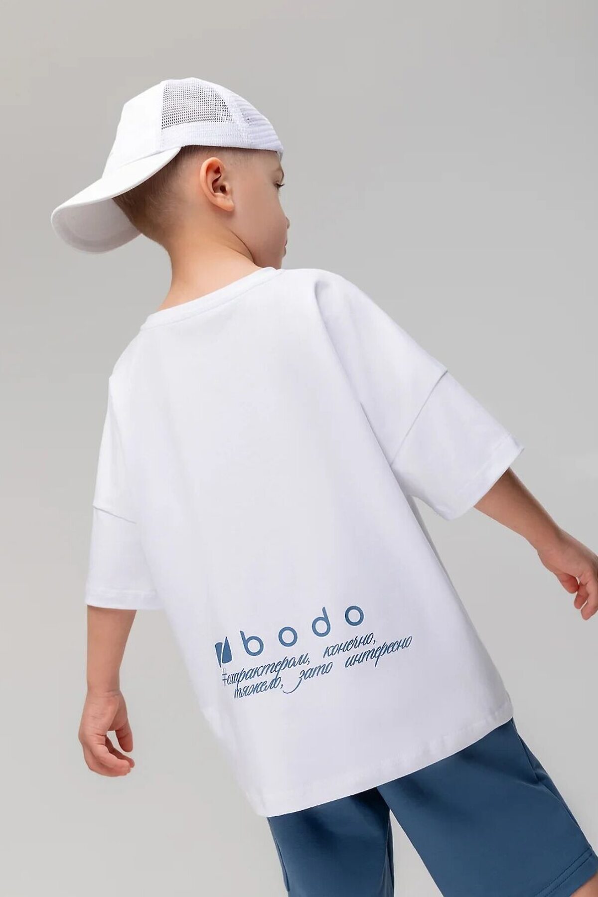 Свободная футболка с коротким рукавом. Горловина футболки округлой формы. Низ изделия прямой. На спинке расположена печать "бодо с характером ,конечно, тяжело, зато интересно"