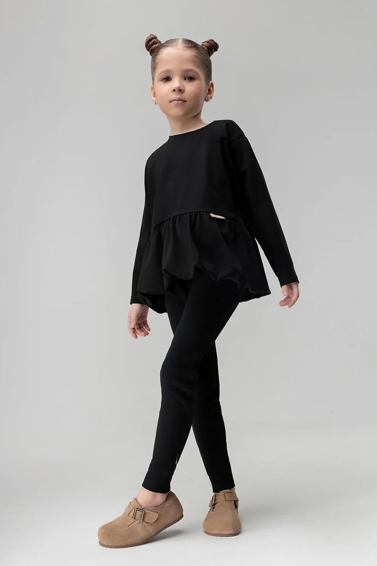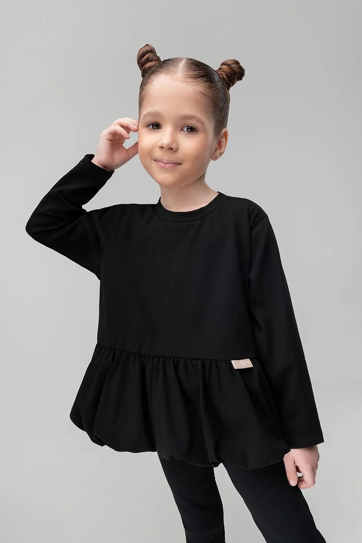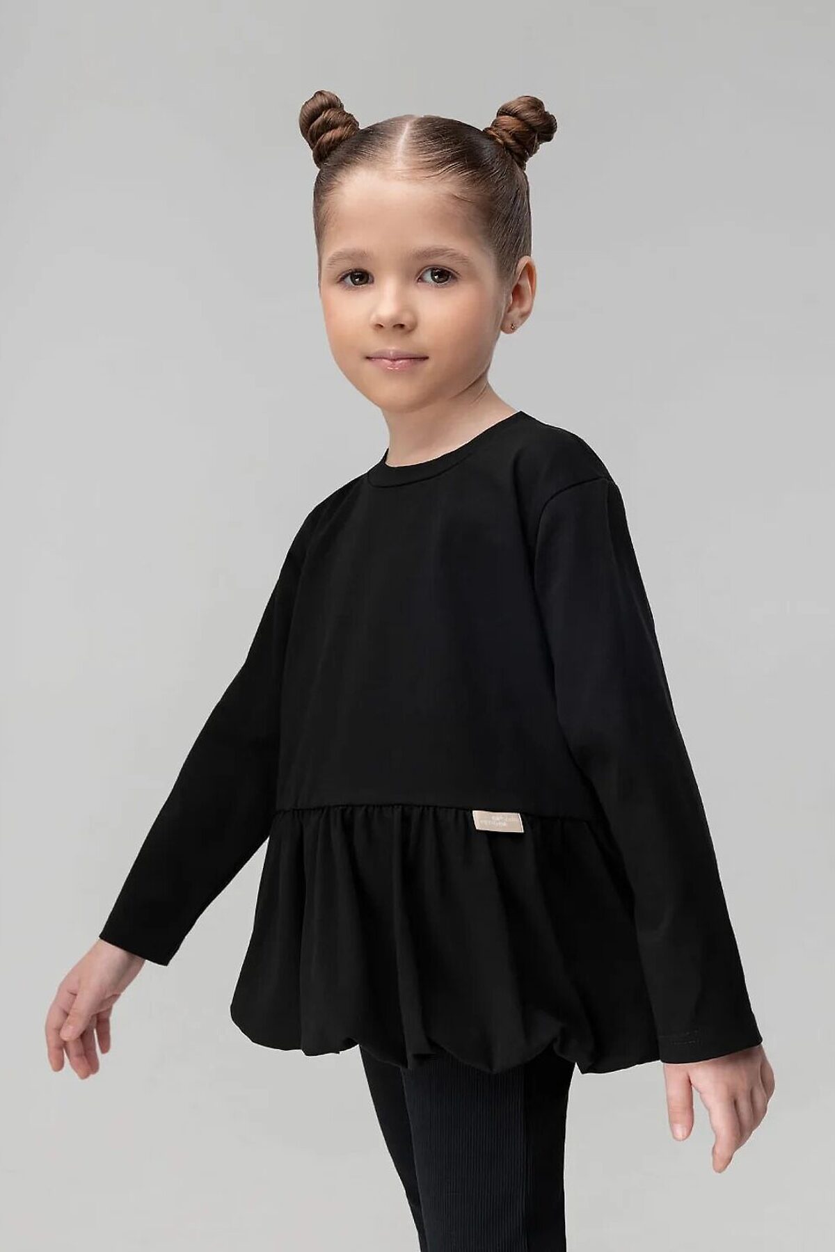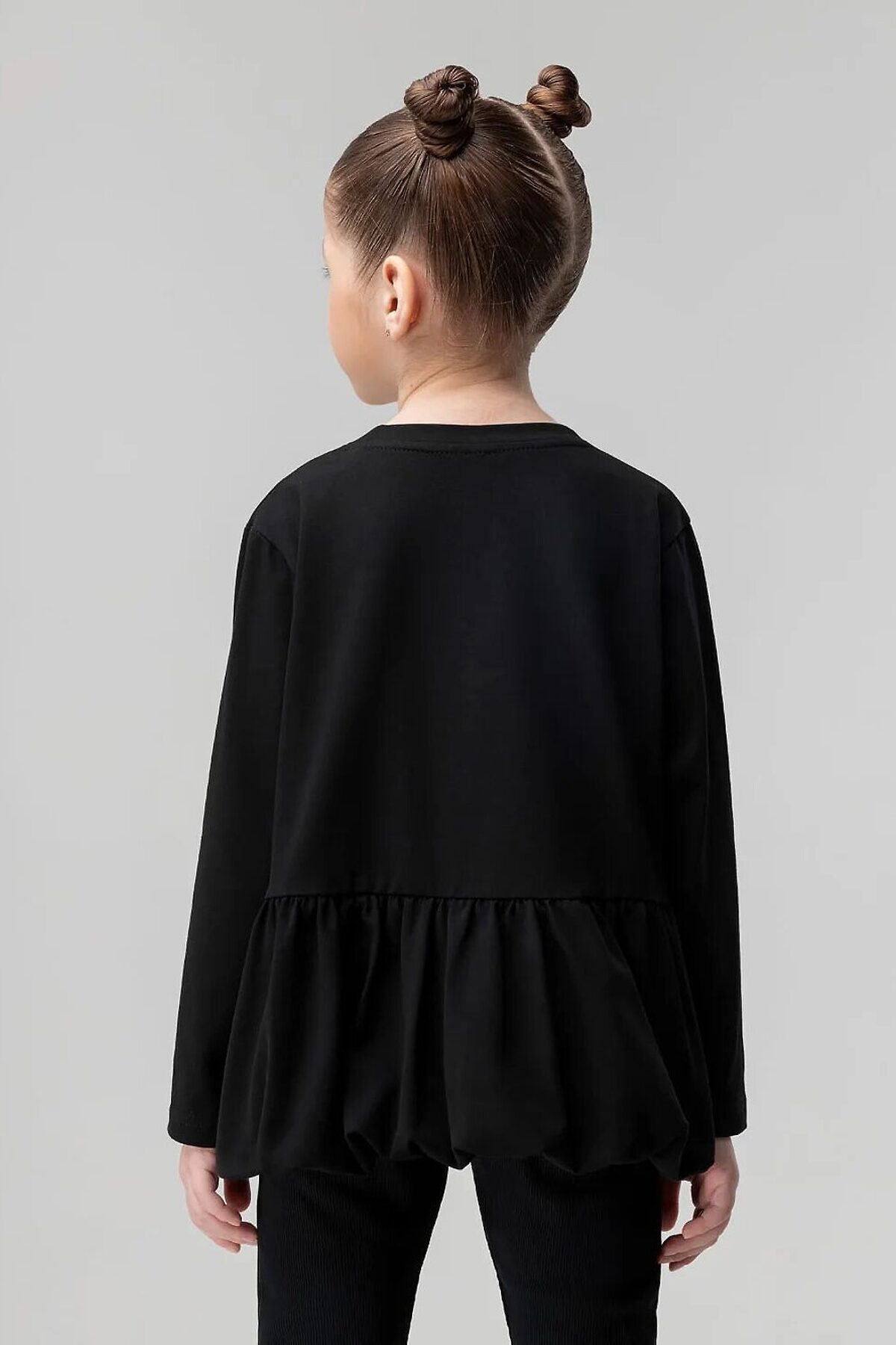 Лонгслив прямого силуэта, с длинным рукавом, горловина округлой формы, низ изделия фонариком со сборкой.
