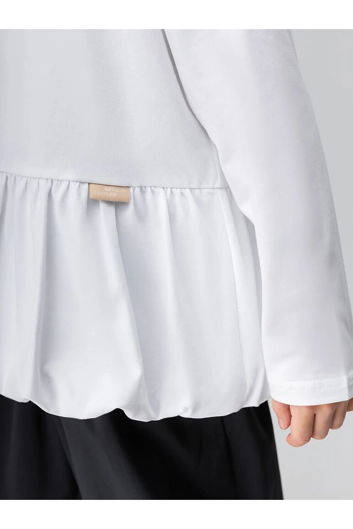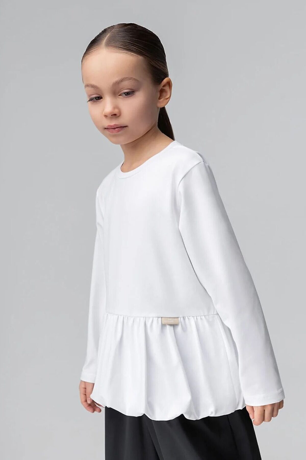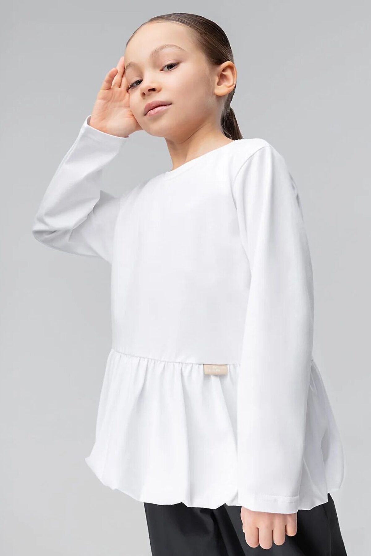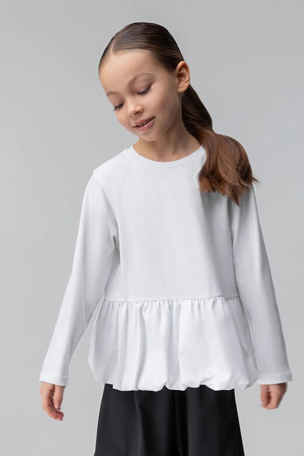 Лонгслив прямого силуэта, с длинным рукавом, горловина округлой формы, низ изделия фонариком со сборкой.