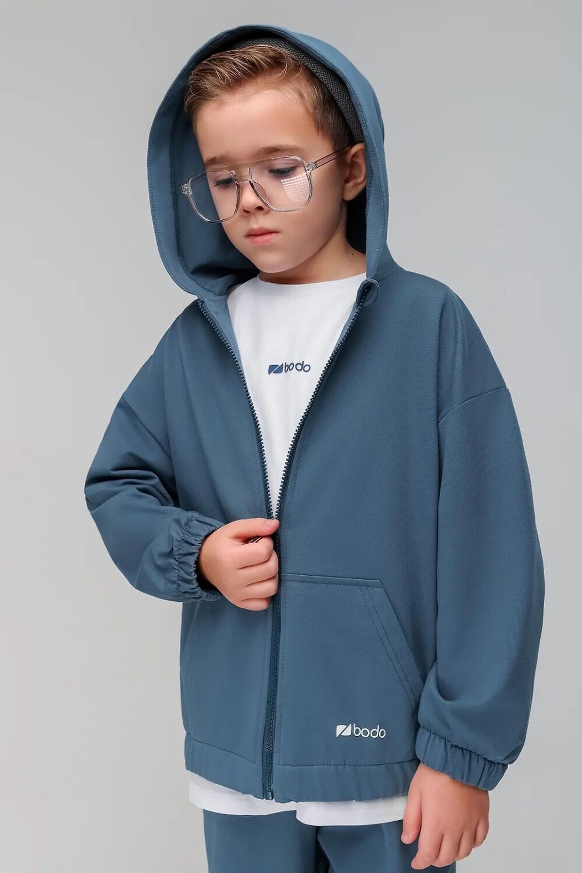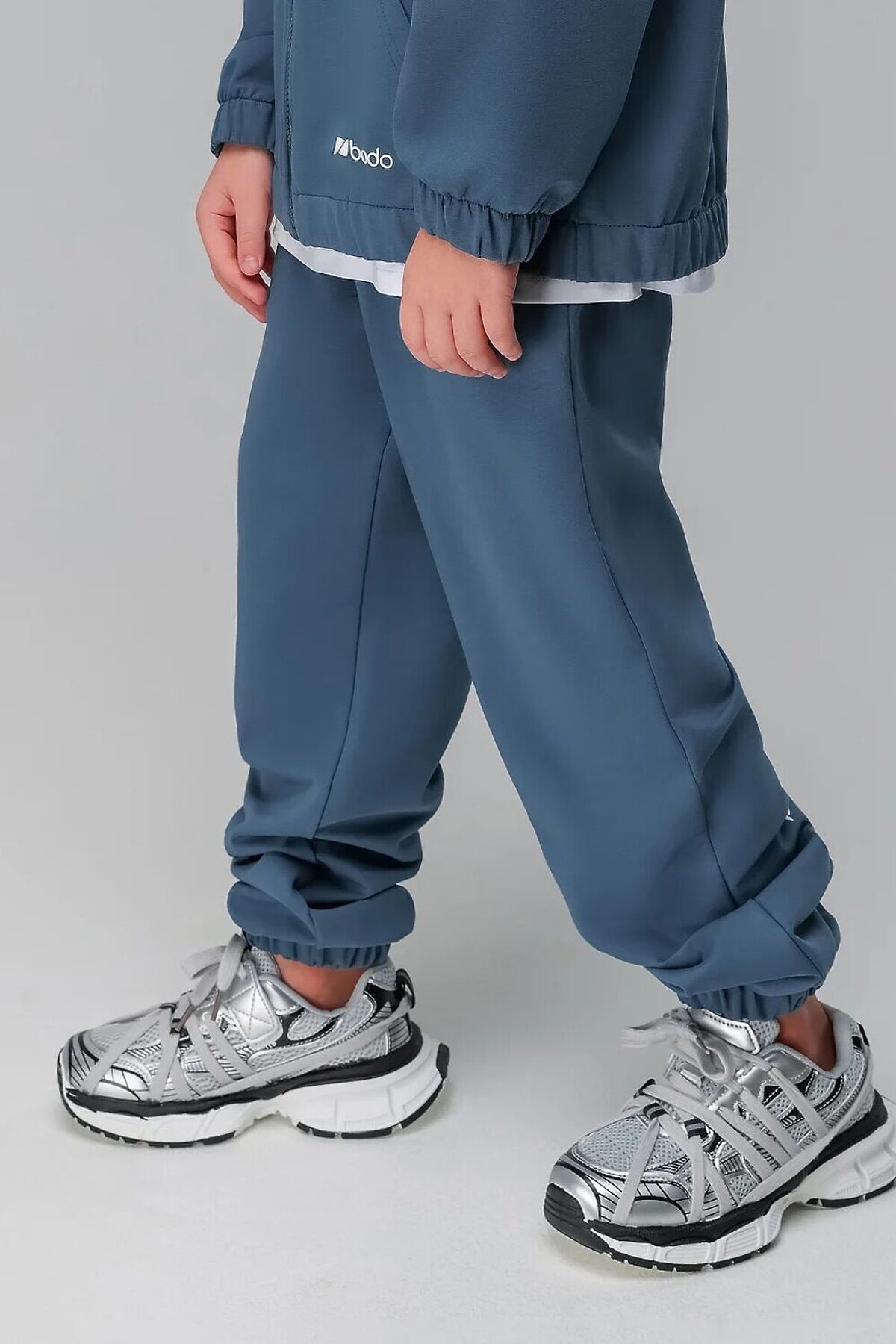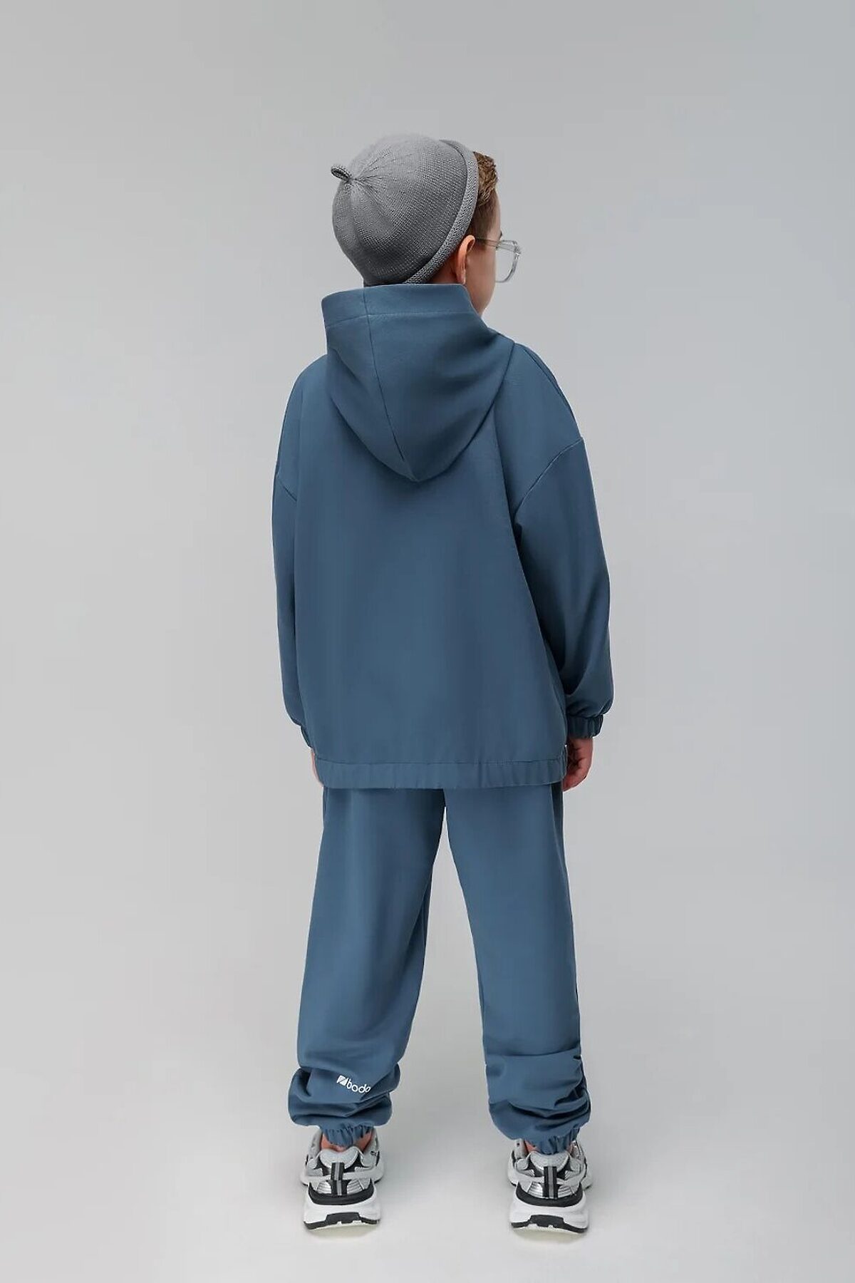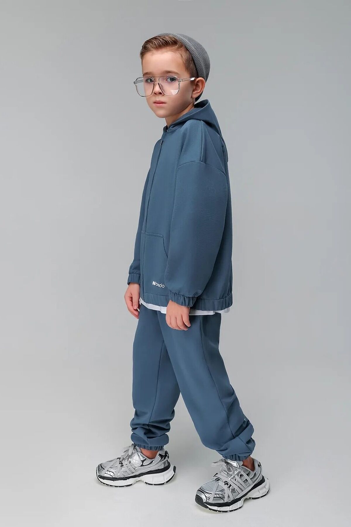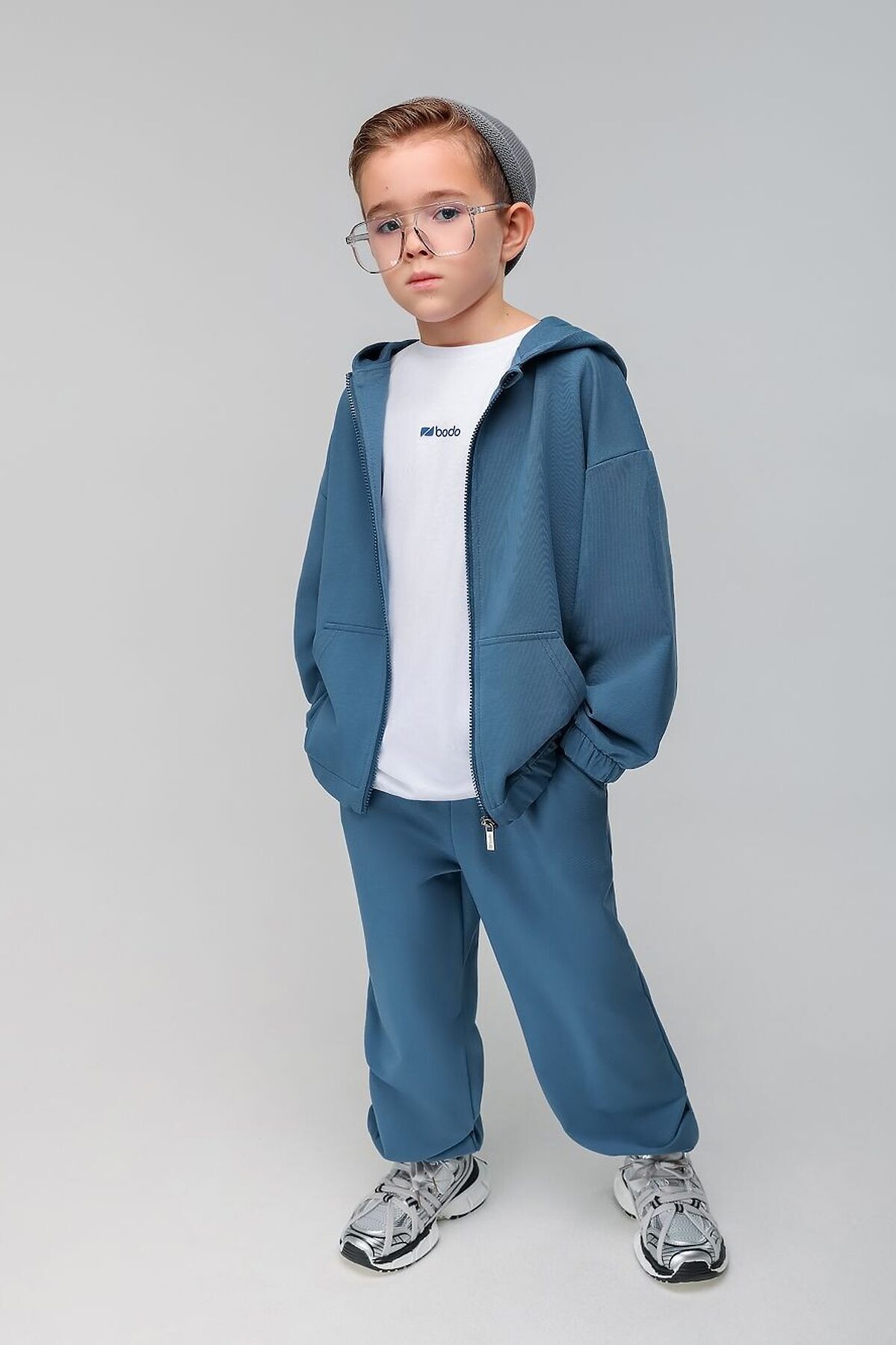 Костюм из ткани пике: свитшот и брюки. Свитшот прямого силуэта, на поясе по низу изделия, с рукавами на манжете, горловина округлой формы. Свободные брюки на поясе с внутренней резинкой. Низ брюк с манжетой на резинке. Брюки с боковыми карманами.