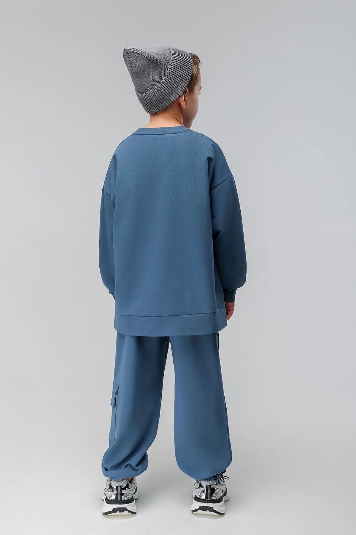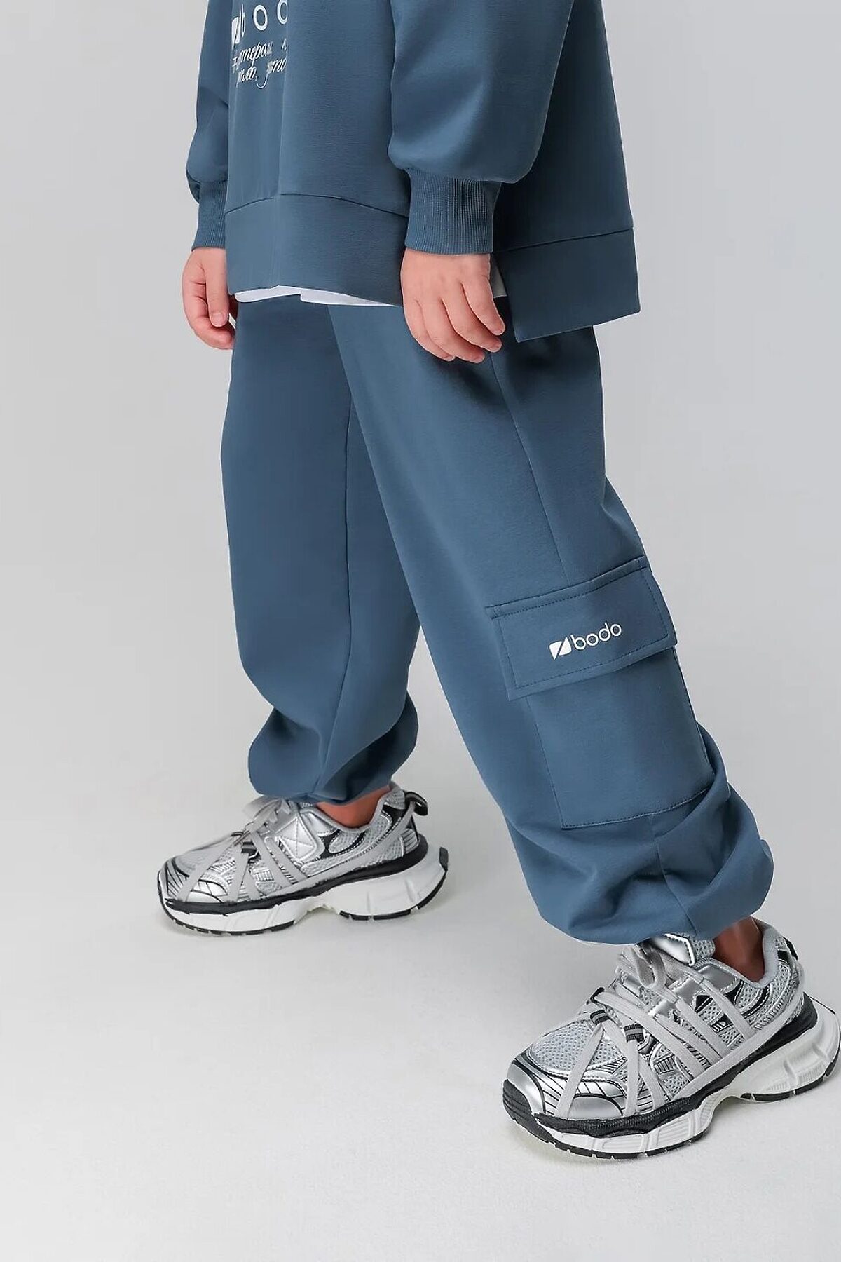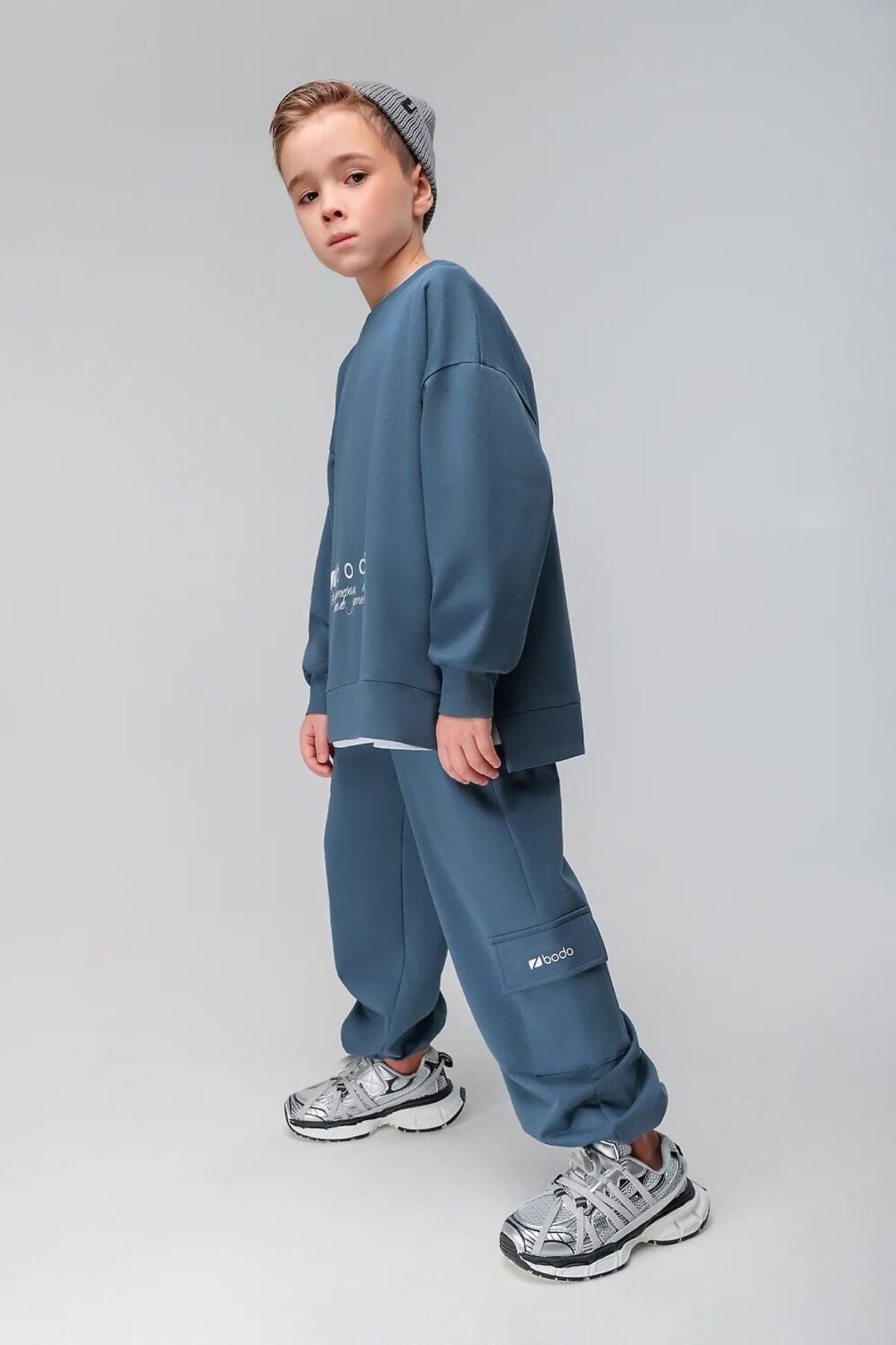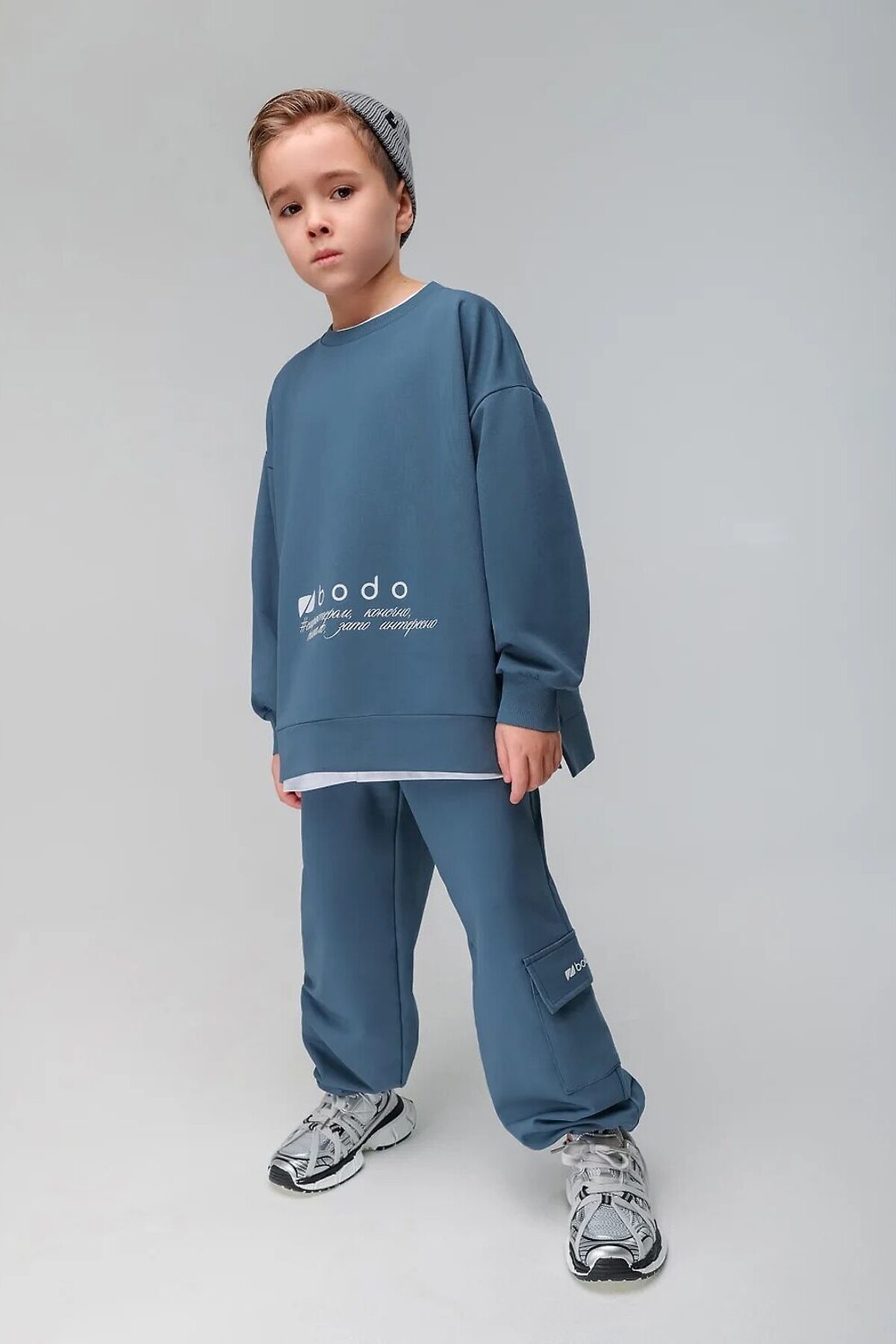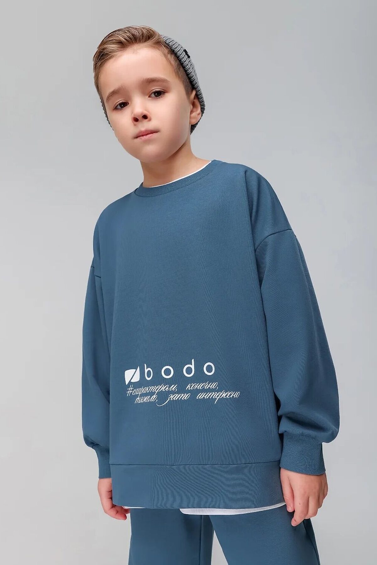 Костюм: свитшот и брюки. Прямая, свободная толстовка с разрезами по бокам. Длинные рукава на манжете. Длина изделия полочки короче длины изделия спинки. Округлая горловина. На полочке принт "бодо с характером". Свободные, прямые брюки на поясе с внутренней резинкой. Брюки с накладными карманами с клапанами по боковым швам, по низу брюк имеется дополнительная резинка с фиксатором для затяжки.