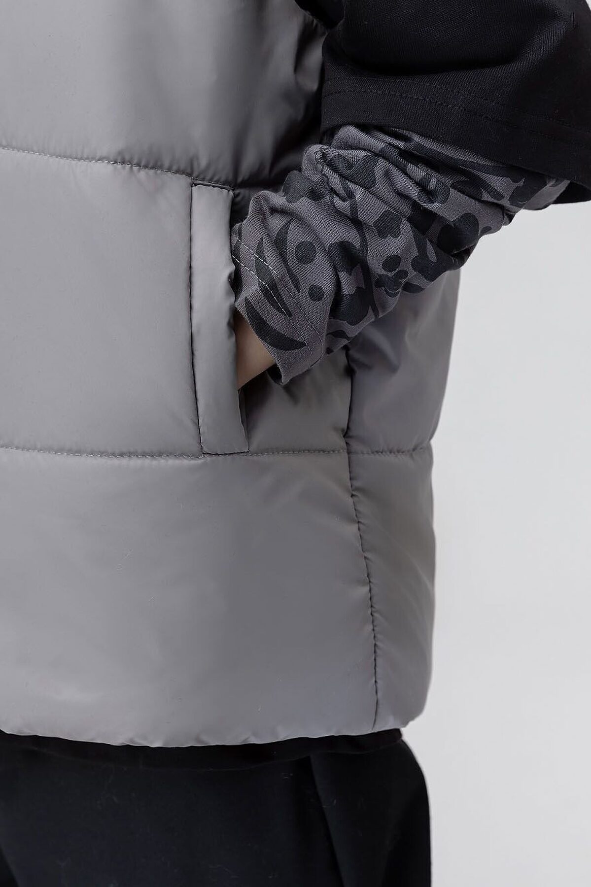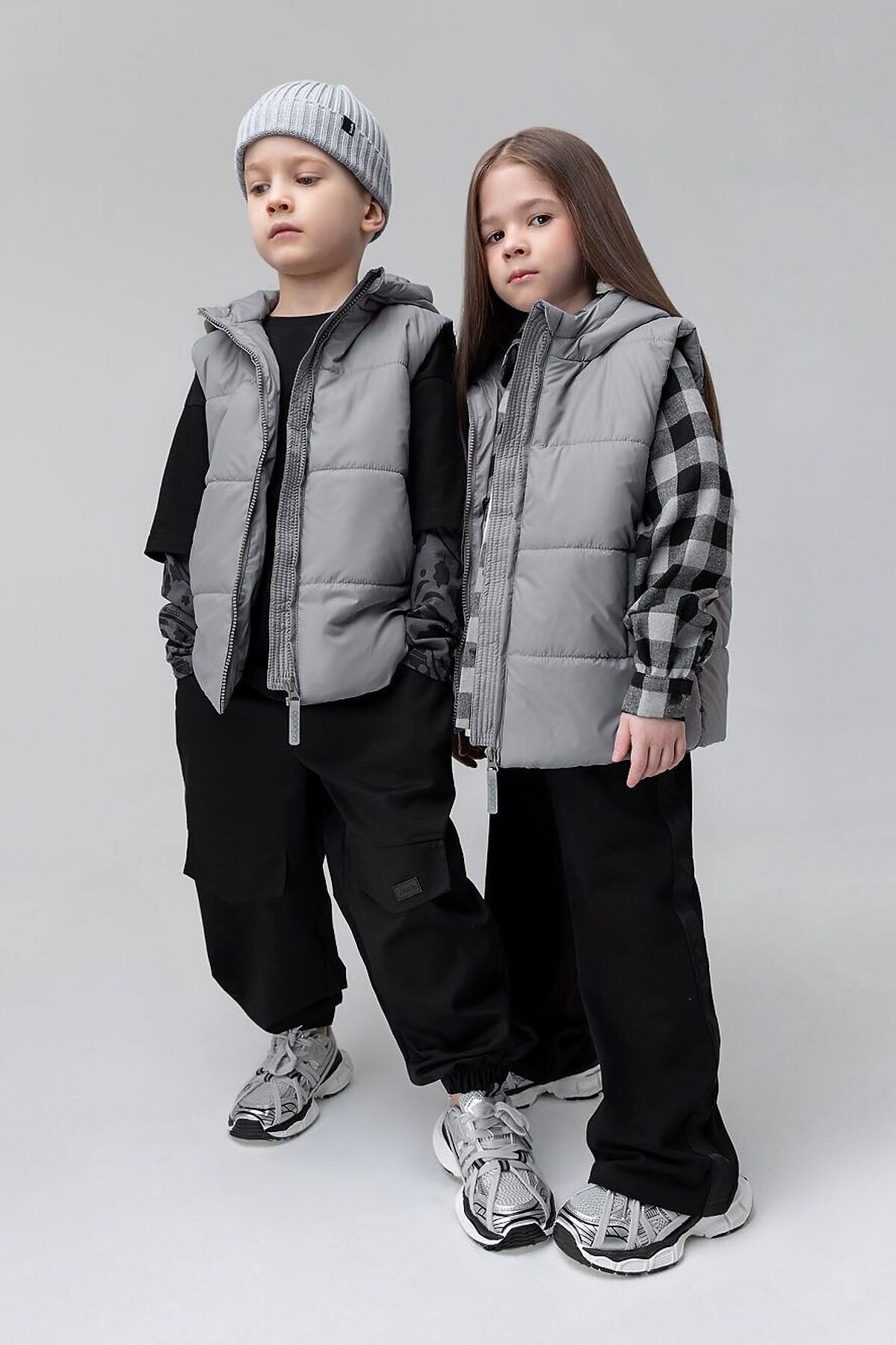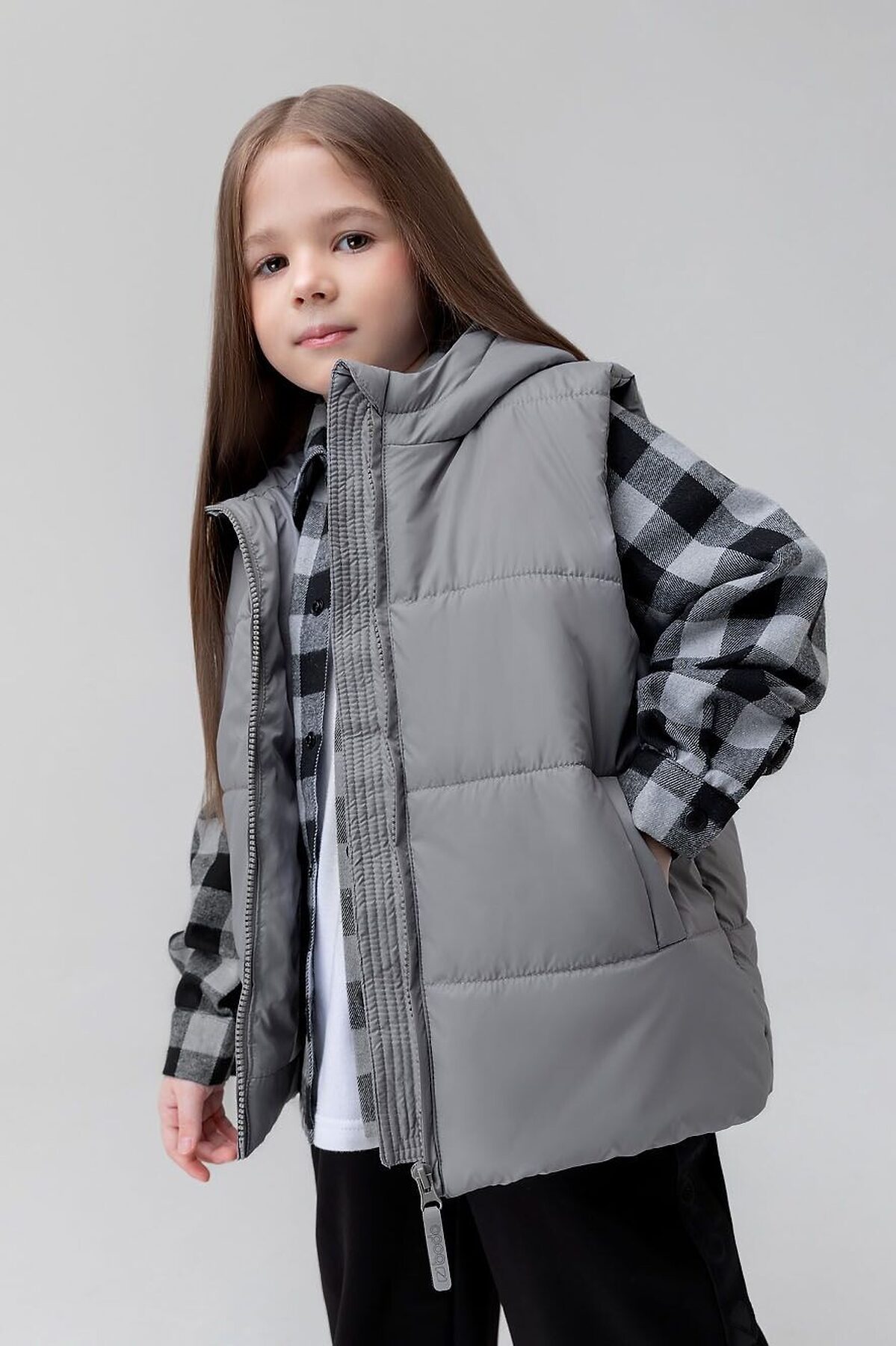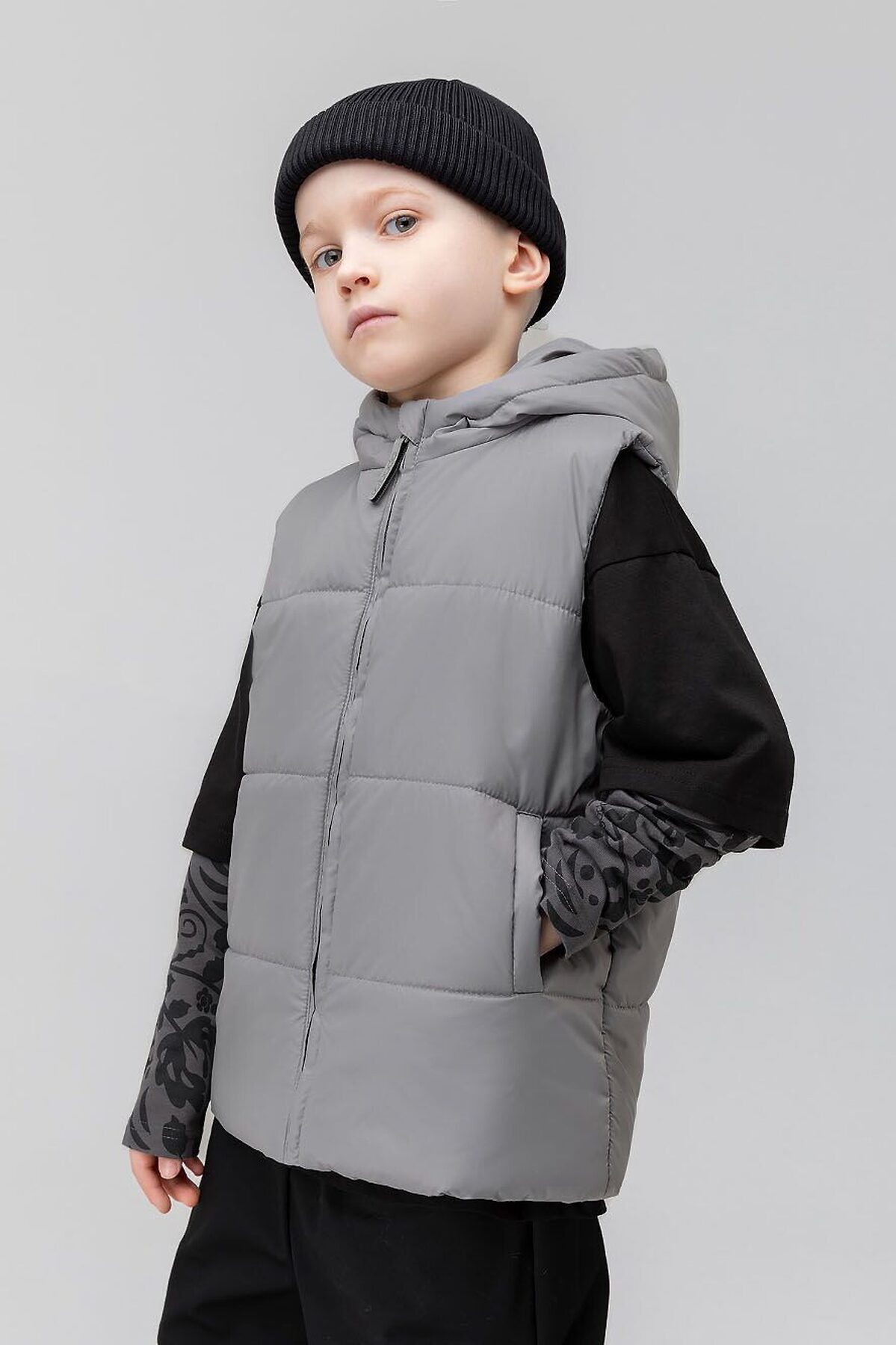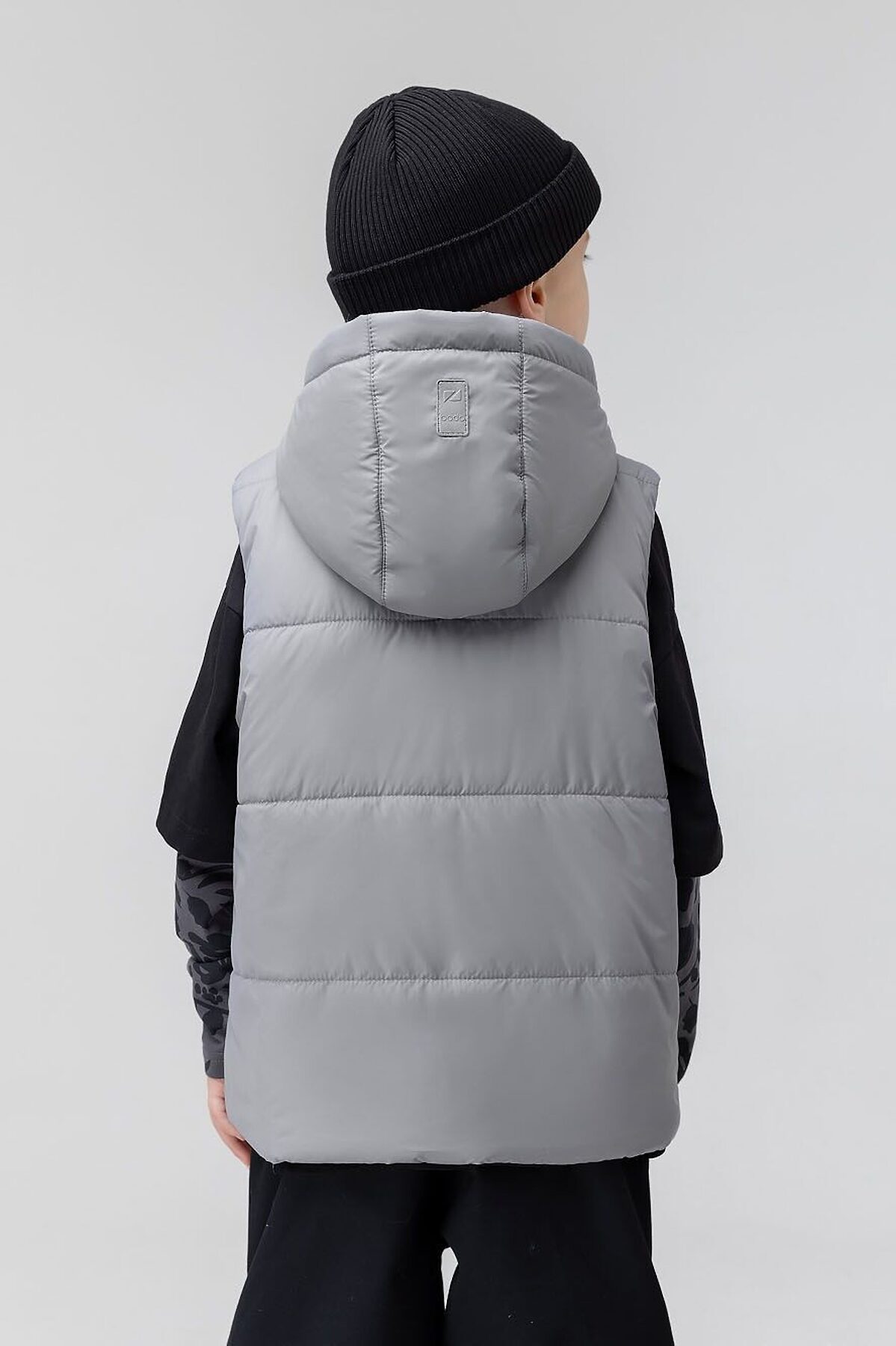 Прямой, утепленный жилет на молнии с капюшоном. Жилет на подкладке. На полочке расположены карманы. Материал верха: курточная ткань 100% полиэстер, плотность 67 г/м.кв., утеплитель 150 г/м.кв. Подкладочный материал кулирная гладь хлопок 100%