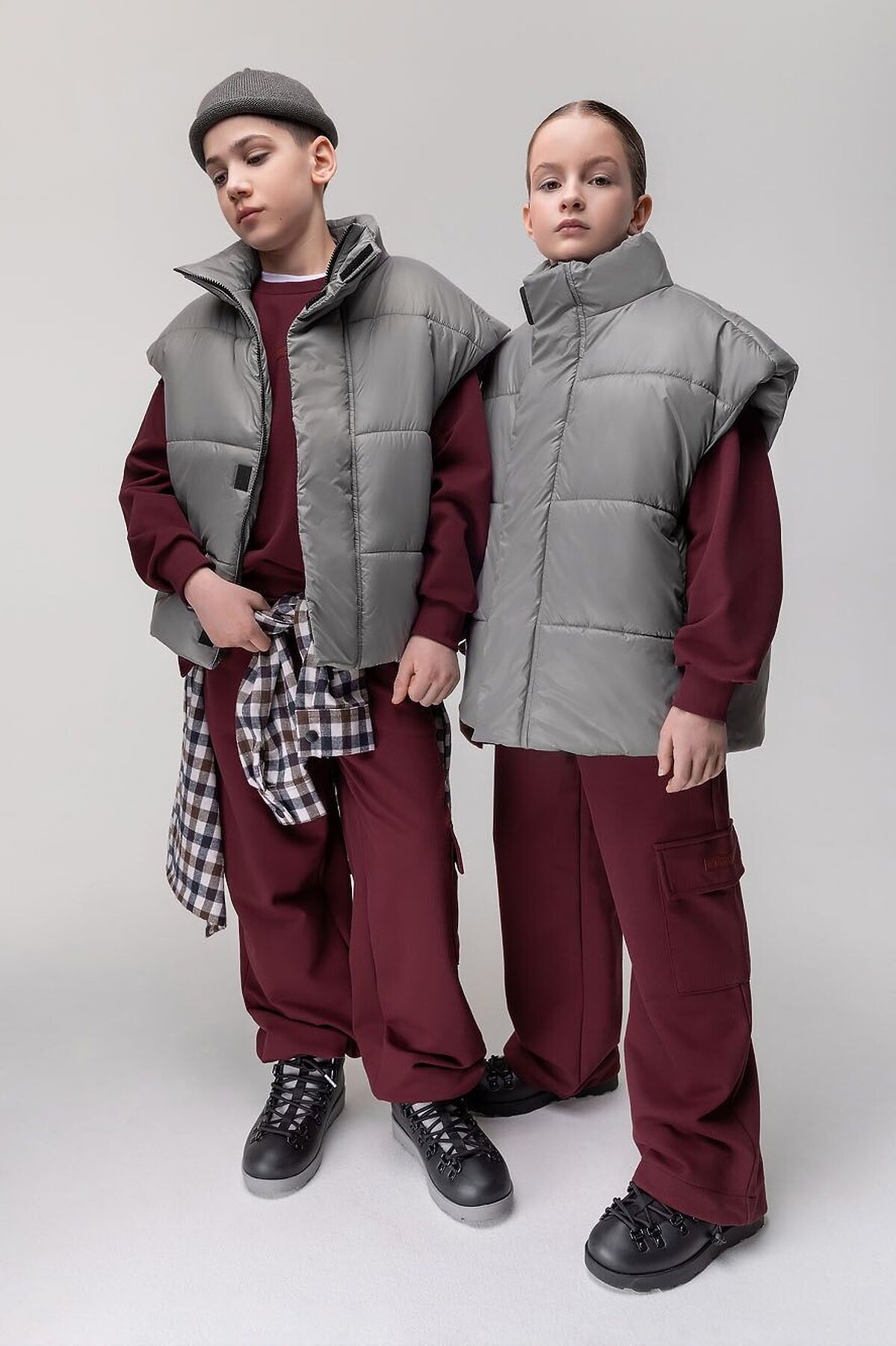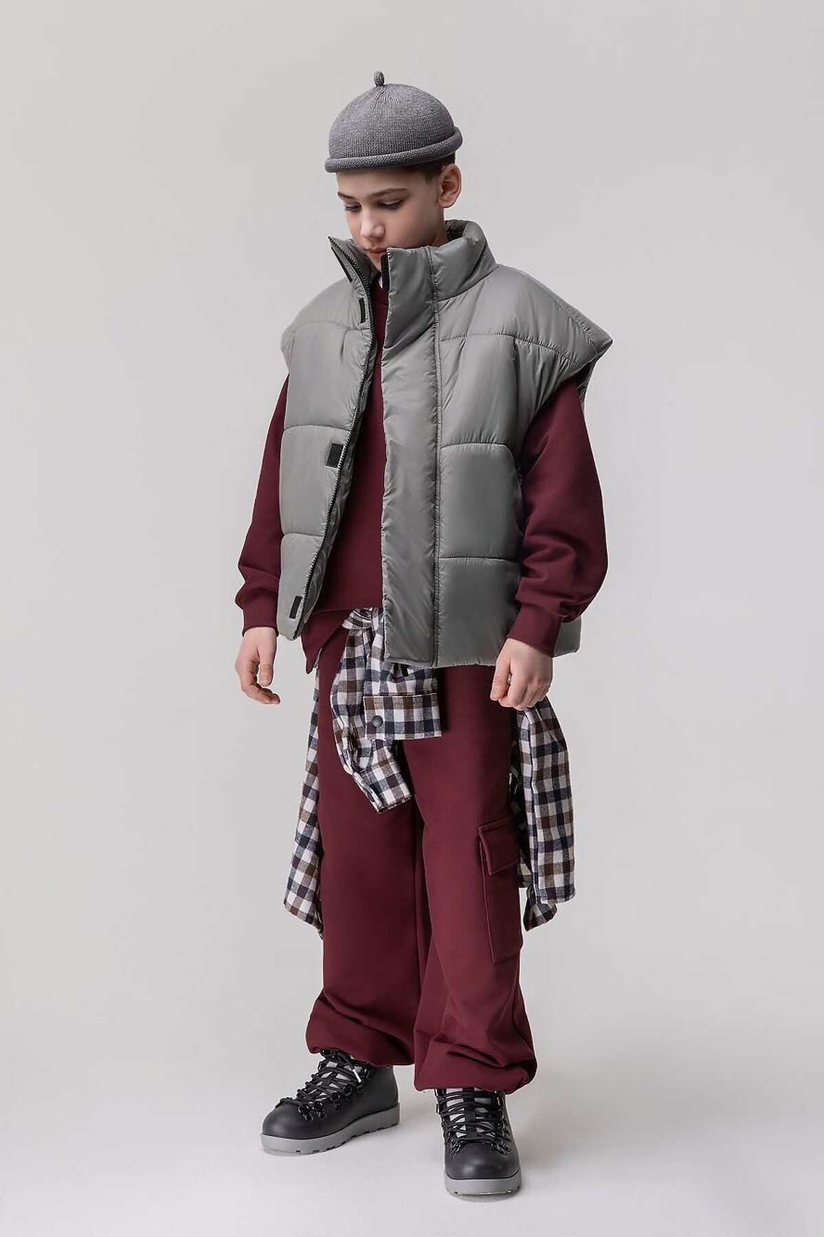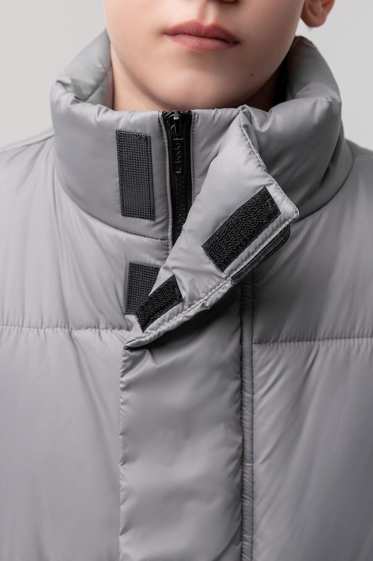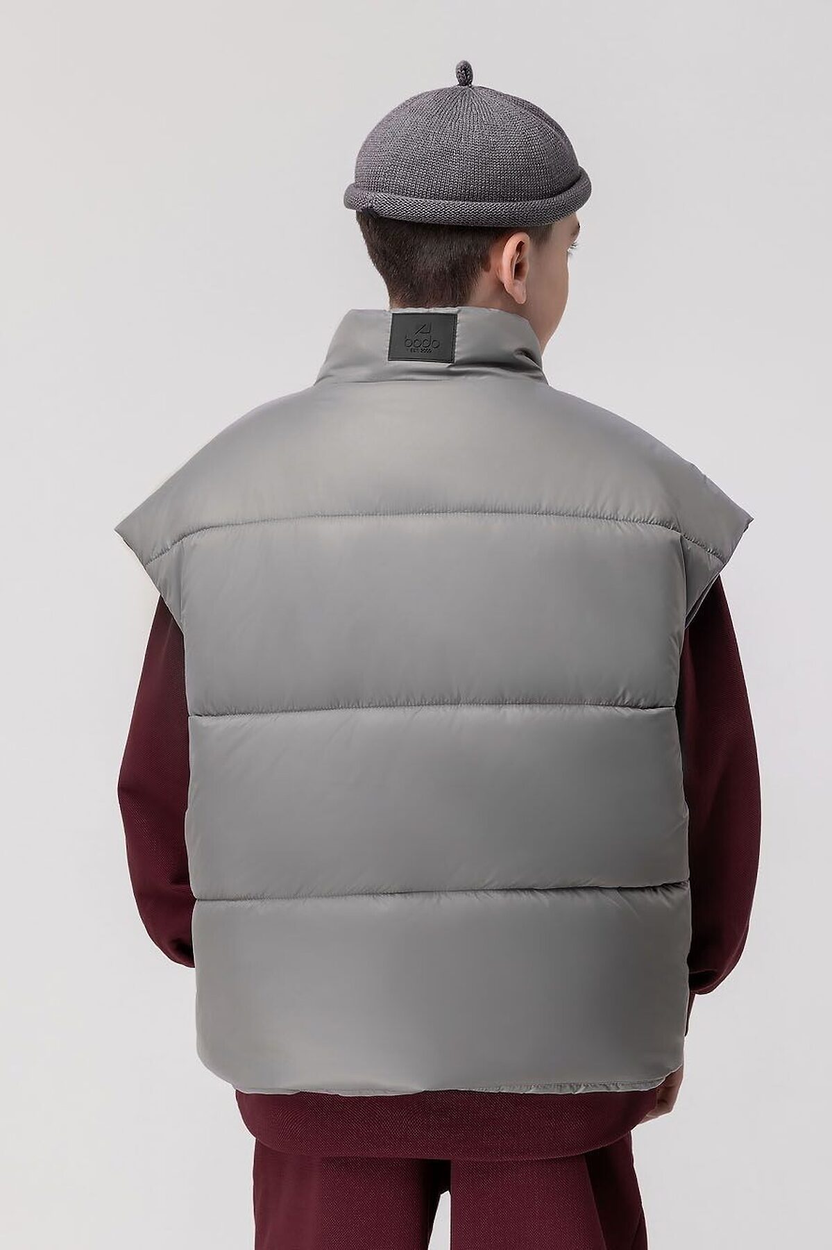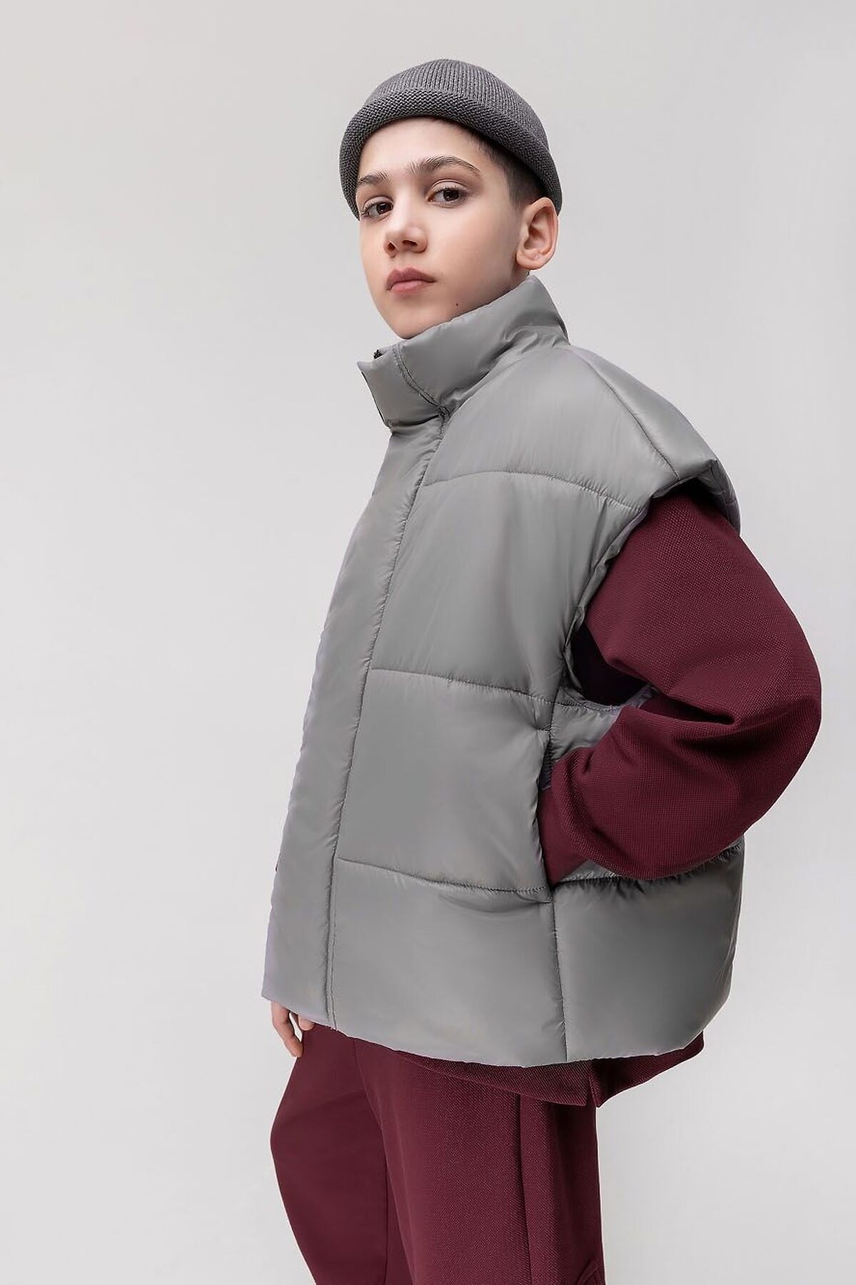 Прямой, утеплённый жилет на подкладке, на молнии с планкой на липучку. Воротник стойка. На полочке расположены карманы. Низ изделия прямой, имеется утяжка. Материал верха: курточная ткань100% полиэстер, плотность 67 г/м., утеплитель 250 г/м.кв. Подкладочный материал кулирная гладь хлопок 100%.