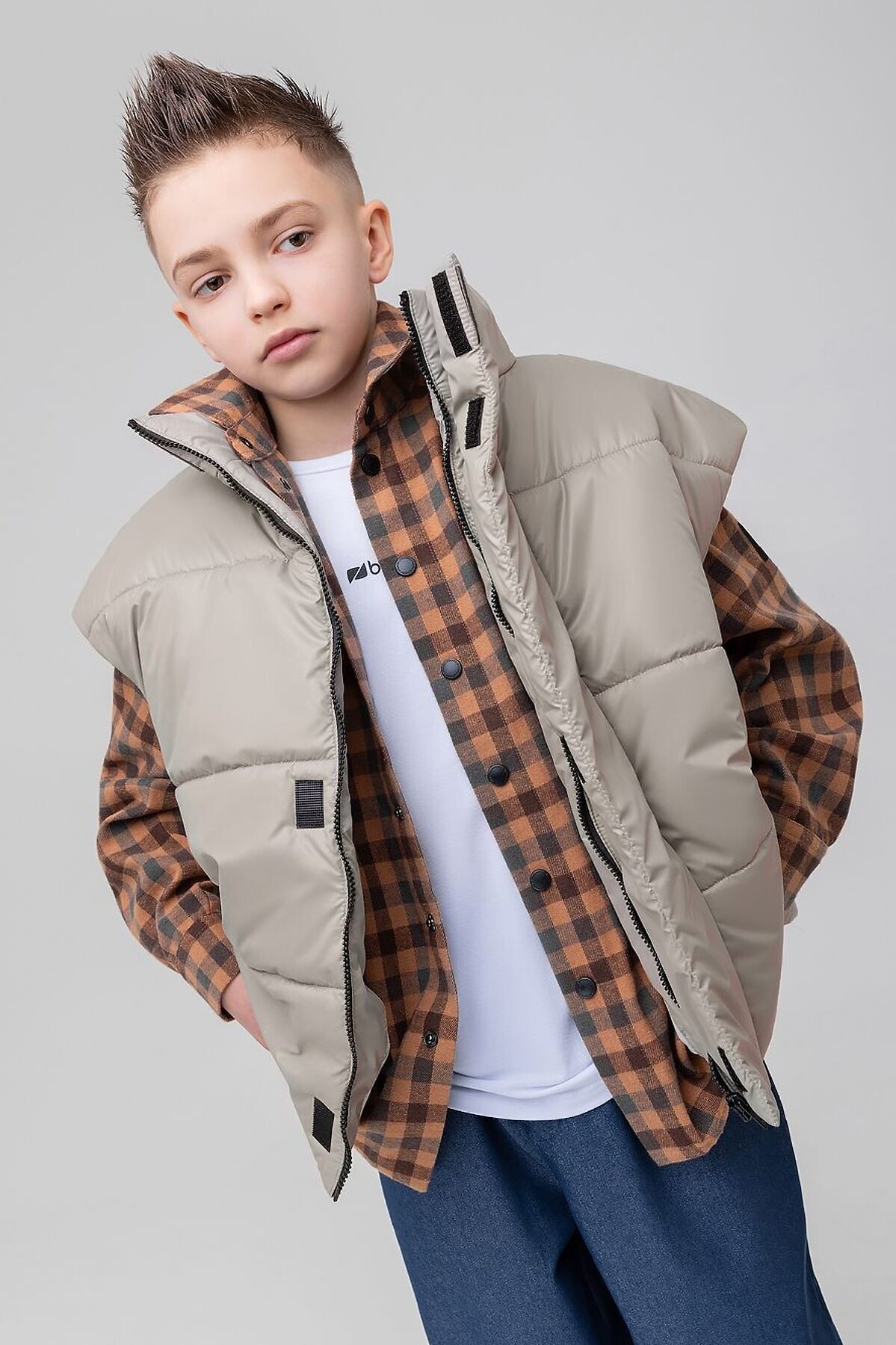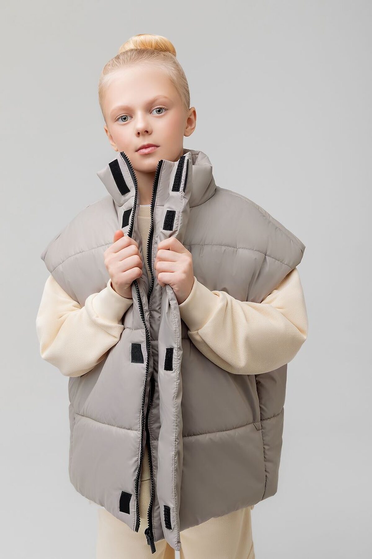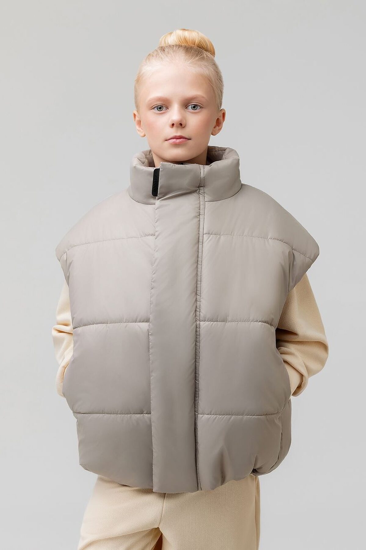 Прямой, утеплённый жилет на подкладке, на молнии с планкой на липучку. Воротник стойка. На полочке расположены карманы. Низ изделия прямой, имеется утяжка. Материал верха: курточная ткань100% полиэстер, плотность 67 г/м., утеплитель 250 г/м.кв. Подкладочный материал кулирная гладь хлопок 100%.
